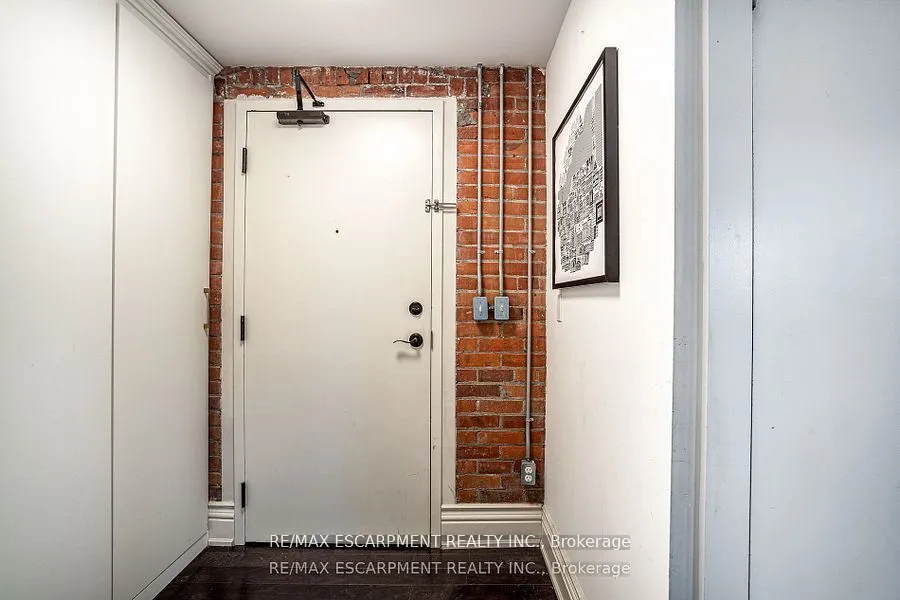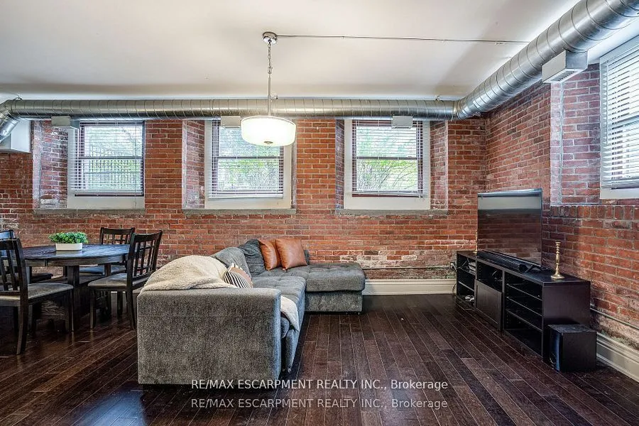 Discover a truly distinctive opportunity at the historic Stinson Lofts, where old-world character and modern comfort converge. This rare main-floor corner unit offers exceptional value for its generous square footage, highlighted by a remarkable 28 x 12 private patio with sweeping views of the community playground and the lush Hamilton escarpment. Inside, soaring ceilings, exposed brick walls, and rich hardwood floors preserve the timeless charm of the 1894 Stinson School, while an airy open-concept design provides a bright and inviting flow. The stylish kitchen features quartz counters with a breakfast bar, stainless steel appliances, and in-suite laundry, seamlessly opening to spacious living and dining areas ideal for entertaining. This unique layout features 2 primary suites, the first with dual closets and a modern three-piece bath. The second private suite has its own entrance off the dining area through french doors, with a large versatile accessway that is perfect for an office or extra storage. Believed to have once been the kindergarten classrooms of the original school, this spacious suite includes built-in shelving and a fall bathroom. It’s time to move into this one-of-a-kind residence that offers a rare blend of heritage elegance, modern functionality, and unbeatable value. Includes one exclusive parking spot, P21.