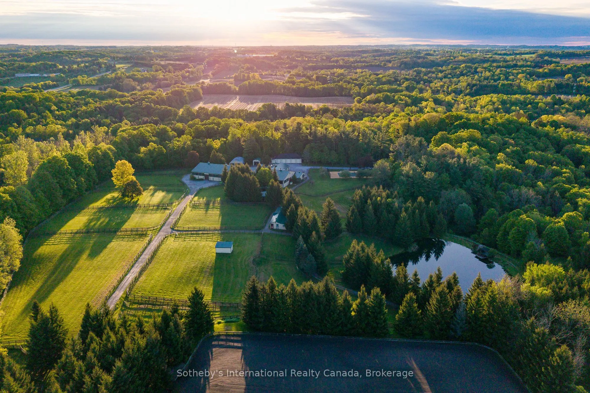 Family Compound; equestrian business; retreat; live and lease. So many options for one of the finest equestrian estates in Ontario’s renowned King Township; without question a premier community in the horse world. Wingberry Farms spans 75 acres of scenic, rolling land with open paddocks, mature forest, and private trails that lead past a stunning pond with waterfalls and up to the most enchanting hilltop log cabin where you can enjoy sweeping sunrise and sunset views. All of this only 45 minutes north of Toronto. The property includes three distinct homes: 1: The gate house (a newly built custom residence (2018) with 4+2 bedrooms and 7 bathrooms, nanny suite, oversized decks and private forested backyard with hot tub and fire pit, open concept living with a gym & theatre downstairs; 2: The main house-a timeless traditional with 4 bedrooms, multiple outdoor siting areas and outdoor kitchen, spectacular great room and indoor pool and spa amenities (2019), detached garage with apartment above; 3: A well-kept guest house with 4 bedrooms and a staff apartment below offering flexible space extended family, or rental income. Whether you’re an avid equestrian, investor, or both this property delivers. Equestrian infrastructure is top-tier: a 26-stall main barn, an additional 6-stall stable, Olympic style, heated indoor arena, sand ring, and grass grand prix ring with cross-country elements. Gorgeous trails lead you through the forest to a river and ponds. Multiple paddocks (three with run-in shelters) offer varied turn out options, while equipment and vehicle storage is more than covered, with a 5-bay garage and two large heated workshops discreetly positioned on the property. Private, yet ideally located, Wingberry Farms is a strategic acquisition in a region where large parcels are increasingly rare. Designated village reserve lands make this an interesting prospective land banking opportunity.