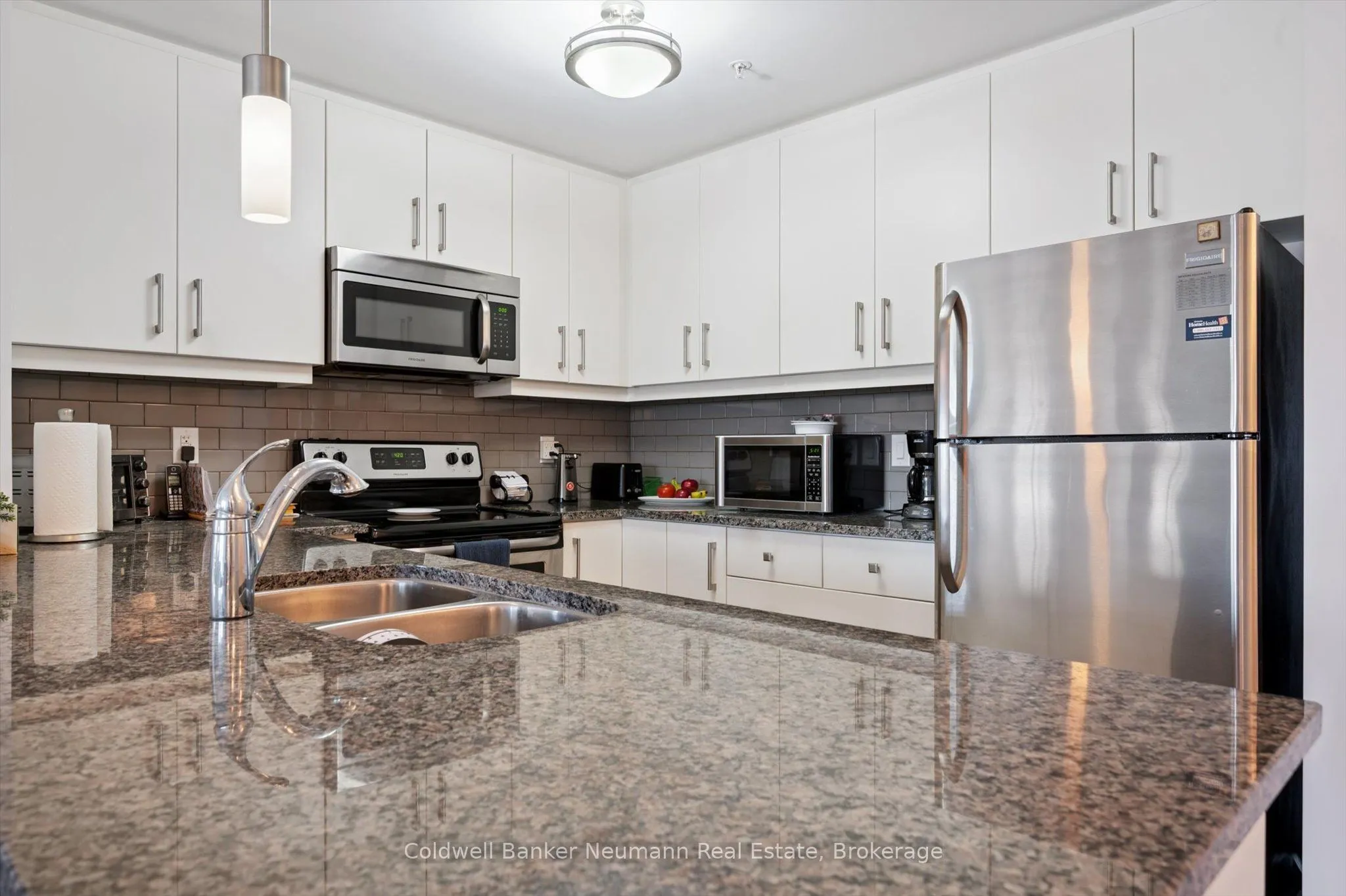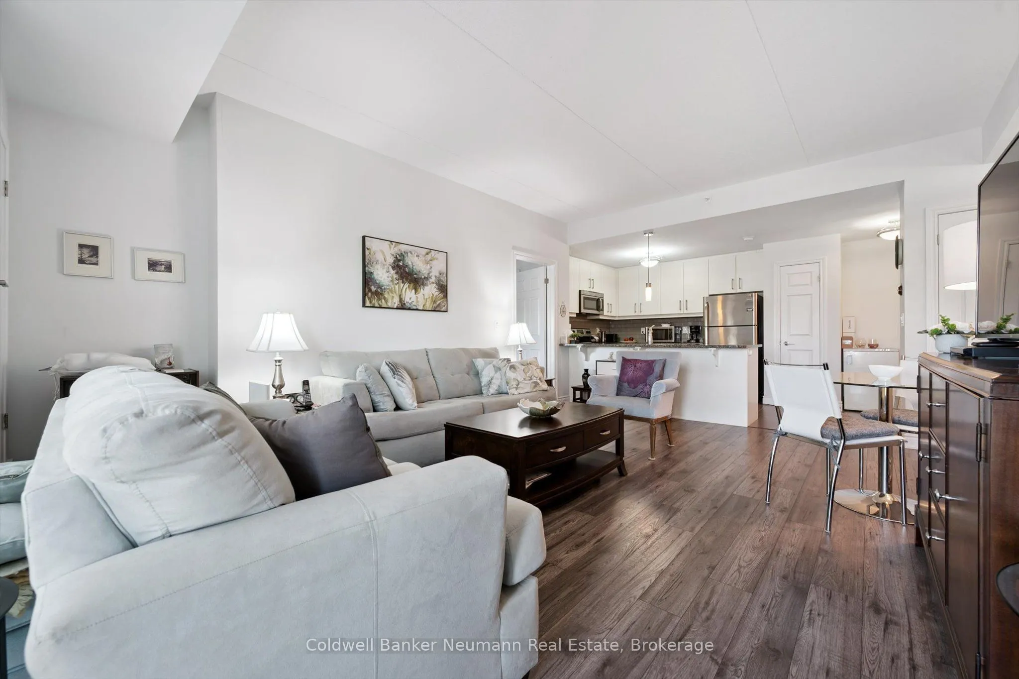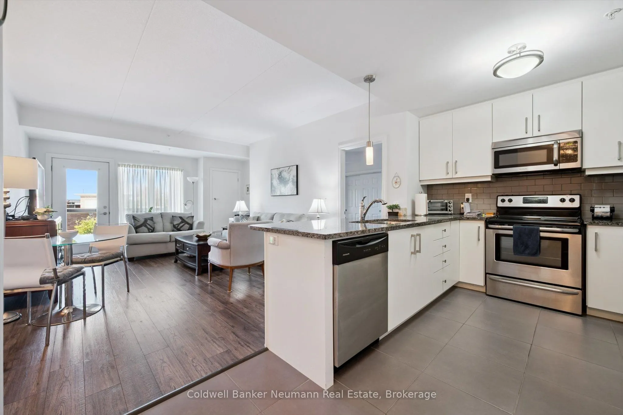 Discover stylish, maintenance-free living in this spacious and sun-filled 2-bedroom, 2-bathroom condo in Guelphs sought-after South End. Perfectly suited for first-time buyers, downsizers, or investors, this open-concept suite offers modern finishes and smart design in a well-managed, secure building.The open-concept living and dining area is filled with natural light thanks to oversized windows and 9-foot ceilings. The white kitchen features a granite countertop with breakfast bar, subway tile backsplash, and stainless steel appliances, creating a clean and functional space for everyday living.The primary bedroom includes a private 3-piece ensuite, while the second bedroom is ideal for guests, a home office, or shared accommodation. Additional highlights include in-suite laundry, engineered hardwood flooring, and one secure underground parking space. Ground floor entry adds extra convenience for daily access.Residents of this well-managed building enjoy access to excellent amenities including a full fitness facility, party room, rooftop terrace, and ample visitor parking. Located just minutes from the 401, restaurants, grocery stores, banks, and more, everything you need is close by.