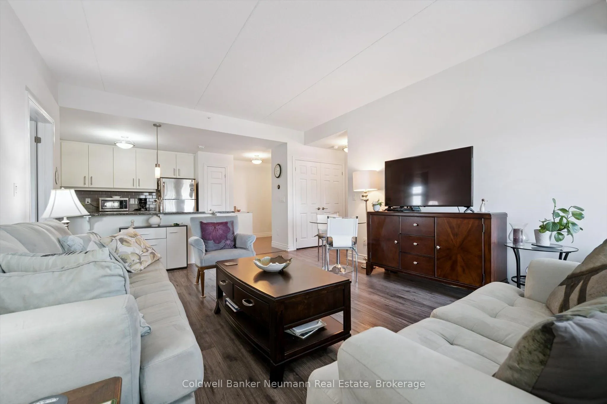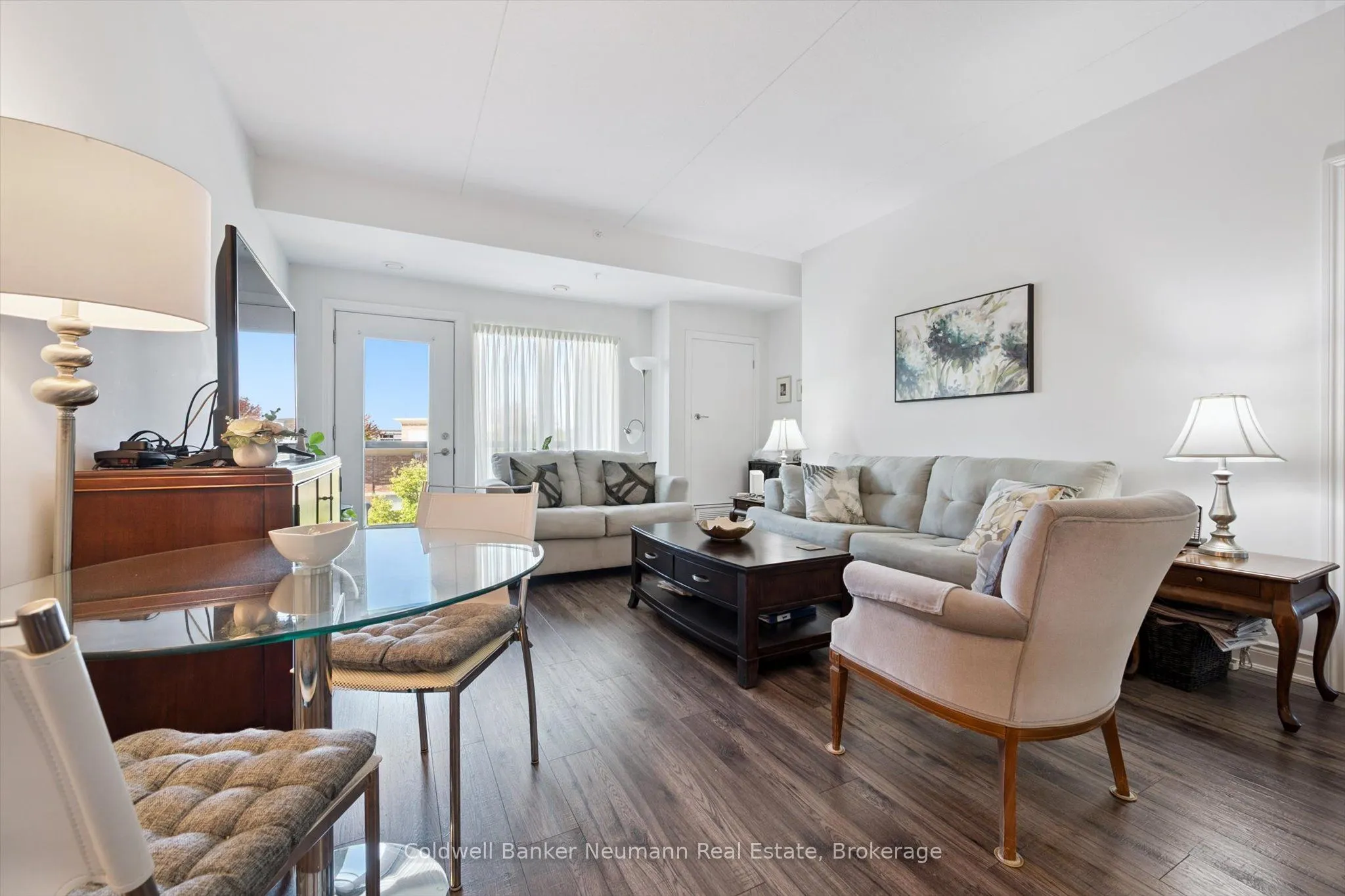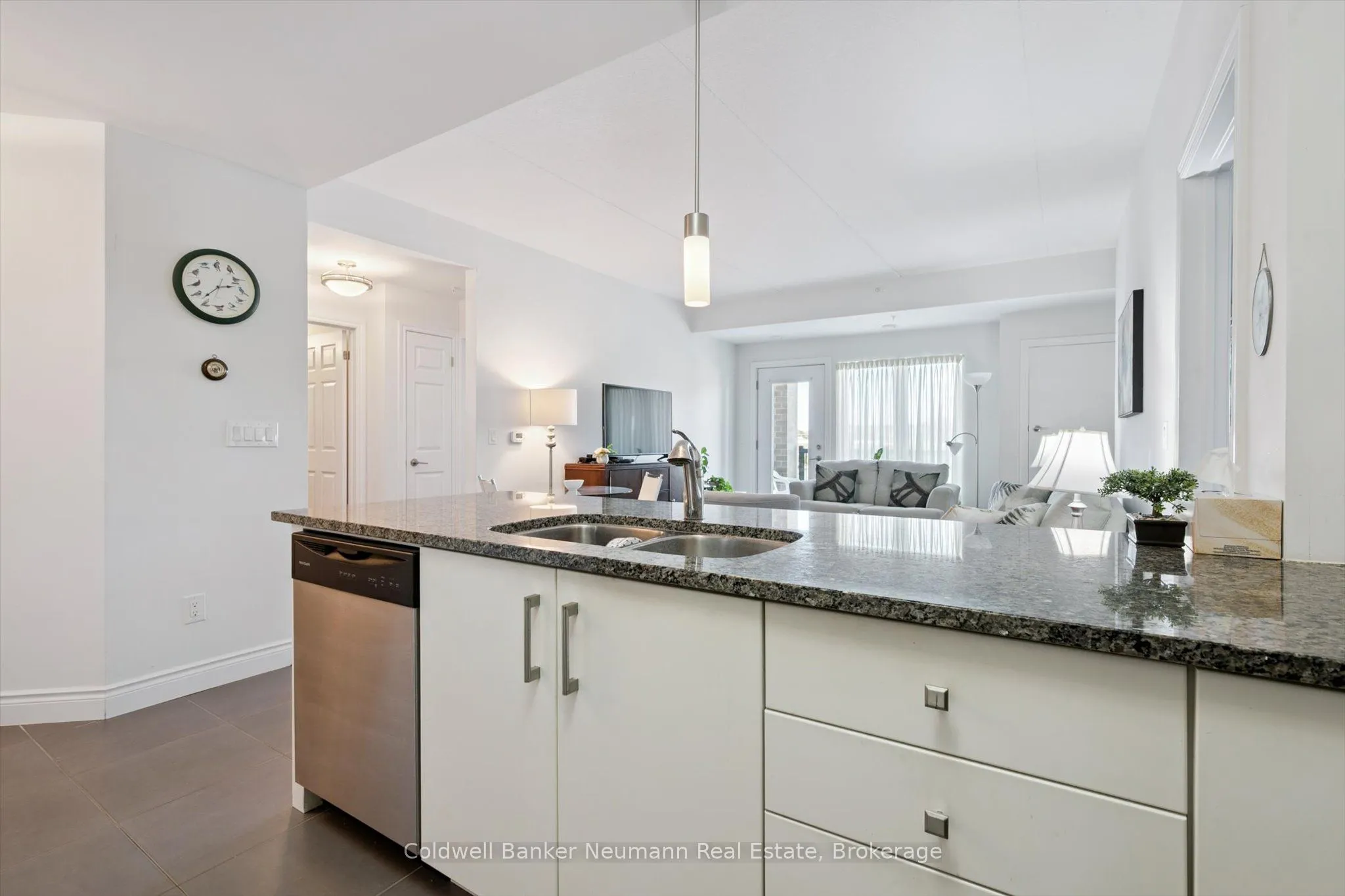 Discover stylish, maintenance-free living in this spacious and sun-filled 2-bedroom, 2-bathroom condo in Guelphs sought-after South End. Perfectly suited for first-time buyers, downsizers, or investors, this open-concept suite offers modern finishes and smart design in a well-managed, secure building.The open-concept living and dining area is filled with natural light thanks to oversized windows and 9-foot ceilings. The white kitchen features a granite countertop with breakfast bar, subway tile backsplash, and stainless steel appliances, creating a clean and functional space for everyday living.The primary bedroom includes a private 3-piece ensuite, while the second bedroom is ideal for guests, a home office, or shared accommodation. Additional highlights include in-suite laundry, engineered hardwood flooring, and one secure underground parking space. Ground floor entry adds extra convenience for daily access.Residents of this well-managed building enjoy access to excellent amenities including a full fitness facility, party room, rooftop terrace, and ample visitor parking. Located just minutes from the 401, restaurants, grocery stores, banks, and more, everything you need is close by.