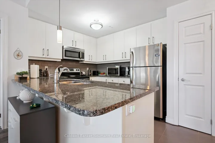 Discover stylish, maintenance-free living in this spacious and sun-filled 2-bedroom, 2-bathroom condo in Guelphs sought-after South End. Perfectly suited for first-time buyers, downsizers, or investors, this open-concept suite offers modern finishes and smart design in a well-managed, secure building.The open-concept living and dining area is filled with natural light thanks to oversized windows and 9-foot ceilings. The white kitchen features a granite countertop with breakfast bar, subway tile backsplash, and stainless steel appliances, creating a clean and functional space for everyday living.The primary bedroom includes a private 3-piece ensuite, while the second bedroom is ideal for guests, a home office, or shared accommodation. Additional highlights include in-suite laundry, engineered hardwood flooring, and one secure underground parking space. Ground floor entry adds extra convenience for daily access.Residents of this well-managed building enjoy access to excellent amenities including a full fitness facility, party room, rooftop terrace, and ample visitor parking. Located just minutes from the 401, restaurants, grocery stores, banks, and more, everything you need is close by.