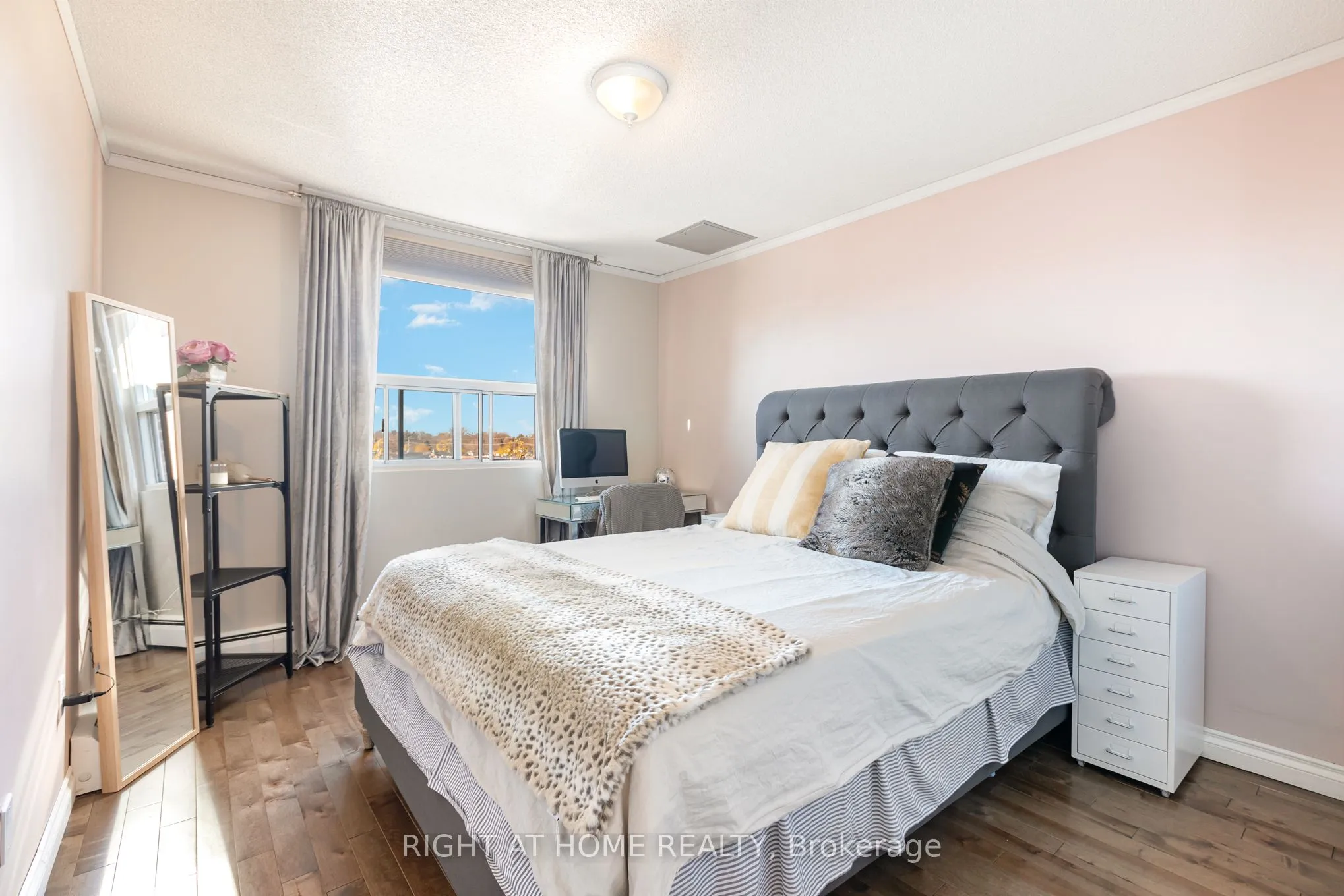 Welcome first time buyers/investors/downsizers. This beautiful, bright one bedroom apartment features an open concept kitchen/living/dining room, large balcony with an amazing view. Granite countertops in kitchen, loads of cupboards space, breakfast bar. Hardwood floor in living, dining room and bedroom. In-suit laundry for your convenience. Public transportation, parks, trails, easy access to HWY 403. Building features 2 elevators, party room, exercise room. Newly renovated garage.