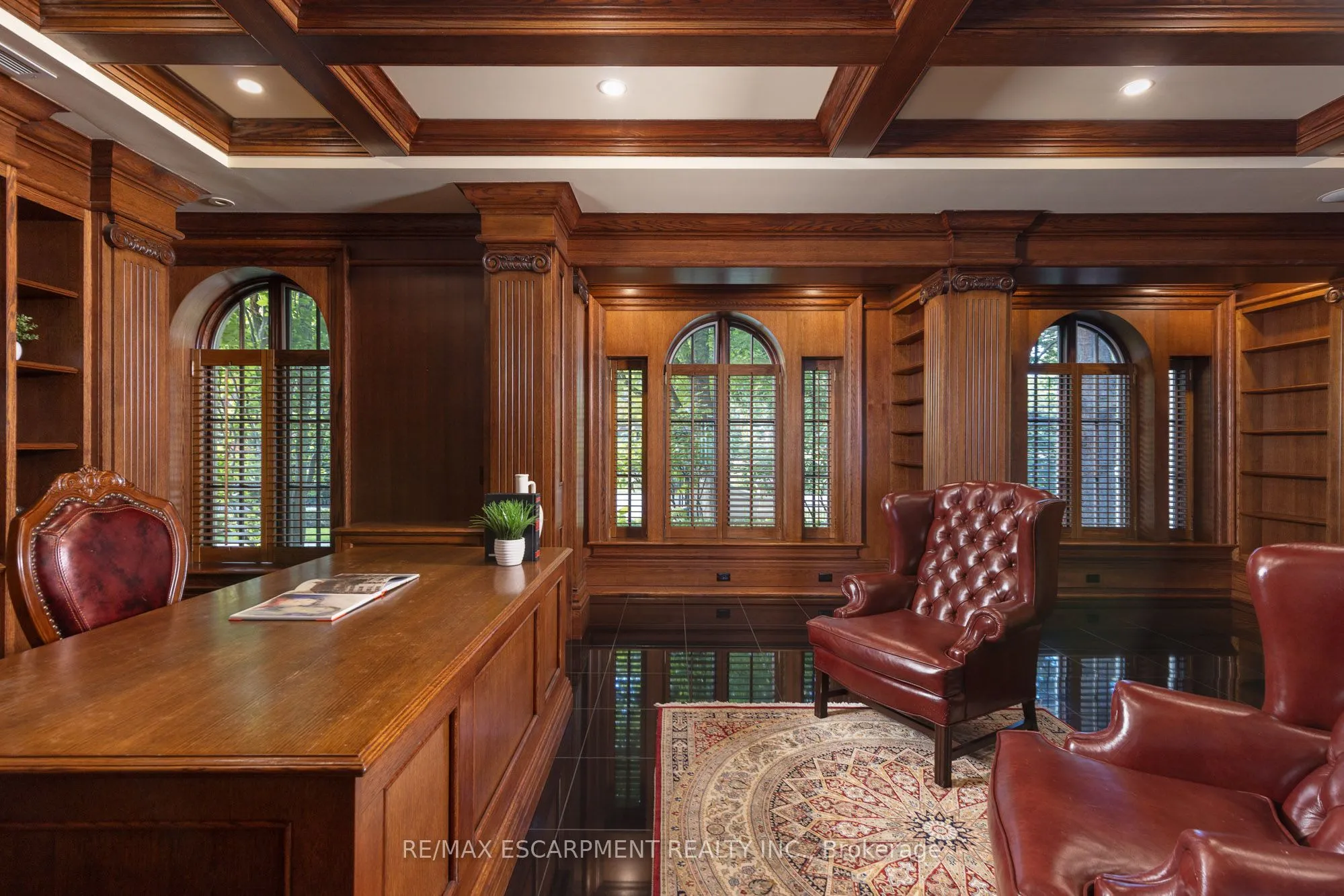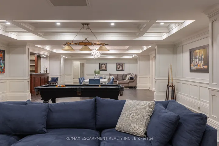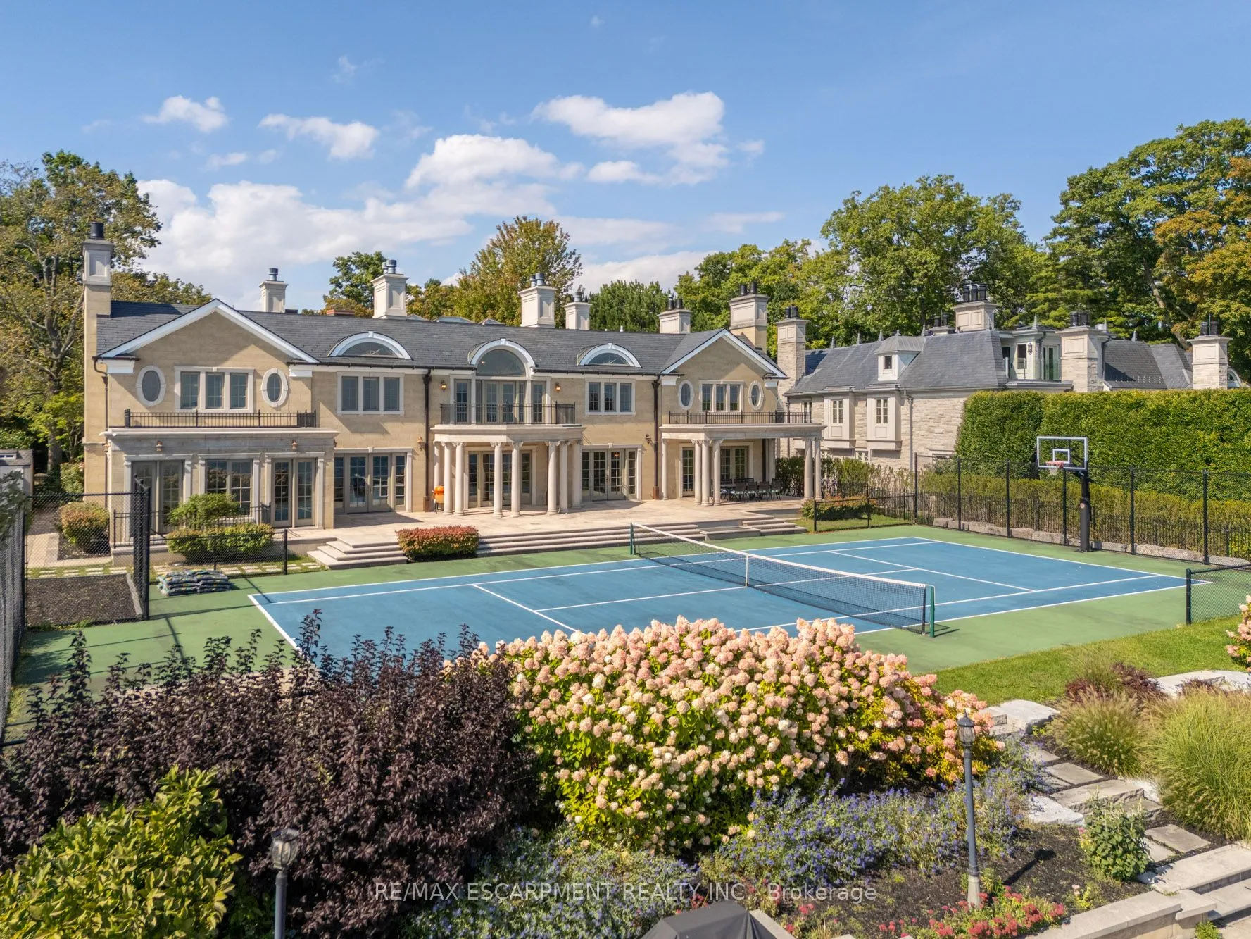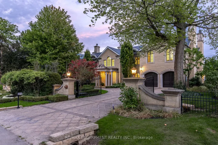 Commanding a prized stretch of Lake Ontario shoreline in prestigious South East Oakville, this Hicks-Pettes-designed estate defines European elegance and modern grandeur. A limestone façade with stone pillars, slate roof and copper detailing signal architectural pedigree of the highest order. Behind the gated, heated circular drive and stately covered porch, more than 14,000 sq. ft. of elevator-served luxury unfolds. From the moment you enter, panoramic lake vistas sweep across every principal room, creating an unforgettable backdrop for both intimate family life and grand entertaining. Radiant-heated marble floors and a soaring 22-foot illuminated barrel ceiling set a tone of sophisticated drama. Formal living and entertaining salons, each with hand-carved stone fireplaces, open to expansive lake-view terraces, while the sun-filled solarium captures year-round vistas of the tennis court and shimmering water beyond. A chefs kitchen with separate caterers prep area balances everyday ease with gala-scale hosting. Completing the main level, a richly paneled library provides a quiet, distinguished retreat for work or reflection. Five lavish bedroom suites each with private ensuite include a primary sanctuary with spa-inspired bath and private lake-view balcony. The lower level becomes a private club: temperature-controlled wine cellar and bar, theatre, banquet hall, gym, nanny suite and second laundry. Outdoors, French-inspired gardens, sound-equipped terraces and a full tennis court embrace the lakes breezes and golden sunsets. This is Oakvilles ultimate lakefront legacy residence – where unrivalled, world-class vistas from every principal room meet architectural mastery and resort-style amenities to create a property of true international calibre. Luxury Certified.