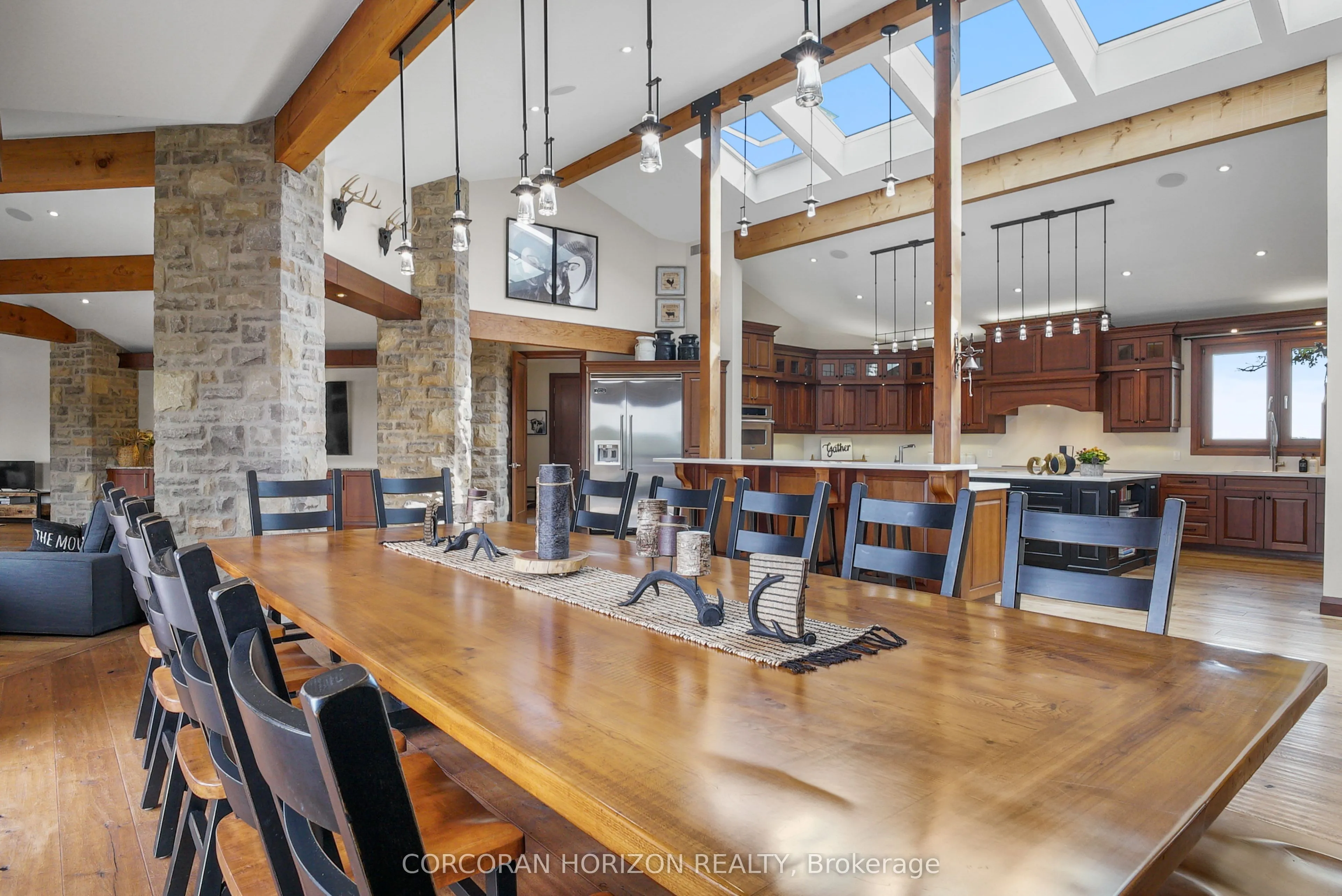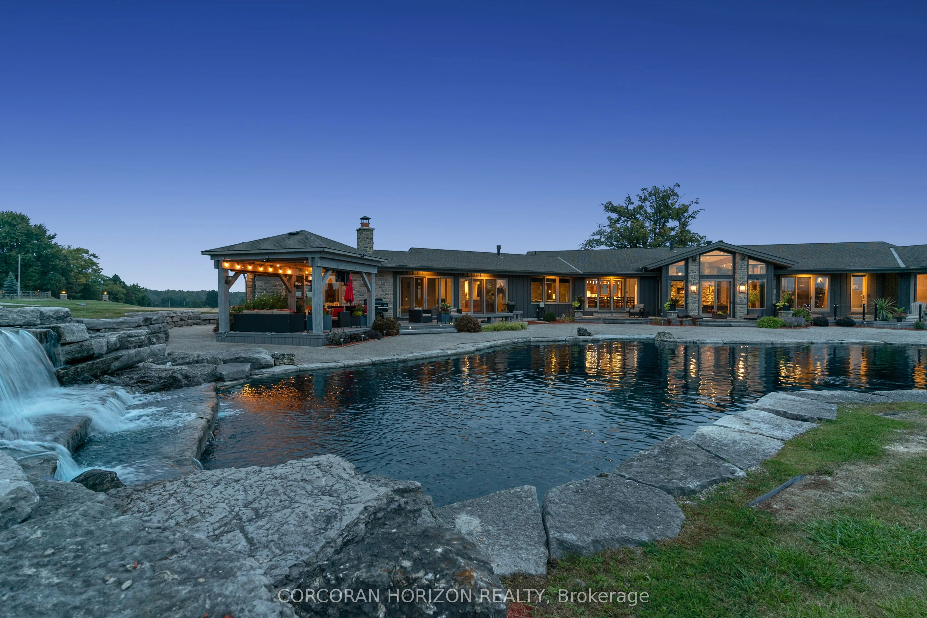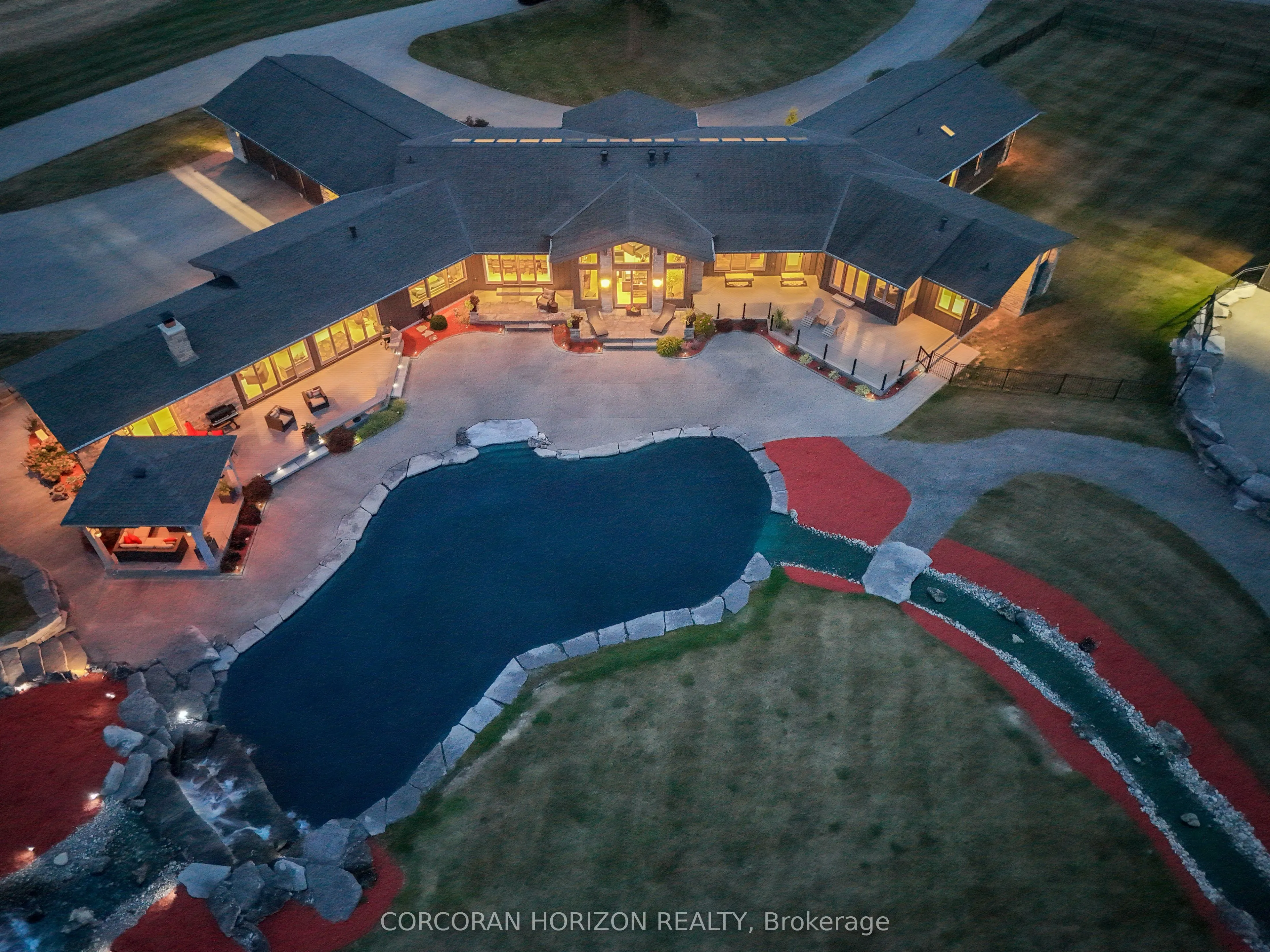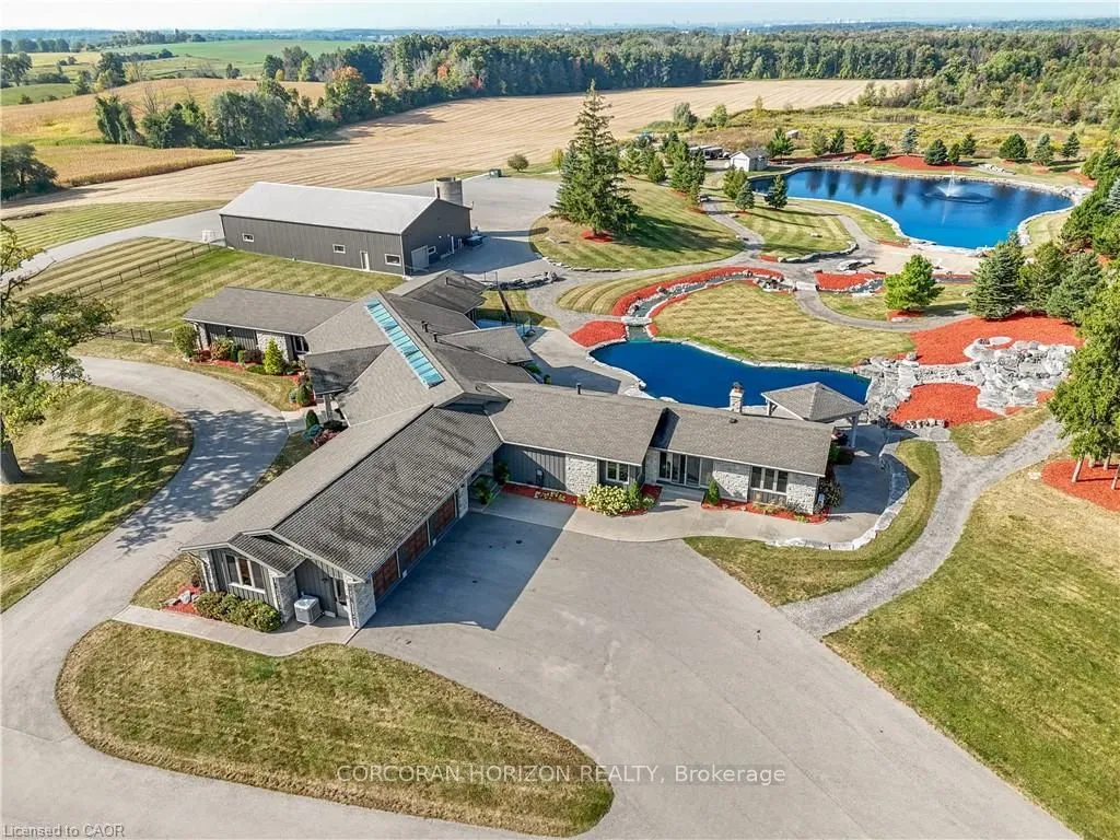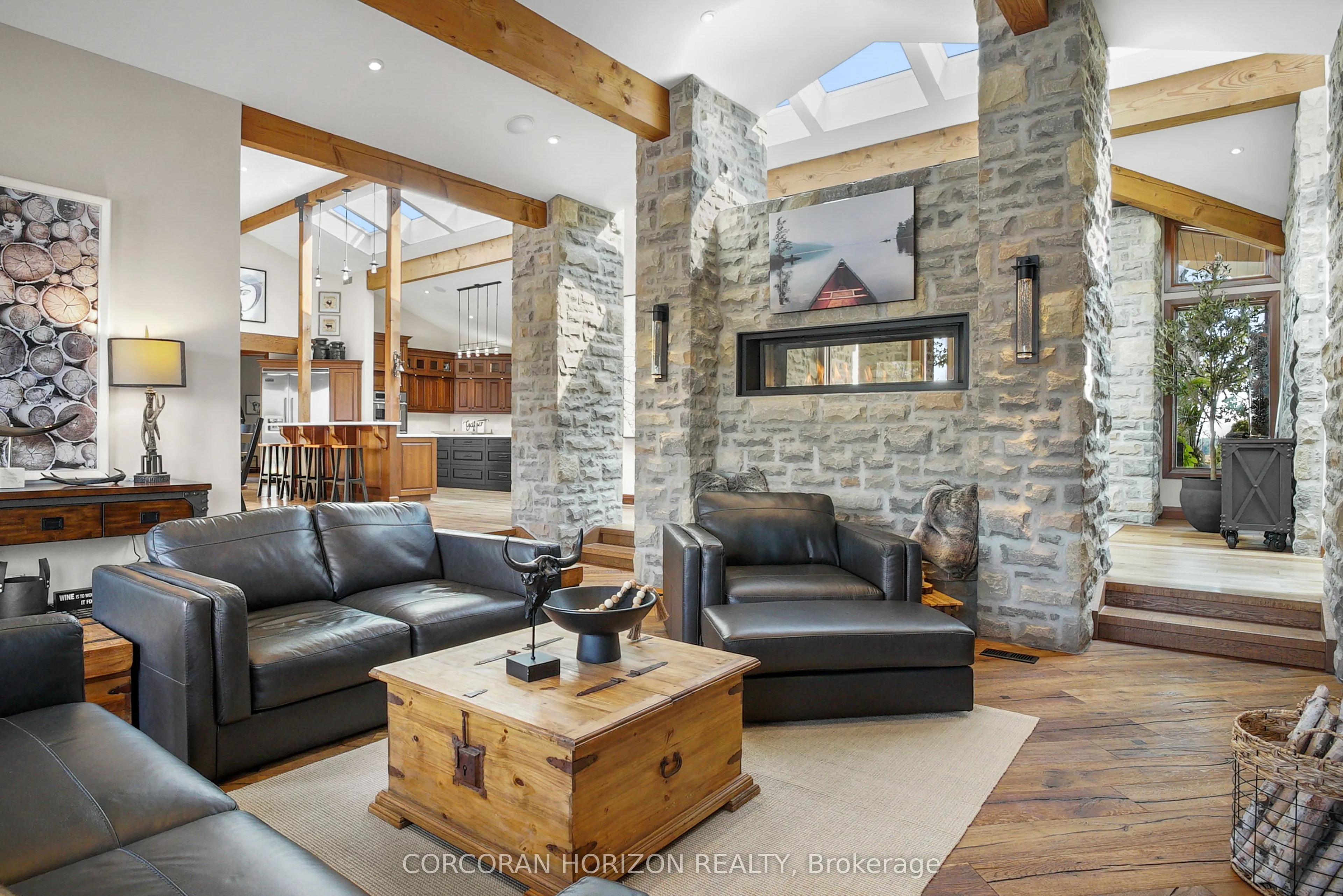 Experience an extraordinary retreat set on over 120 acres of natural beauty. This custom stone bungalow, spanning 10,454.23 sq. ft., showcases high-quality finishes and thoughtful design. Step into the gourmet kitchen, equipped with Viking Professional appliances, Silestone Quartz surfaces, and striking Douglas fir beams. The dual islands invite gatherings, while the dining area offers seating for 14, overlooking a scenic ponds. High ceilings throughout the home create an open, inviting space, while the use of stone and wood details adds a warm, cozy atmosphere. Hand-chipped stone accents and skylights flood the interior with natural light, enhancing the home’s connection to its surroundings. The primary suite opens directly to the swim ponds, offering indoor-outdoor living and a spa-like ensuite with a jacuzzi tub beside a gas fireplace. An indoor grilling area with heated floors offers year-round enjoyment, making it an ideal space for entertaining. The lower level is designed for fun and relaxation, featuring a full bar, billiards area, wine cellar, and a private cinema for movie nights. Outdoors, you’ll find two ponds: one with a sandy beach and waterfall, and the other stocked for fishing. A heated, 4,000 sq. ft. exterior building with in-floor heating adds both function and flexibility to this expansive property. Explore the trails, unwind in the sitting areas, and enjoy this ultimate private getaway!