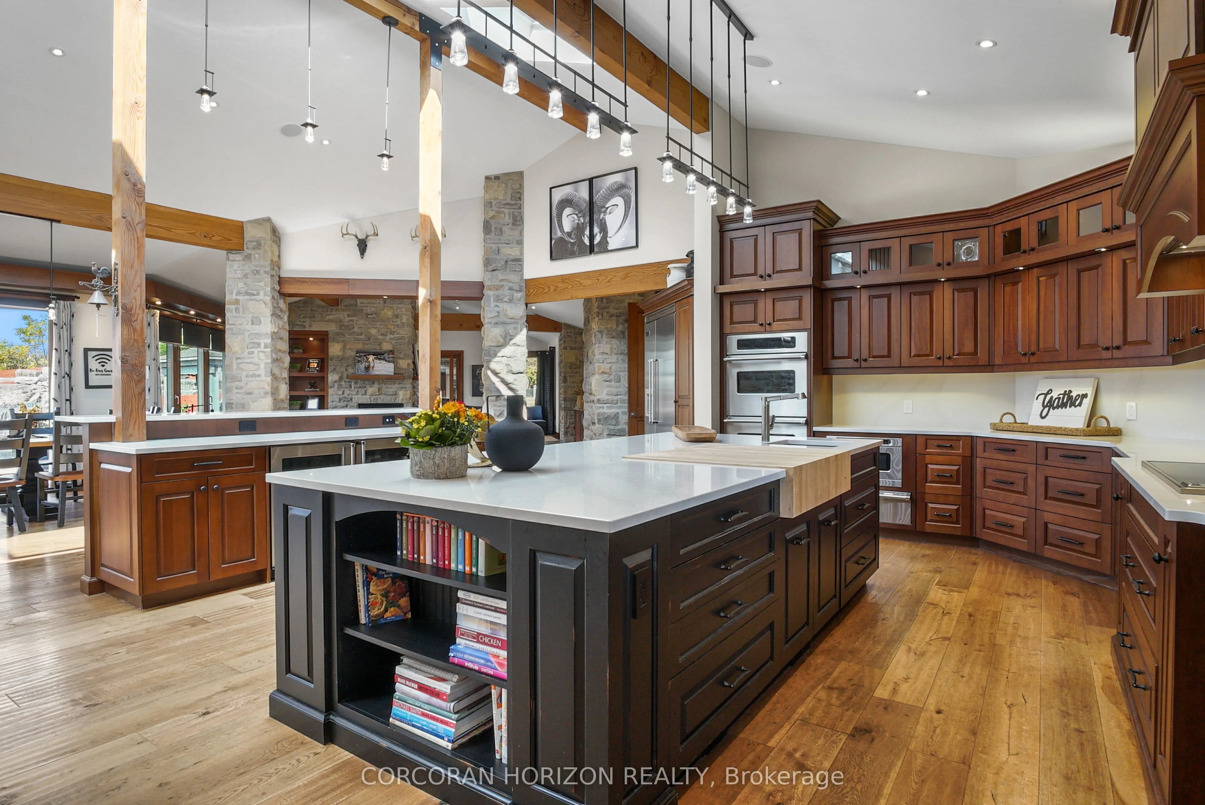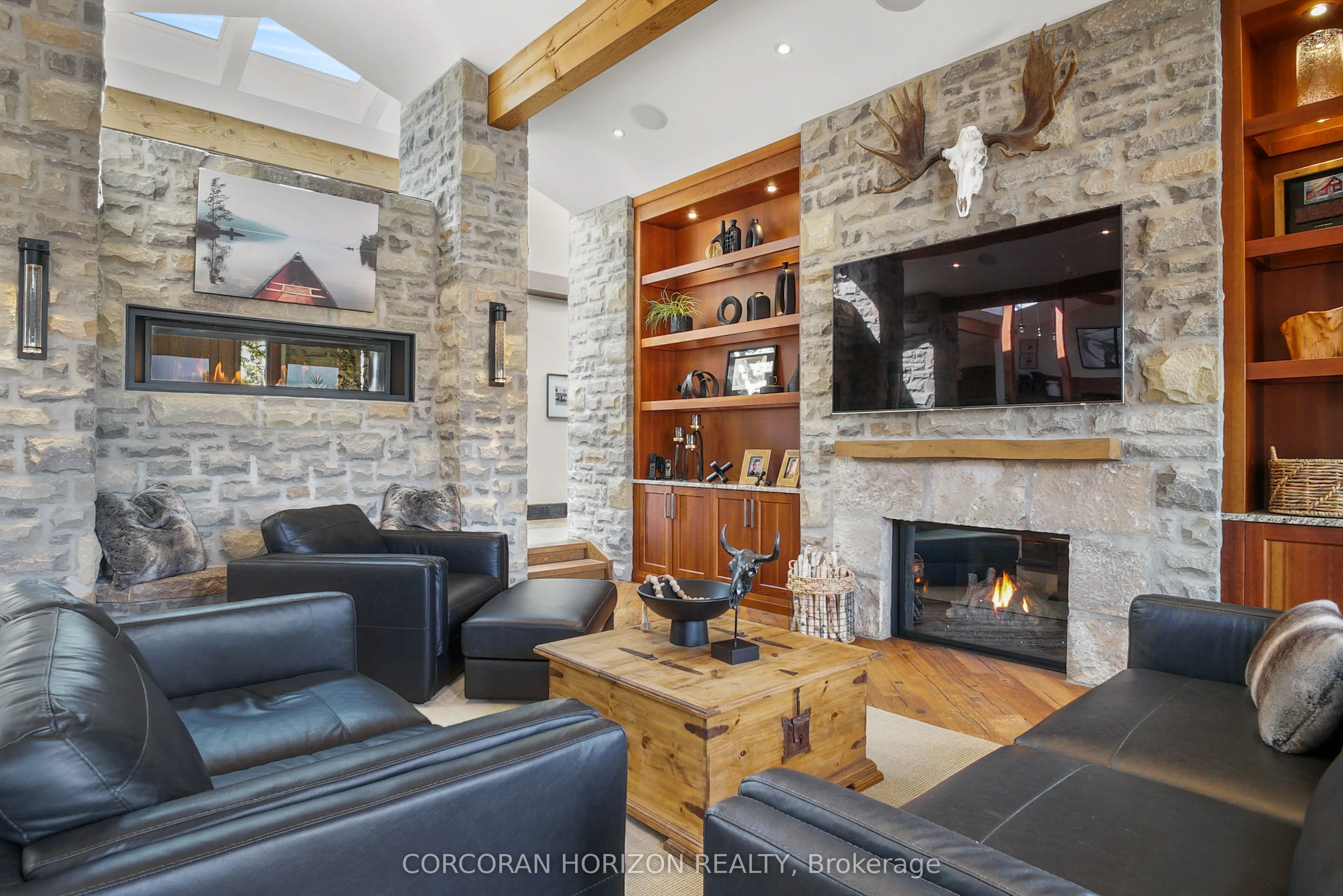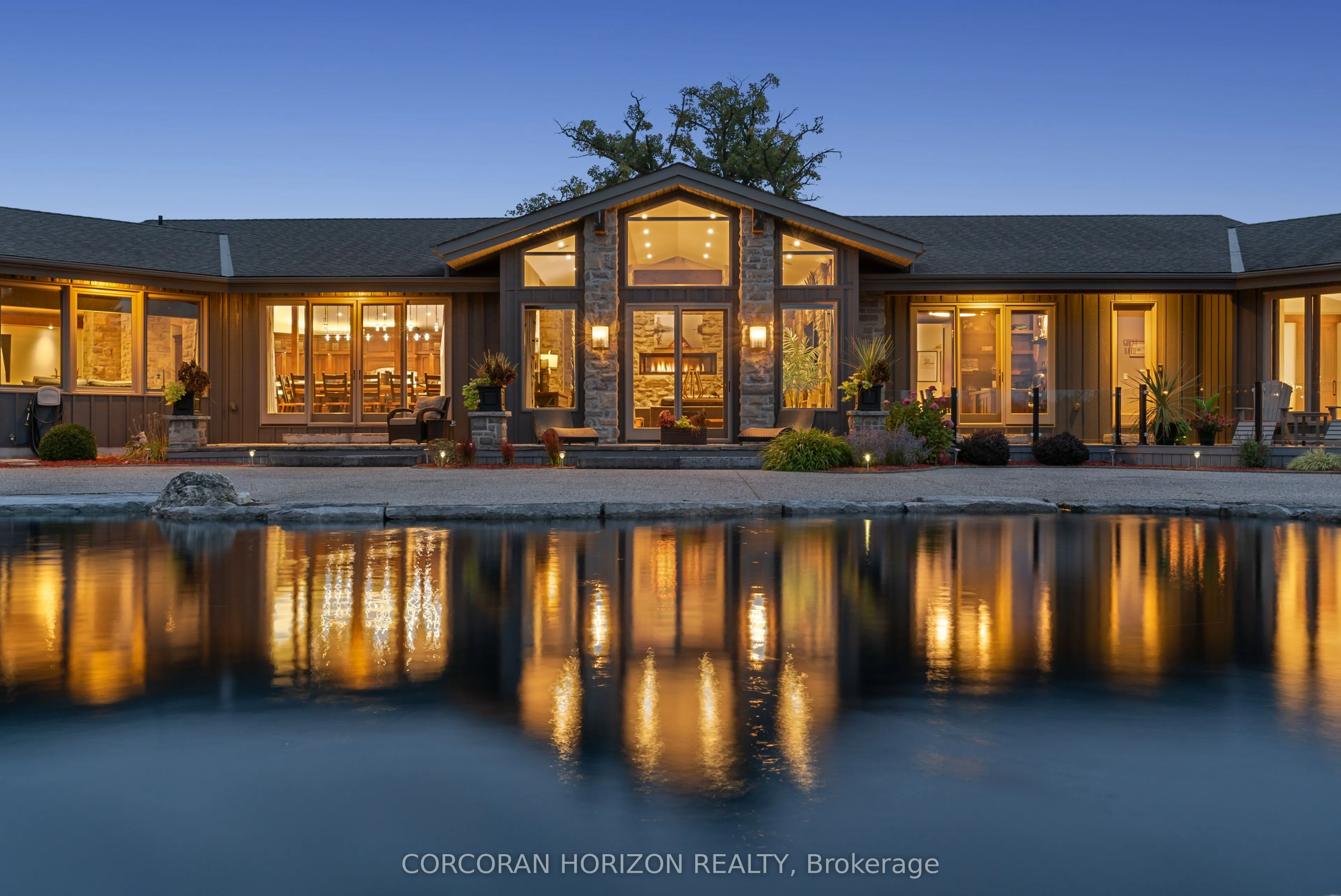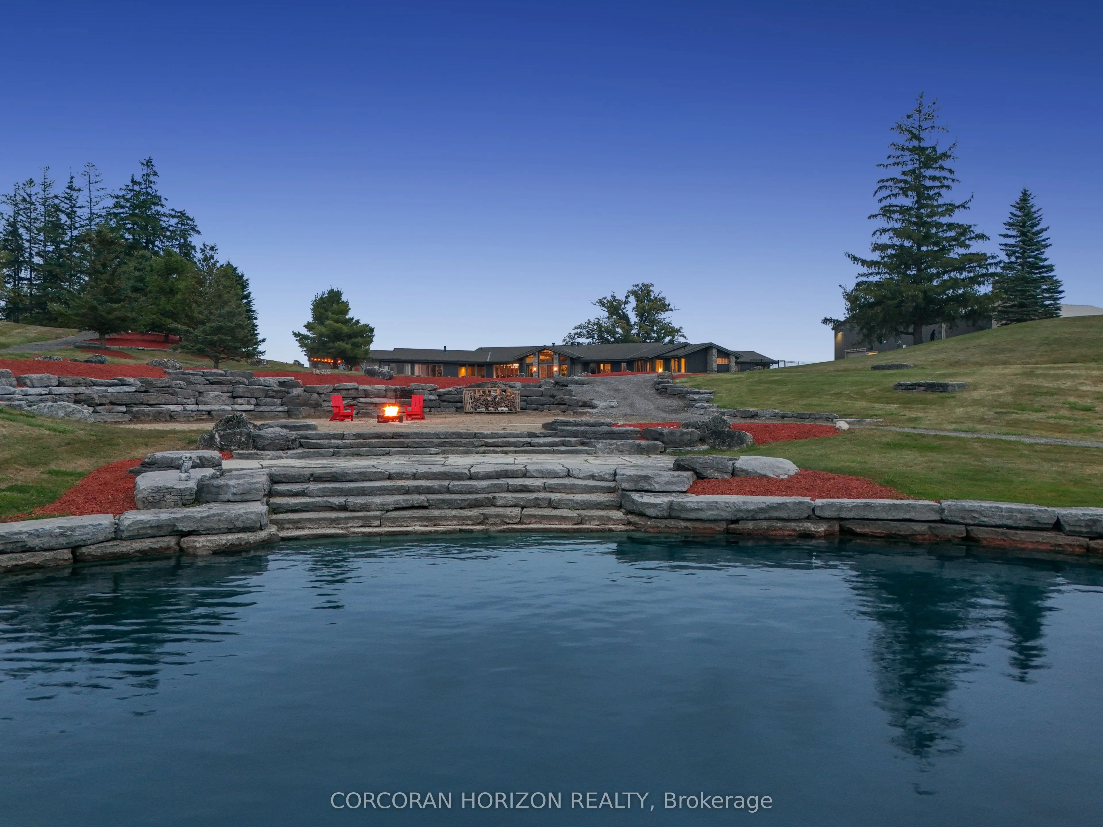 Experience an extraordinary retreat set on over 120 acres of natural beauty. This custom stone bungalow, spanning 10,454.23 sq. ft., showcases high-quality finishes and thoughtful design. Step into the gourmet kitchen, equipped with Viking Professional appliances, Silestone Quartz surfaces, and striking Douglas fir beams. The dual islands invite gatherings, while the dining area offers seating for 14, overlooking a scenic ponds. High ceilings throughout the home create an open, inviting space, while the use of stone and wood details adds a warm, cozy atmosphere. Hand-chipped stone accents and skylights flood the interior with natural light, enhancing the home’s connection to its surroundings. The primary suite opens directly to the swim ponds, offering indoor-outdoor living and a spa-like ensuite with a jacuzzi tub beside a gas fireplace. An indoor grilling area with heated floors offers year-round enjoyment, making it an ideal space for entertaining. The lower level is designed for fun and relaxation, featuring a full bar, billiards area, wine cellar, and a private cinema for movie nights. Outdoors, you’ll find two ponds: one with a sandy beach and waterfall, and the other stocked for fishing. A heated, 4,000 sq. ft. exterior building with in-floor heating adds both function and flexibility to this expansive property. Explore the trails, unwind in the sitting areas, and enjoy this ultimate private getaway!