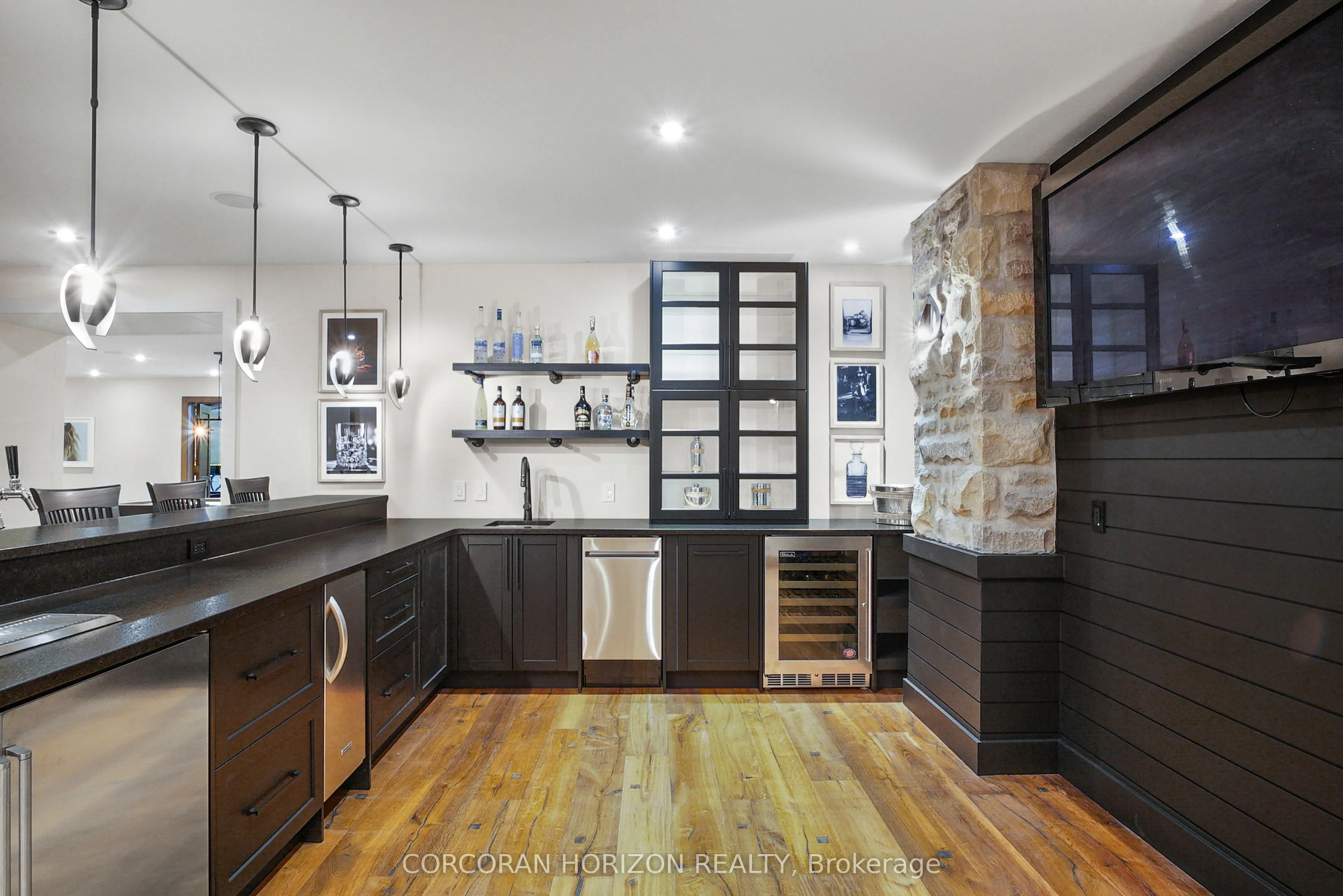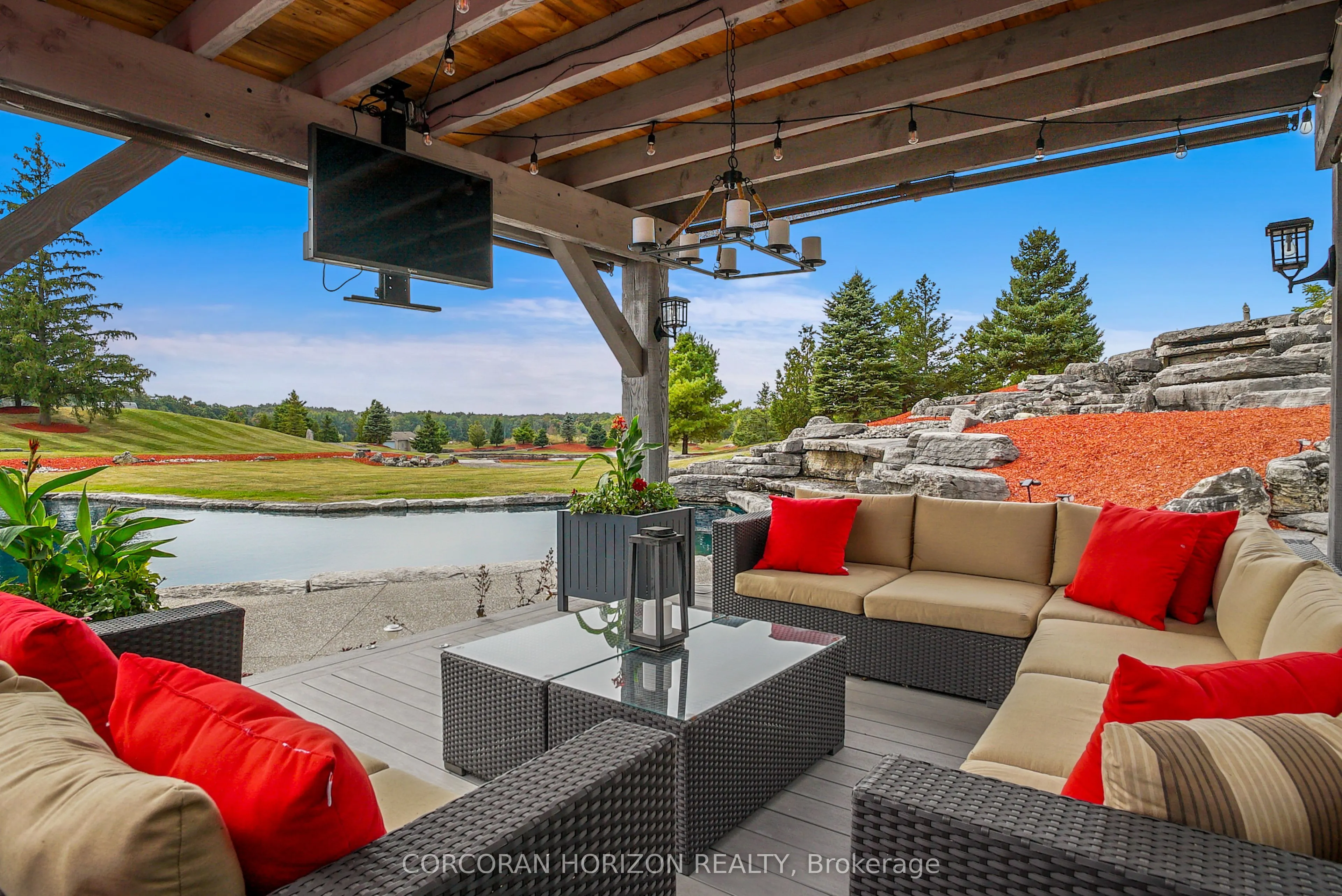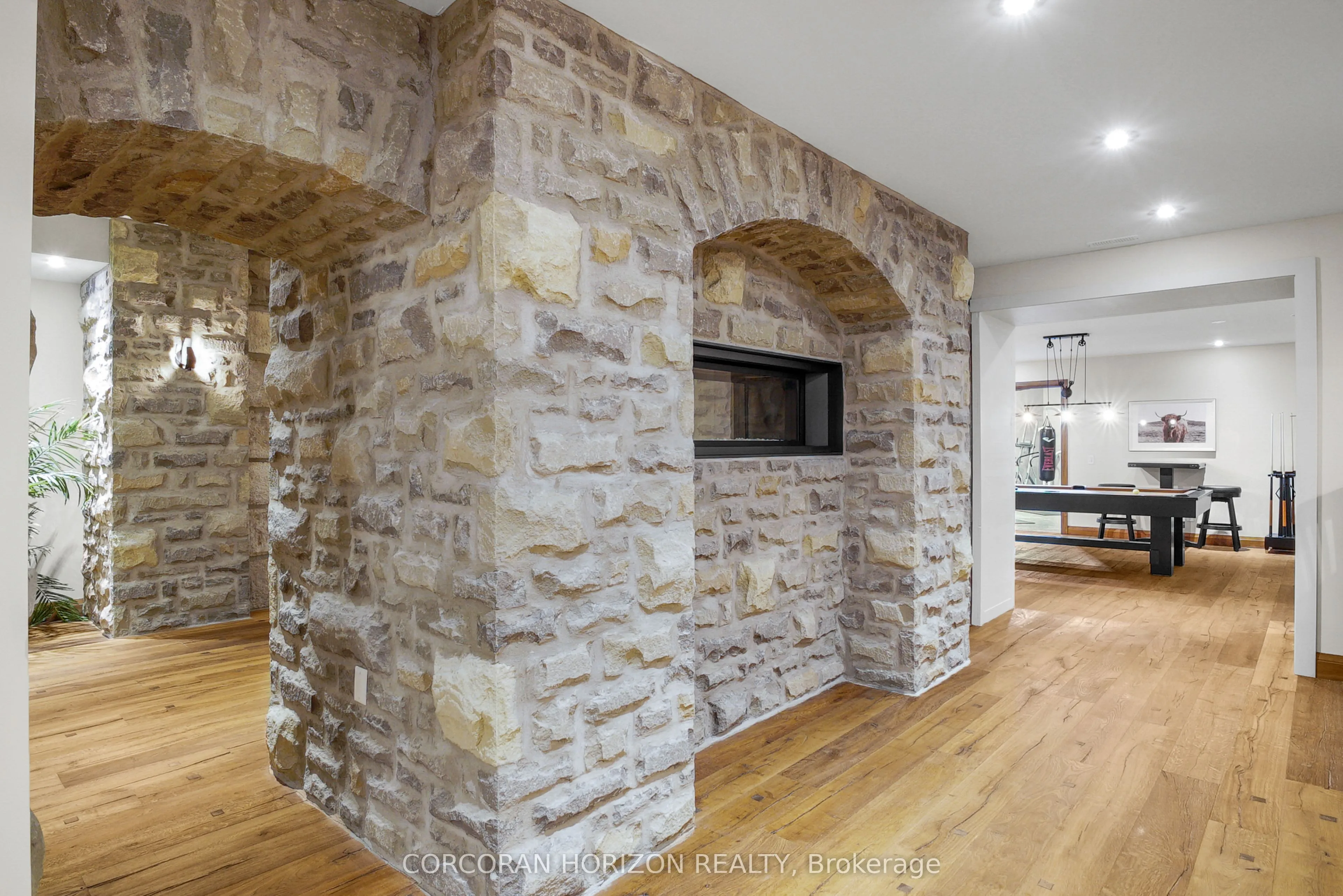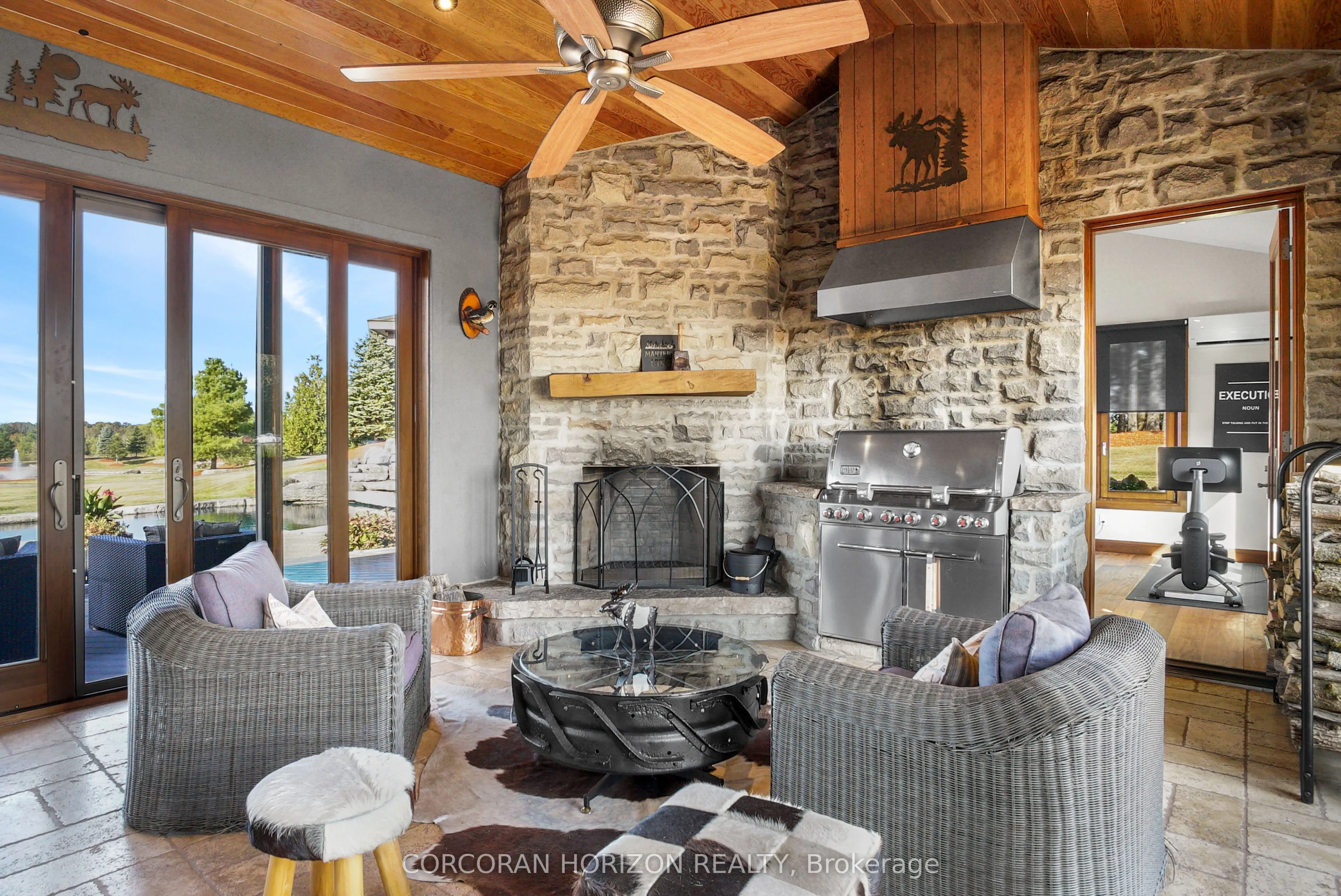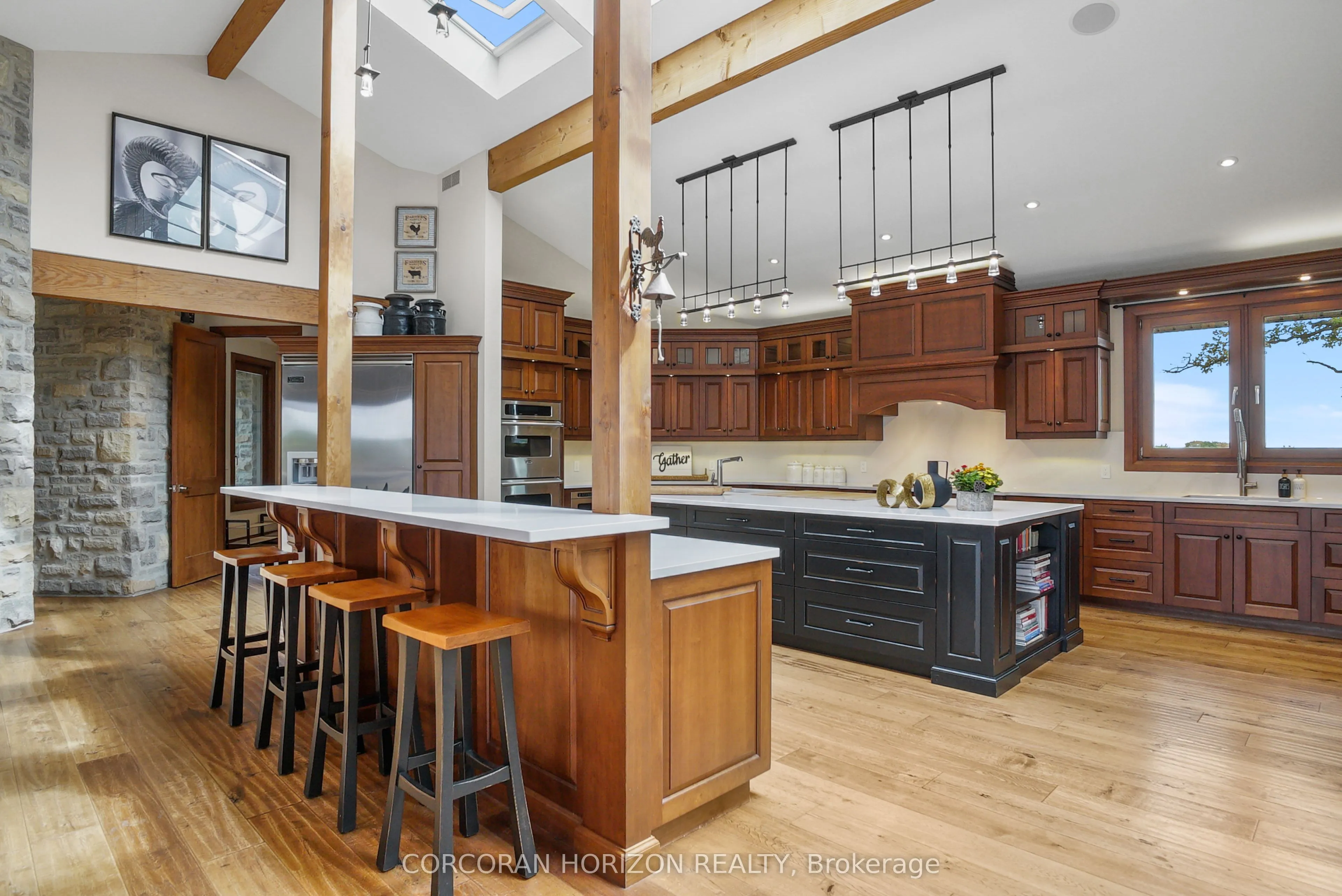 Experience an extraordinary retreat set on over 120 acres of natural beauty. This custom stone bungalow, spanning 10,454.23 sq. ft., showcases high-quality finishes and thoughtful design. Step into the gourmet kitchen, equipped with Viking Professional appliances, Silestone Quartz surfaces, and striking Douglas fir beams. The dual islands invite gatherings, while the dining area offers seating for 14, overlooking a scenic ponds. High ceilings throughout the home create an open, inviting space, while the use of stone and wood details adds a warm, cozy atmosphere. Hand-chipped stone accents and skylights flood the interior with natural light, enhancing the home’s connection to its surroundings. The primary suite opens directly to the swim ponds, offering indoor-outdoor living and a spa-like ensuite with a jacuzzi tub beside a gas fireplace. An indoor grilling area with heated floors offers year-round enjoyment, making it an ideal space for entertaining. The lower level is designed for fun and relaxation, featuring a full bar, billiards area, wine cellar, and a private cinema for movie nights. Outdoors, you’ll find two ponds: one with a sandy beach and waterfall, and the other stocked for fishing. A heated, 4,000 sq. ft. exterior building with in-floor heating adds both function and flexibility to this expansive property. Explore the trails, unwind in the sitting areas, and enjoy this ultimate private getaway!