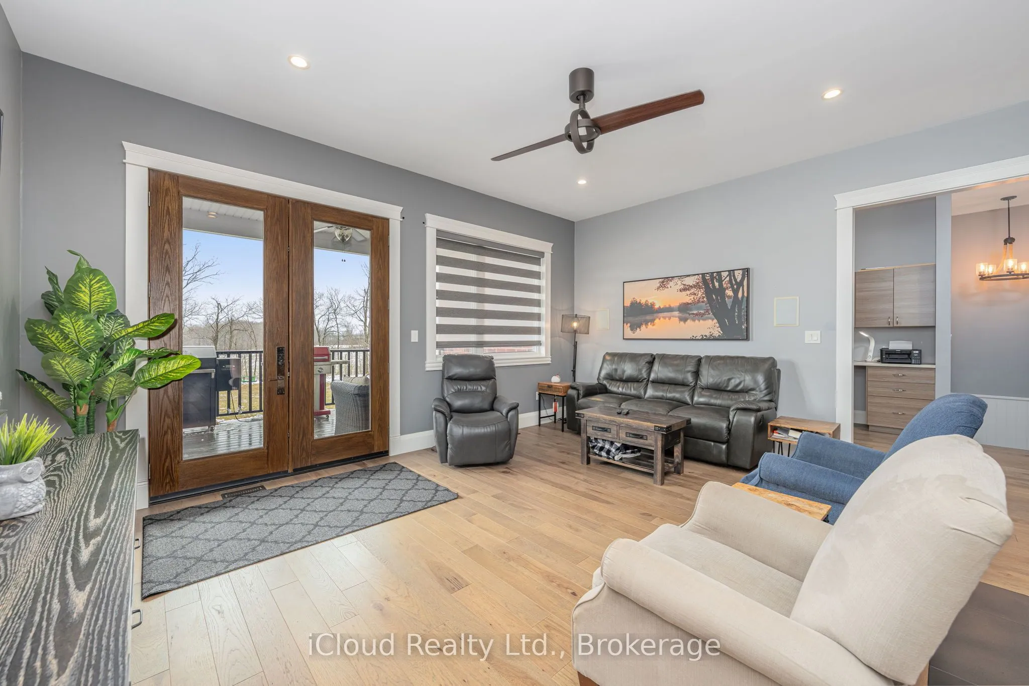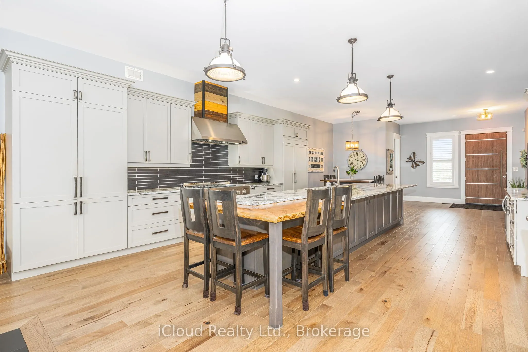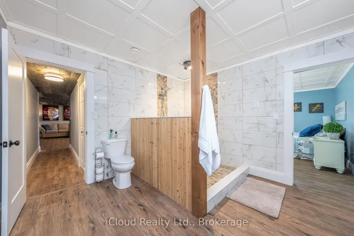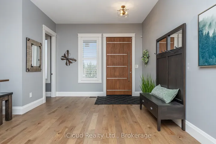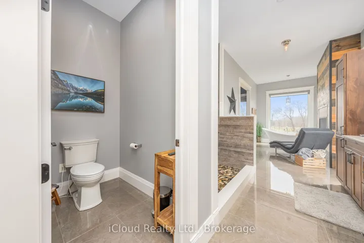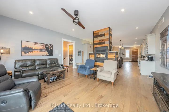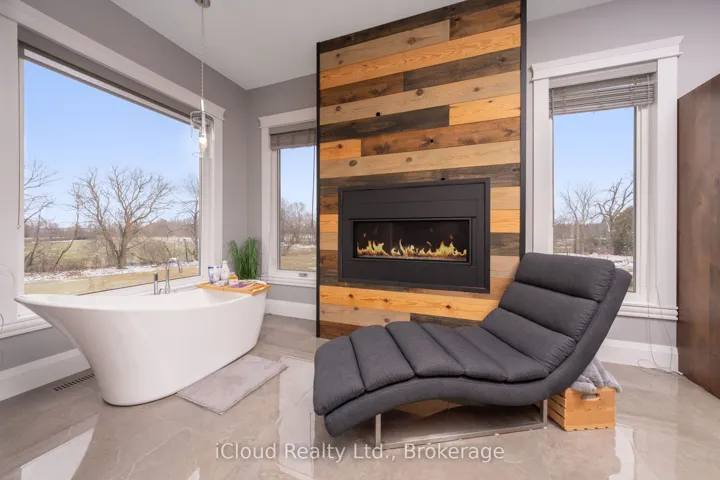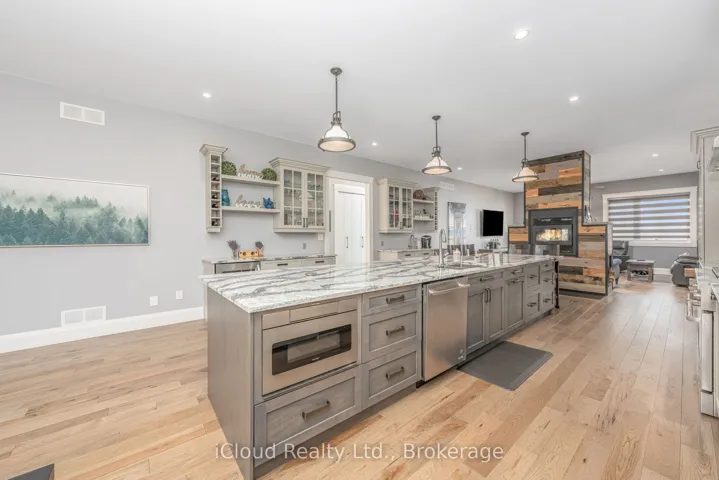 This extraordinary 5-bedroom, 5-bathroom custom-built bungalow offers over 5,000 sq ft of beautifully finished living space on 9 peaceful, tree-lined acres in sought-after Erin. A perfect blend of luxury and functionality, the home features hardwood flooring throughout the main level and a chefs dream kitchen with a large quartz island, top-of-the-line appliances, and a two-way fireplace connecting to the inviting living room. A walkout from the living room leads to a covered deck overlooking the stunning property ideal for entertaining or quiet evenings in nature. The primary suite is a true retreat, featuring a spa-inspired ensuite with a spacious 6×6 open-framed shower, freestanding tub warmed by a gas fireplace, and elegant finishes. Two additional main floor bedrooms each offer 4-piece ensuites and double closets, providing comfort and privacy for family or guests. The fully finished walk-out basement boasts a spacious layout with heated floors, a second kitchen, games area, cozy great room with gas fireplace, dedicated theatre room with Dolby Atmos 9.1 surround sound, one bedroom currently used as a home gym, and a second bedroom with a semi-ensuite featuring another 6×6 open-framed shower. Step outside to a private patio with gazebo, hot tub and built-in fire nook perfect for relaxation. Additional highlights include a heated garage with epoxy flooring, whole-home 22k W automatic generator, reverse osmosis water treatment system, and scenic pond separating two 4+ acre parcels each with its own driveway and natural gas hookup. Previously approved for a second building (with septic and well), this property offers luxury, flexibility, potential future development, and country charm in one unmatched package.