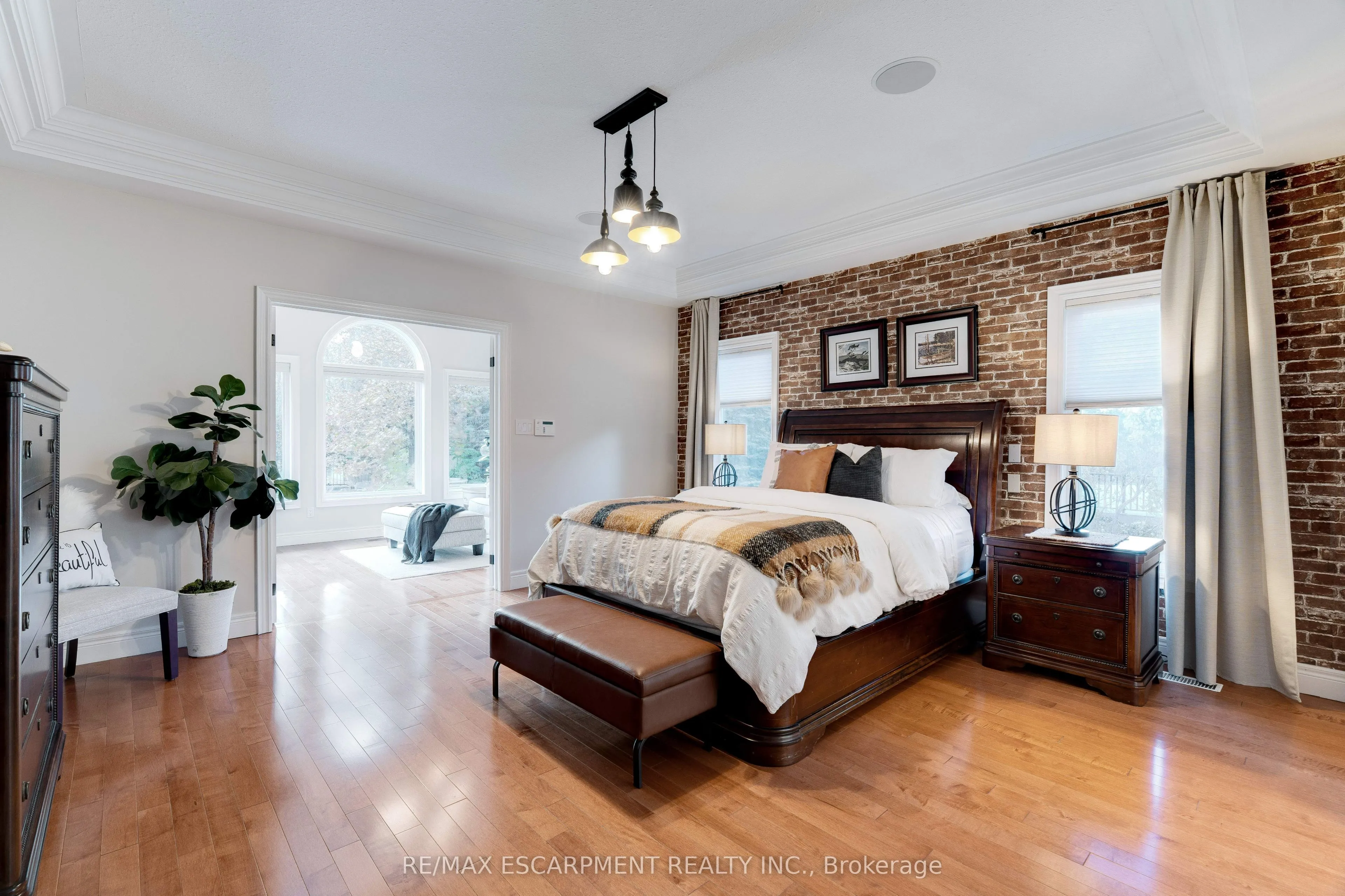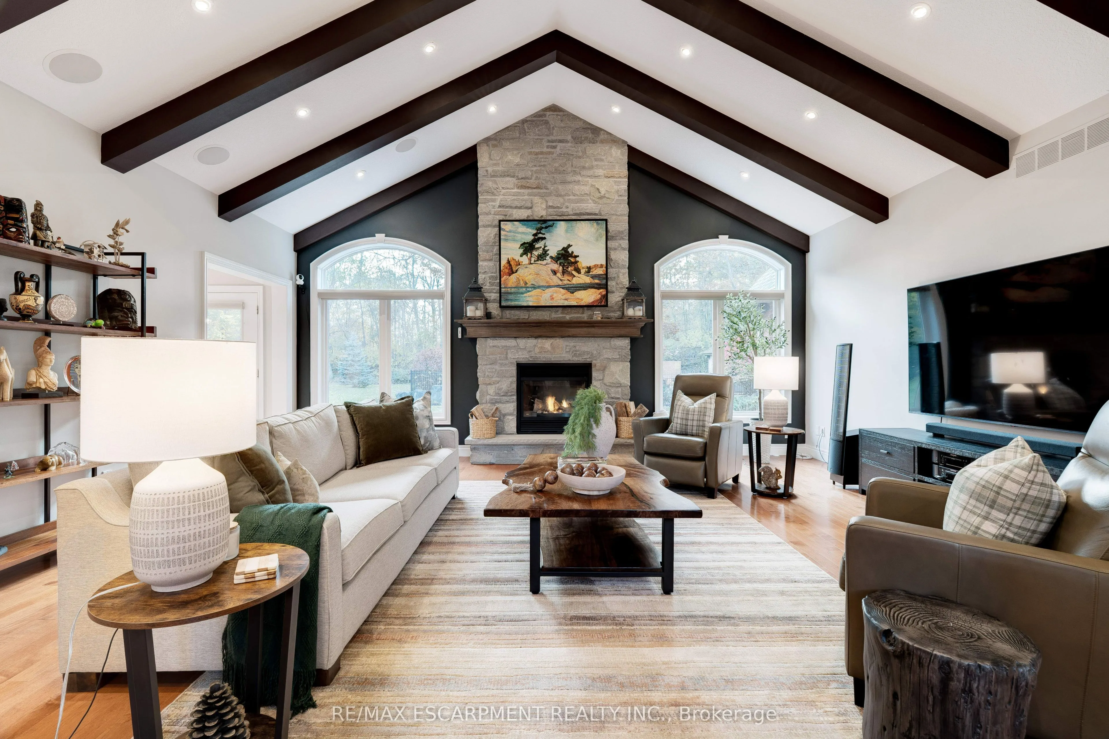 Welcome home! This exquisite, custom Charleston-built 1.5-storey dwelling is nestled on a private, forested half-acre-plus property, offering the perfect blend of luxury and tranquility. The main floor features a desirable primary retreat complete with a sunroom overlooking the private yard and a spa-like ensuite. Gather in the grand great room with its vaulted beamed ceiling and a magnificent 14-foot stone gas fireplace, or relax in the separate den/office, which also boasts vaulted ceilings and a fireplace. The spacious dining room seamlessly connects these living spaces, leading into the bright and spacious island-equipped kitchen. The upper level offers two bedrooms with a Jack and Jill bath in addition to another generous sized room with a full ensuite. The lower level is beautifully finished with high ceilings, a stone fireplace, a three-piece bath, and an additional bedroom. Step outside to your dream backyard oasis. This western-setting retreat features a stunning saltwater pool with a stone waterfall, a full cabana with a bar and dedicated bathroom/change room, a cozy gazebo, and ambient landscape lighting. This wonderful property is ready for your family to move in and enjoy!