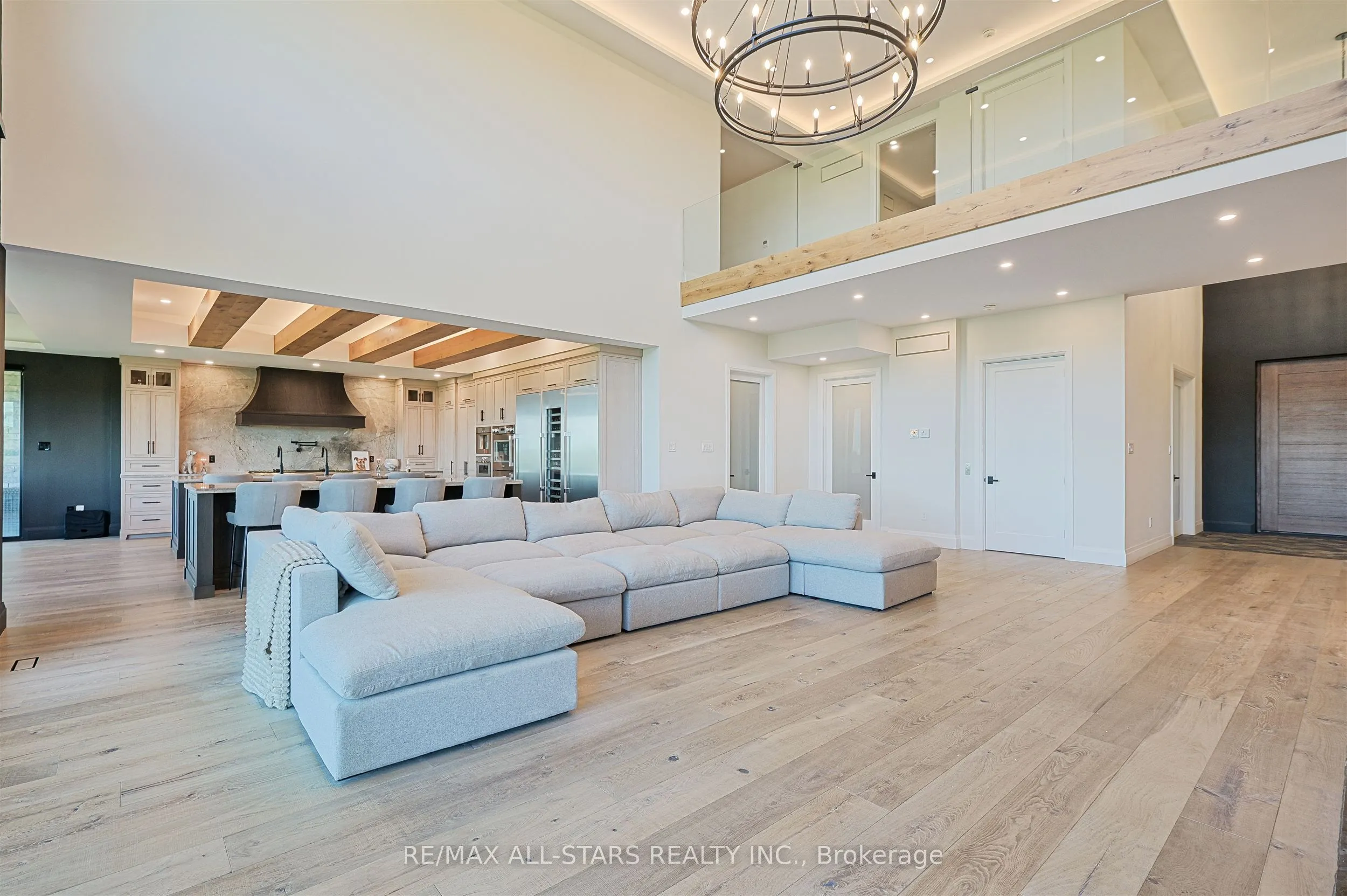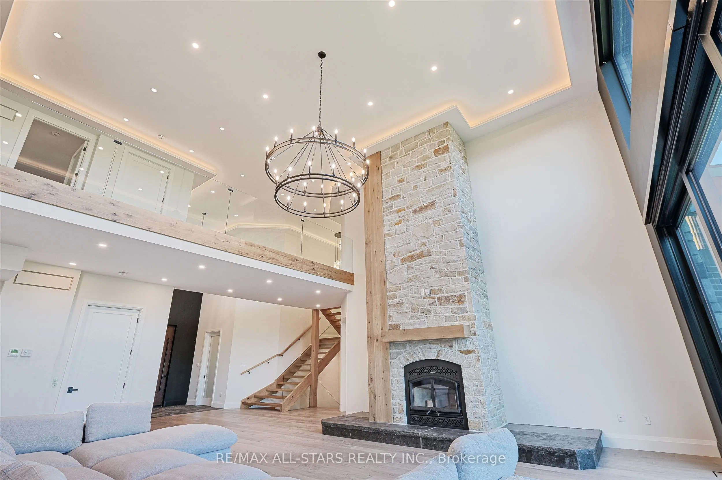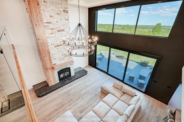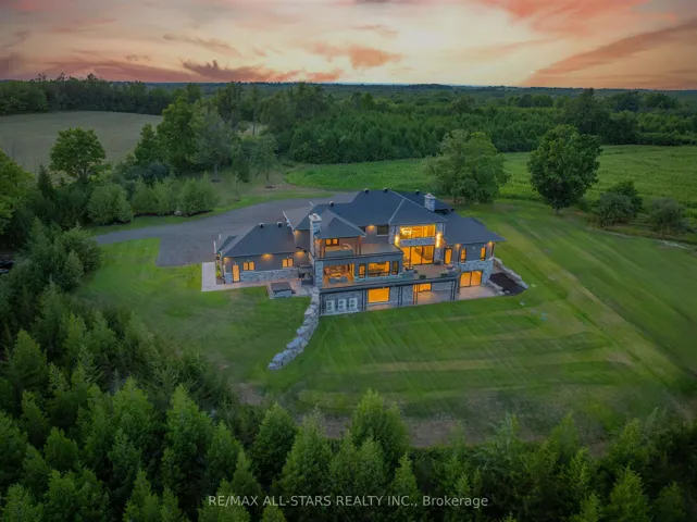 Welcome to this extraordinary custom-built luxury estate, a private hilltop retreat set on 36 acres of rolling countryside with breathtaking panoramic vistas. Offering 12,500 sq. ft. of exceptional living space, the home impresses from the moment you step inside. The great room boasts 20 ft soaring ceilings, a dramatic wood-burning fireplace, and a custom stone chimney. The gourmet chefs kitchen is a showpiece, featuring built-in Thermador appliances, an expansive gas range, beam ceilings, two oversized islands, and a seamless flow into the open-concept dining room, which walks out to a patio with an outdoor wood-burning fireplace. This rare property offers 8 spacious bedrooms, 8 bathrooms, including a main-floor primary suite with an indulgent 7-pc ensuite, heated floors, soaker tub, double rain shower, and a couples walk-through closet. Built with quality ICF construction, it showcases custom millwork and stonework throughout. Additional highlights include a 5-bay, 2500 sq. ft. attached garage w basement access, elevator, rough-in for a spa, large soundproof theatre room, and a rec room with walkout to the rear patio. The grounds blend natural beauty with functionality: mature trees, farmable acreage, landscaped gardens, and a private pond with dock, firepit, and a charming outbuilding. Completing the property is a fully operational 5,000 sq. ft. workshop with office space, and including a 4,000 sq. ft. in-law suite ideal for multigenerational living, a home-based business, or the passionate hobbyist. This is luxury living without compromise. Property Tax have not been assessed.