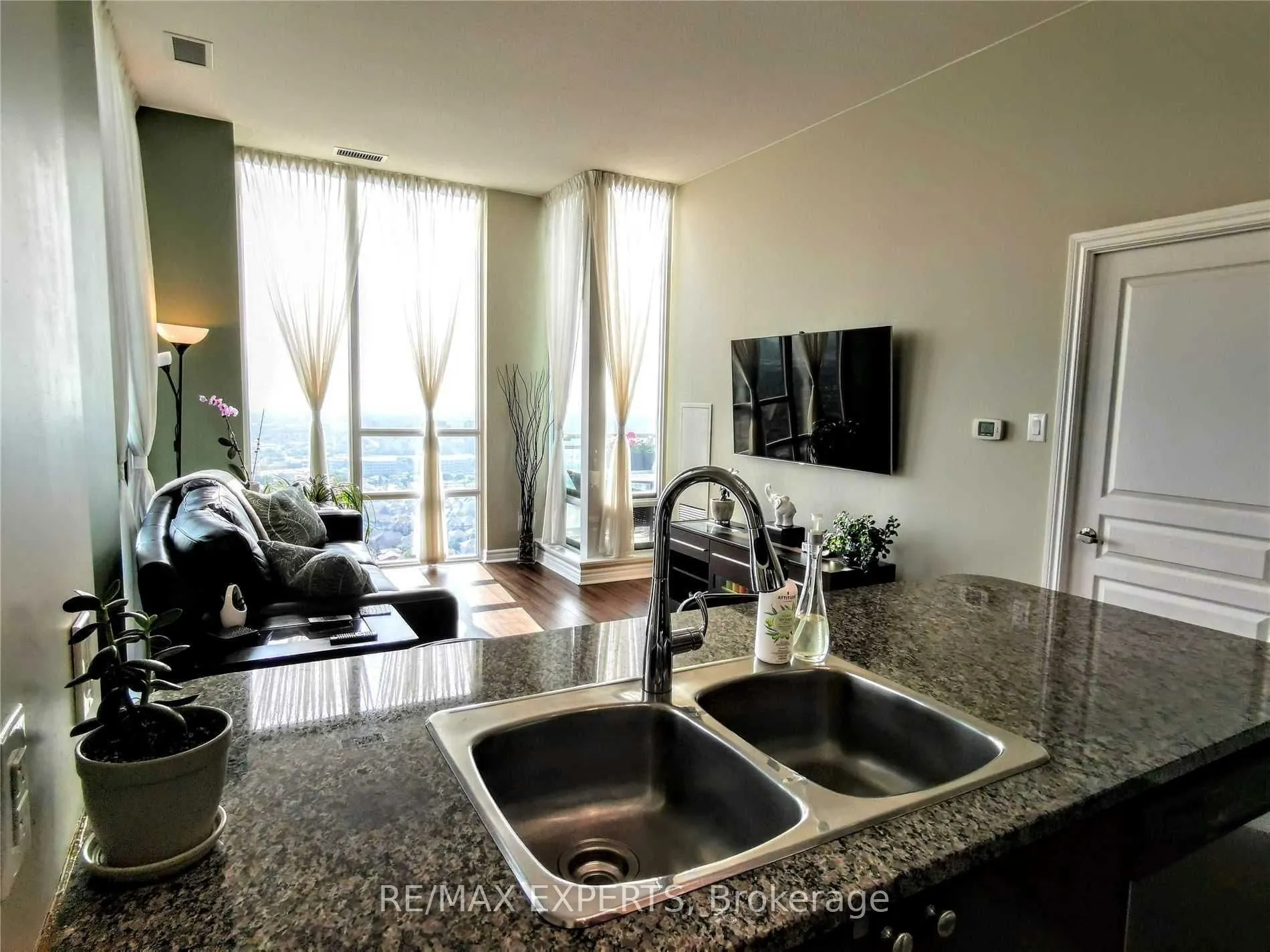 Experience the height of penthouse living in the heart of Mississauga! This stunning 2+1 bedroom suite offers over 1,000 sq. ft. of elegant living space, complete with two private balconies and TWO PARKING SPOTS! Soaring 10-ft ceilings and floor-to-ceiling windows capture sweeping southeast views of the city skyline and Lake Ontario, filling the home with natural light.Designed for contemporary living, the open-concept layout features granite countertops, amodern backsplash, rich hardwood floors, and stainless steel appliances for a refined, sleeklook.Perfectly located just steps from Square One, transit, fine dining, and world-class entertainment, this penthouse blends luxury with everyday convenience. A true must-see for anyone seeking sophisticated urban living at its finest.