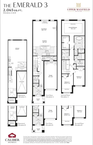 Upper Mayfield Estates by Caliber Homes located at Mayfield Rd & Airport Rd, Brampton. Welcome to the highly sought-after Emerald 3, Elevation B Model offering 2,065 sq ft of thoughtfully designed living space. This brand-new pre-construction 2 Storey townhome with backyard features a bright open-concept layout with a spacious Great Room (optional electric fireplace), chef-inspired kitchen, and large breakfast area ideal for everyday living and entertaining. Functional mudroom with direct access from the integrated garage, plus welcoming foyer and covered front porch. Upstairs includes a grand primary suite with coffered ceilings, walk-in closet and spa-inspired ensuite, along with spacious secondary bedrooms and the option for a 4-bedroom configuration. Laundry conveniently located on the bedroom level. Unfinished basement includes cold cellar and space for future bedroom, bath, rec room, office or gym. Minutes to transit, parks, schools and shopping.