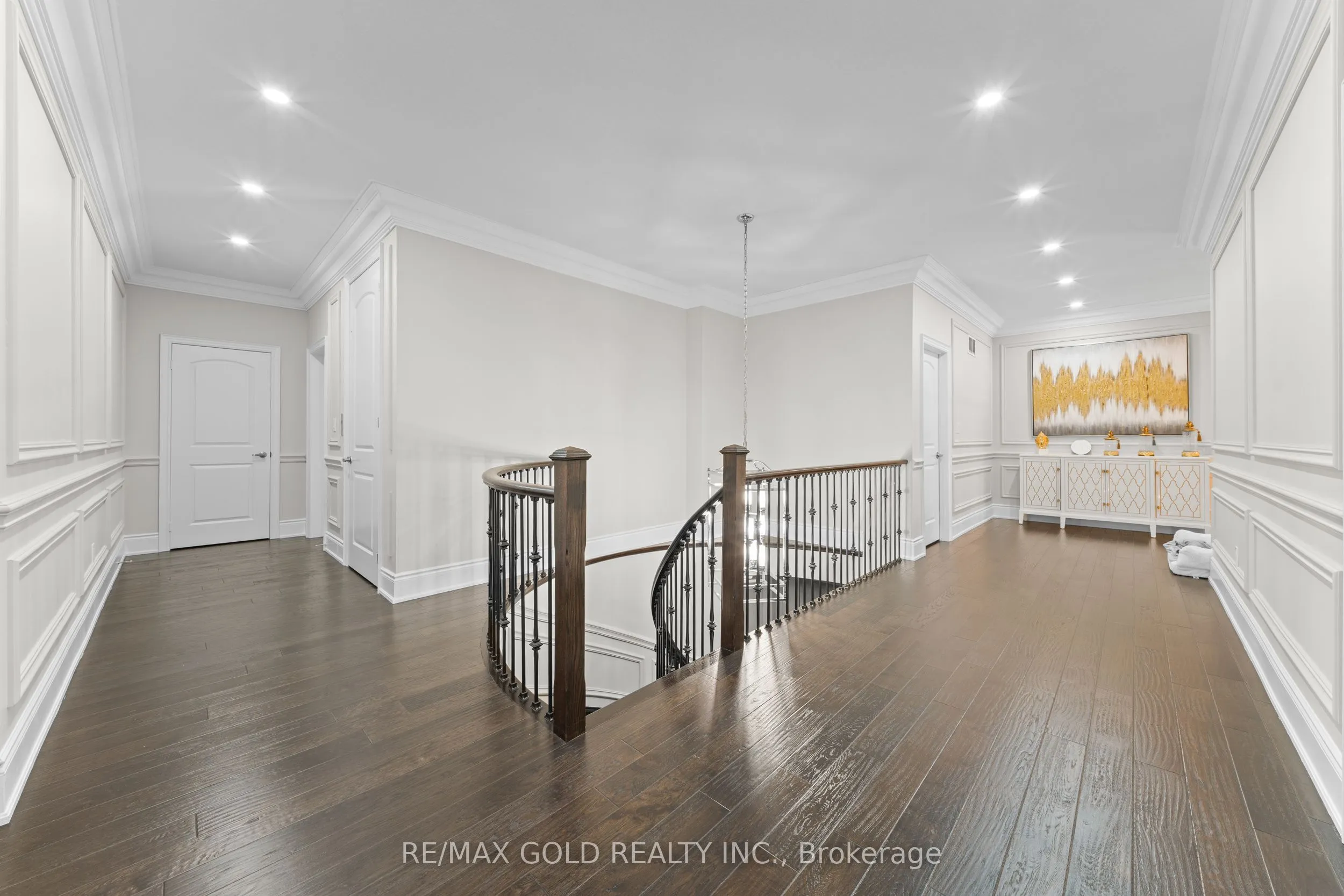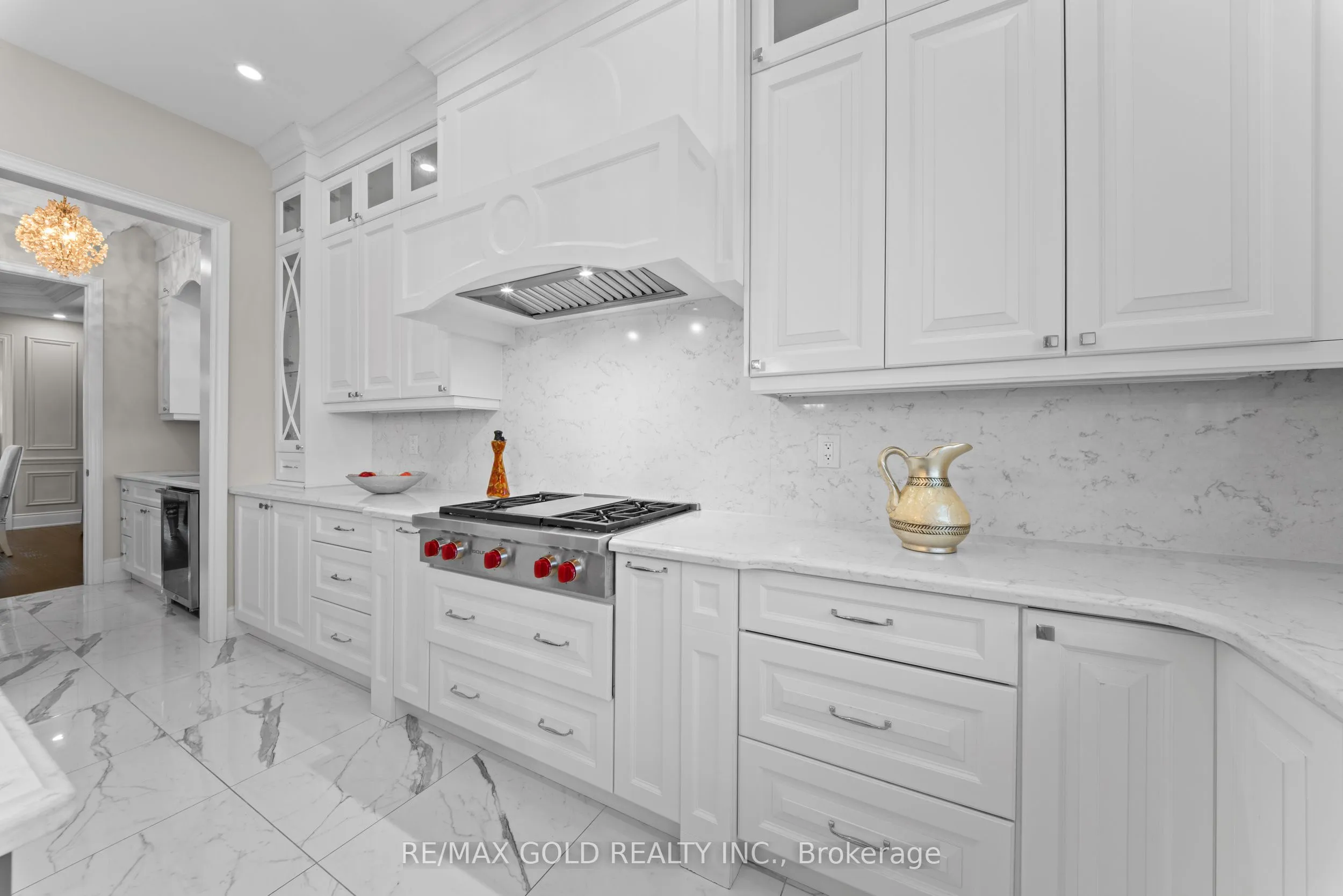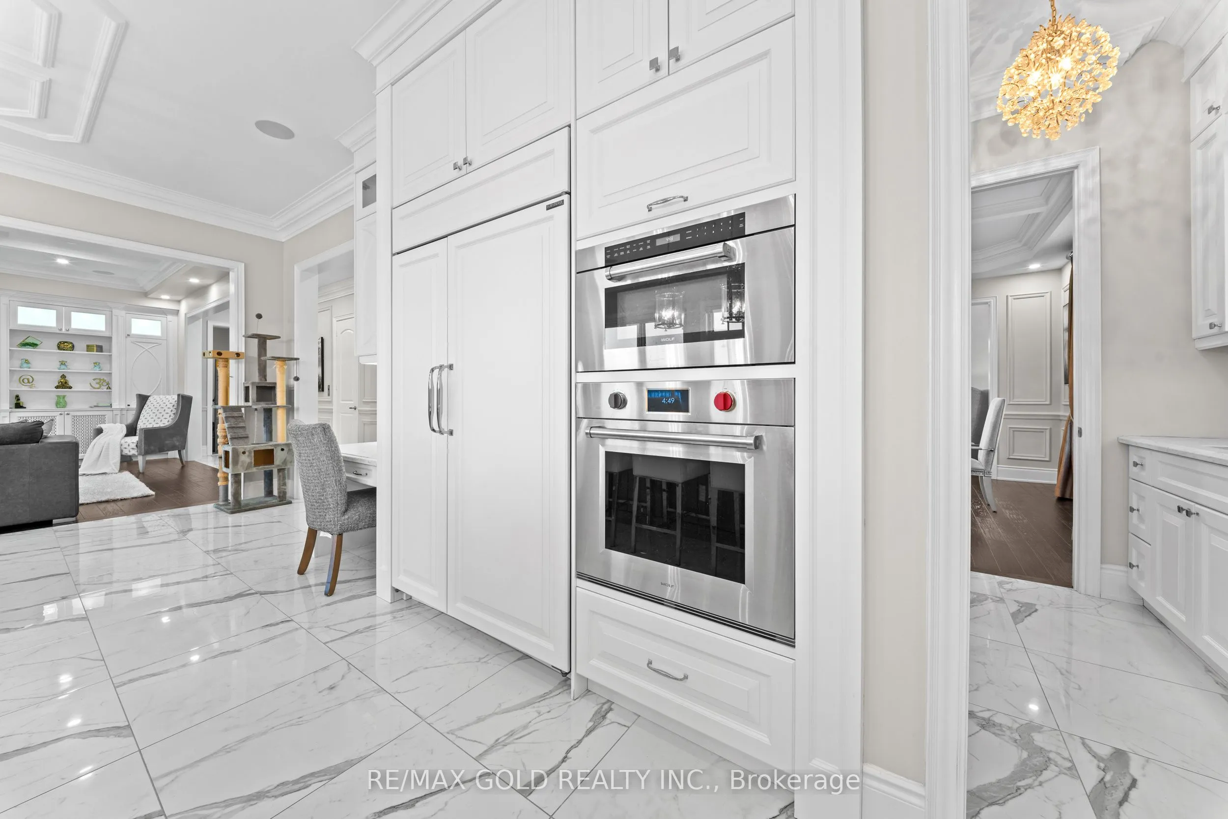 Welcome to 34 Yellowhammer Cres, an exceptional custom-built luxury detached residence situated on a rare 75.8 -ft wide premium Ravine lot with a Walk-Out Basement. This one-of-a-kind home offers a 3+1 (4-car) Garage, an impressive 9-Car private driveway, and a 8 feet grand double-door entrance, delivering outstanding curb appeal and functionality.A PRIVATE ELEVATOR services all three levels-basement, main floor, and second floor-a rare and highly desirable feature. The home boasts 10-ft ceilings on the main floor and 9-ft ceilings on the second floor and basement, complemented by high-end chandeliers, extensive pot lighting, custom wainscoting, and crown molding throughout.The main floor offers an elegant and functional layout with separate formal living and dining rooms, a large office, Servery with wet bar, walk-in pantry, breakfast area, family room, laundry, and mudroom. The living room features an open-to-above ceiling, gas fireplace, and large windows. The show-stopping chef’s kitchen includes extended custom cabinetry, commercial-grade WOLF/SUB-ZERO Appliances, oversized island with undermount sink, quartz countertops and backsplash, upper cabinets, and a built-in recipe desk. The family room showcases a custom coffered ceiling, built-in cabinetry, gas fireplace, and ravine views.The second floor features 4 spacious bedrooms, all with private ensuite washrooms. The primary suite offers a 10-ft coffered ceiling, gas fireplace, large windows, a luxurious 6-pc ensuite with freestanding tub, frameless glass shower, private toilet room, and a walk-in closet with custom organizers.The finished walk-out basement includes 2 large bedrooms, each with attached 4-pc ensuite washrooms, recreation and sitting areas, party space, gym area, a luxury powder room, and rough-ins for bar, sauna, or kitchen. Additional features include 2 owned furnaces, 2 owned A/C units, owned hot water tank, exterior pot lights, and upgraded driveway lighting. A true luxury offering.