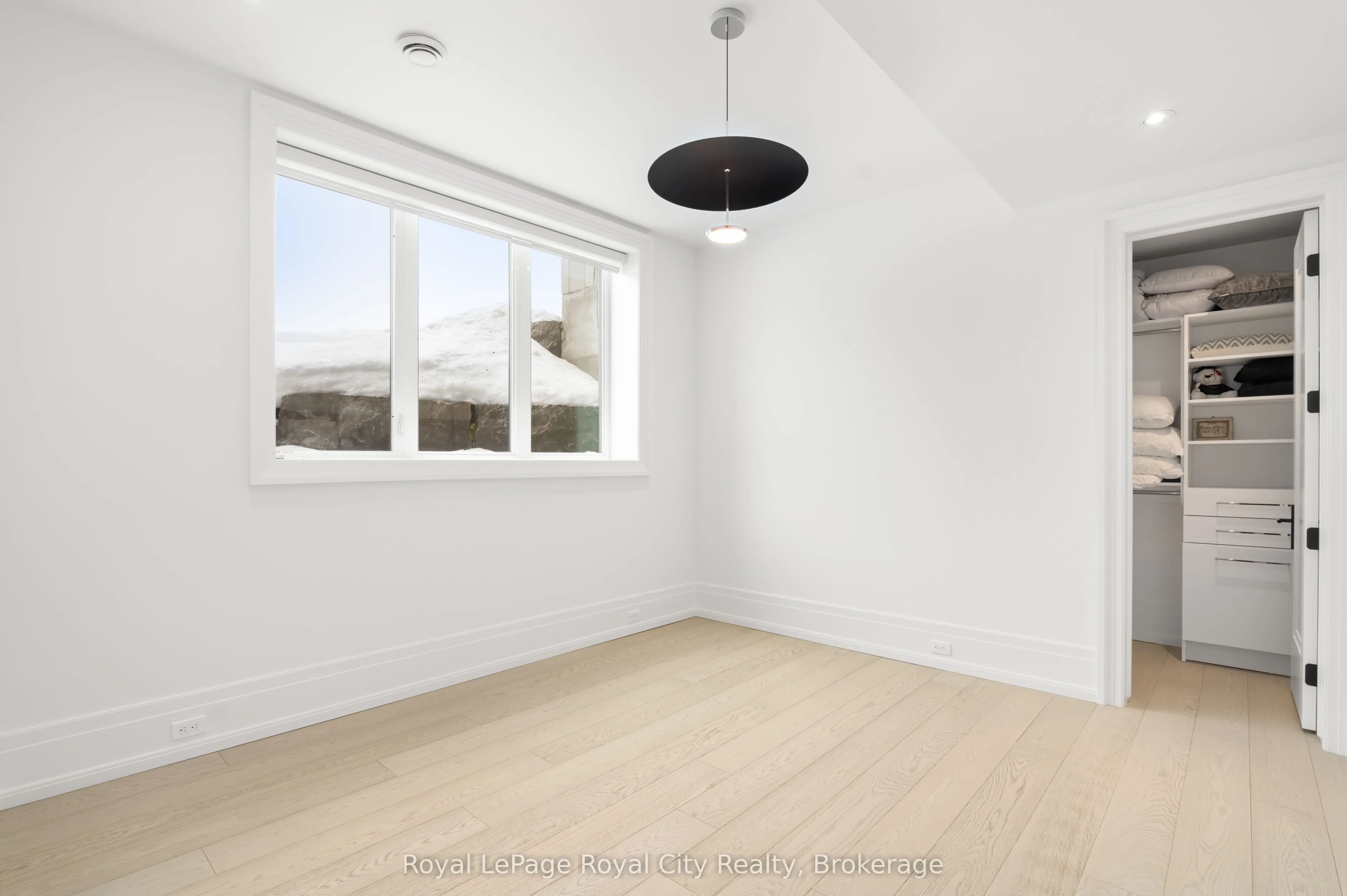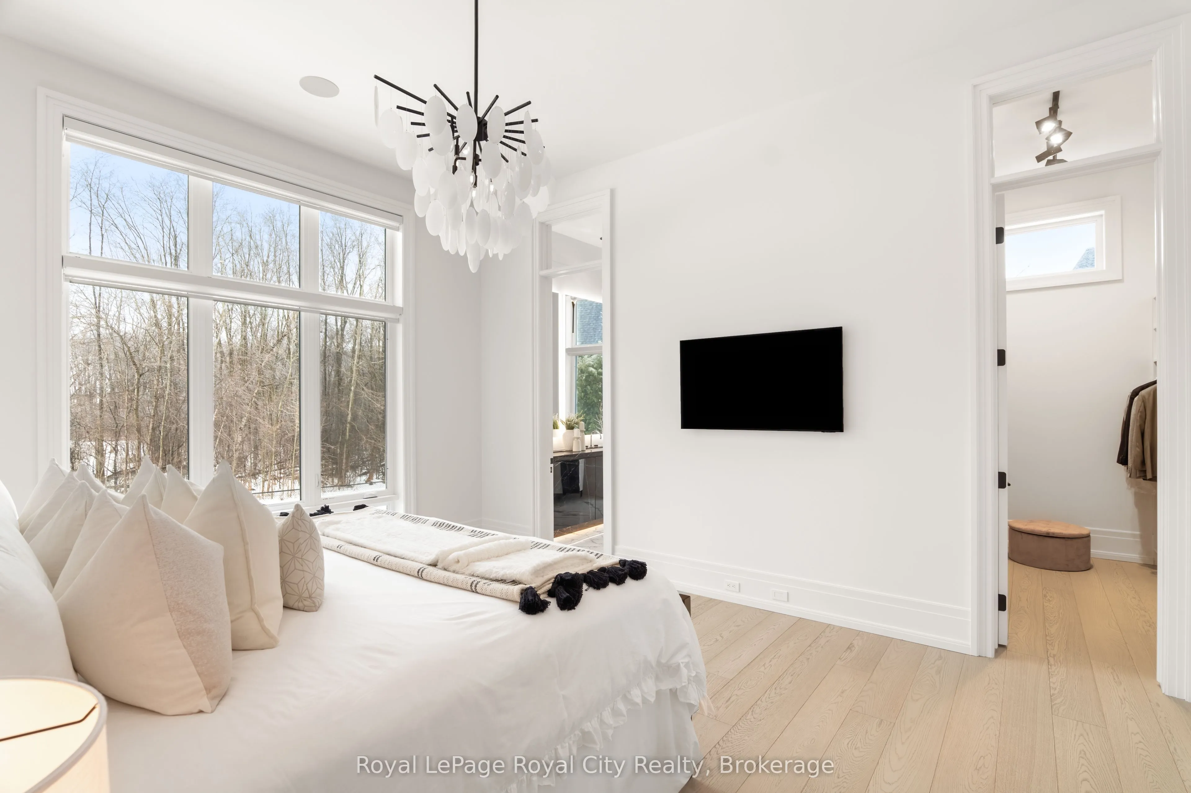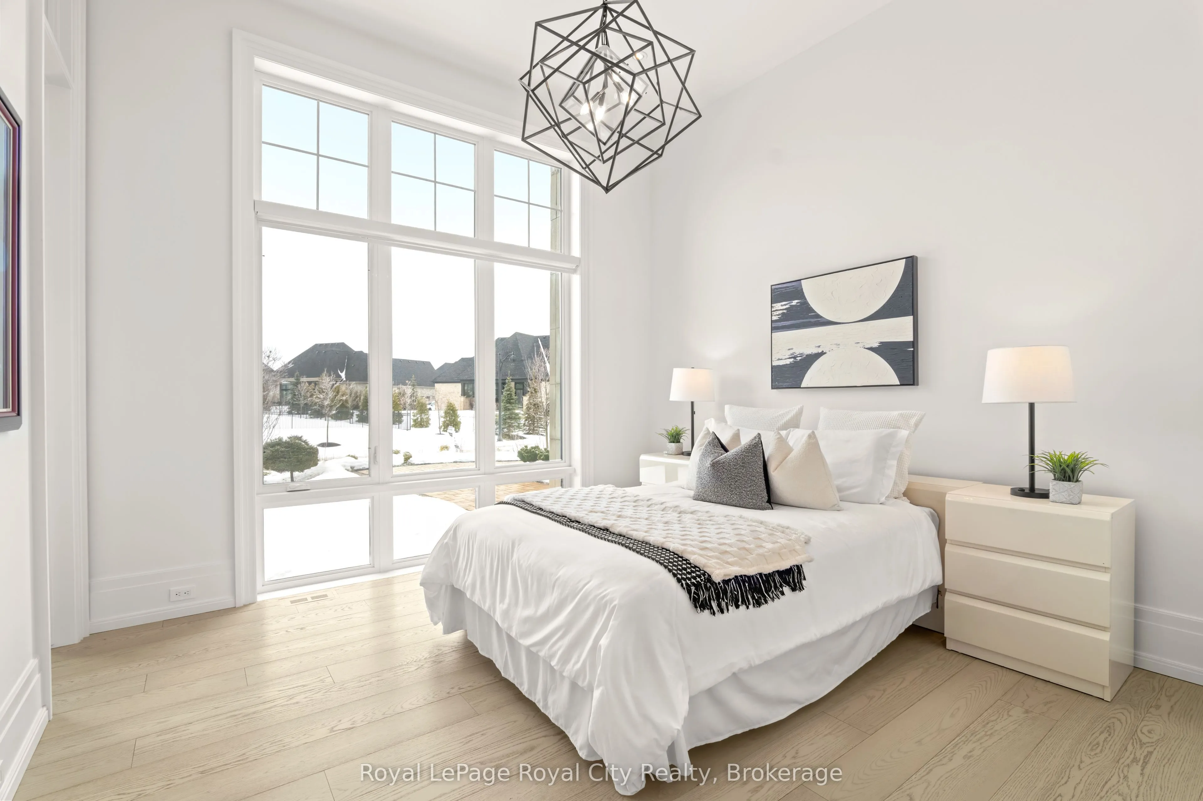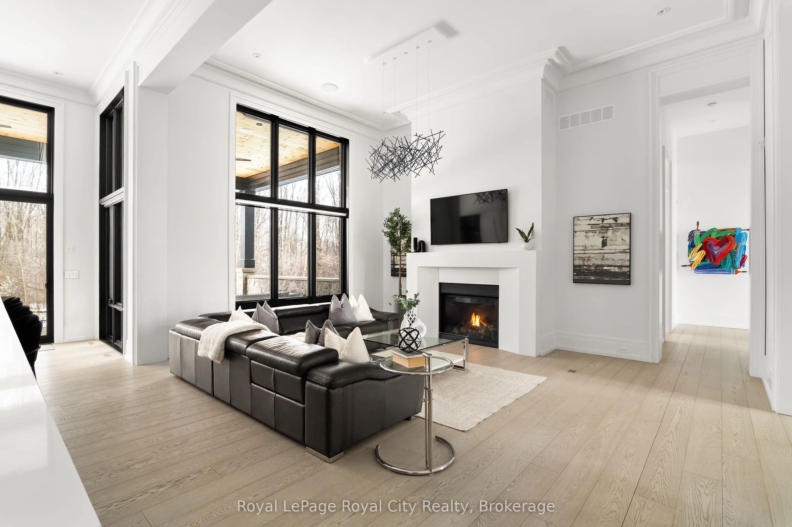 Welcome to life inside Heritage Lake Estates – a private, gated enclave in Puslinch known for its mature surroundings and beautiful custom homes. Set on a premium half-acre pie-shaped lot backing onto mature treelines, this custom stone bungalow offers privacy without compromise. With 2,252 square feet on the main floor and soaring 14-foot ceilings, the principal living space is defined by symmetry, scale, and natural light. A custom fireplace anchors the living room, while upgraded crown moulding and floor-to-ceiling windows create a refined yet inviting atmosphere.The kitchen and dining area are gallery-inspired in design, centred around a striking 21-foot stone waterfall island with seating for eight. Integrated cabinetry conceals premium WOLF appliances for a seamless aesthetic. Heated floors, custom lighting, and electric blinds reflect the many thoughtful upgrades woven throughout the home. Step outside to a covered back patio complete with built-in heaters and an impressive 350 sq ft gas fire feature, overlooking the fenced yard and tranquil forest backdrop – ideal for elevated, year-round outdoor living.The primary suite is a private retreat, offering 12ft ceilings, floor to ceiling windows, a generous walk-in closet and spa-inspired five-piece ensuite with Jet Spa shower system. Across from this, the well-appointed laundry room and additional main-floor bedroom, featuring with its own ensuite bath and walk-in closet, complete the main level. The fully finished lower level adds two bedrooms, each accompanied by an ensuite bathroom, a spacious recreation room with custom fireplace, dedicated office space, and a home gym – perfectly suited for growing families or multi-generational living. A functional mudroom with built-in cabinetry offers direct access to the heated three-car garage and walk-down access to the basement. 153 Heritage Lake Drive invites you to embrace a quiet kind of luxury, framed by the serenity of Puslinch Lake.