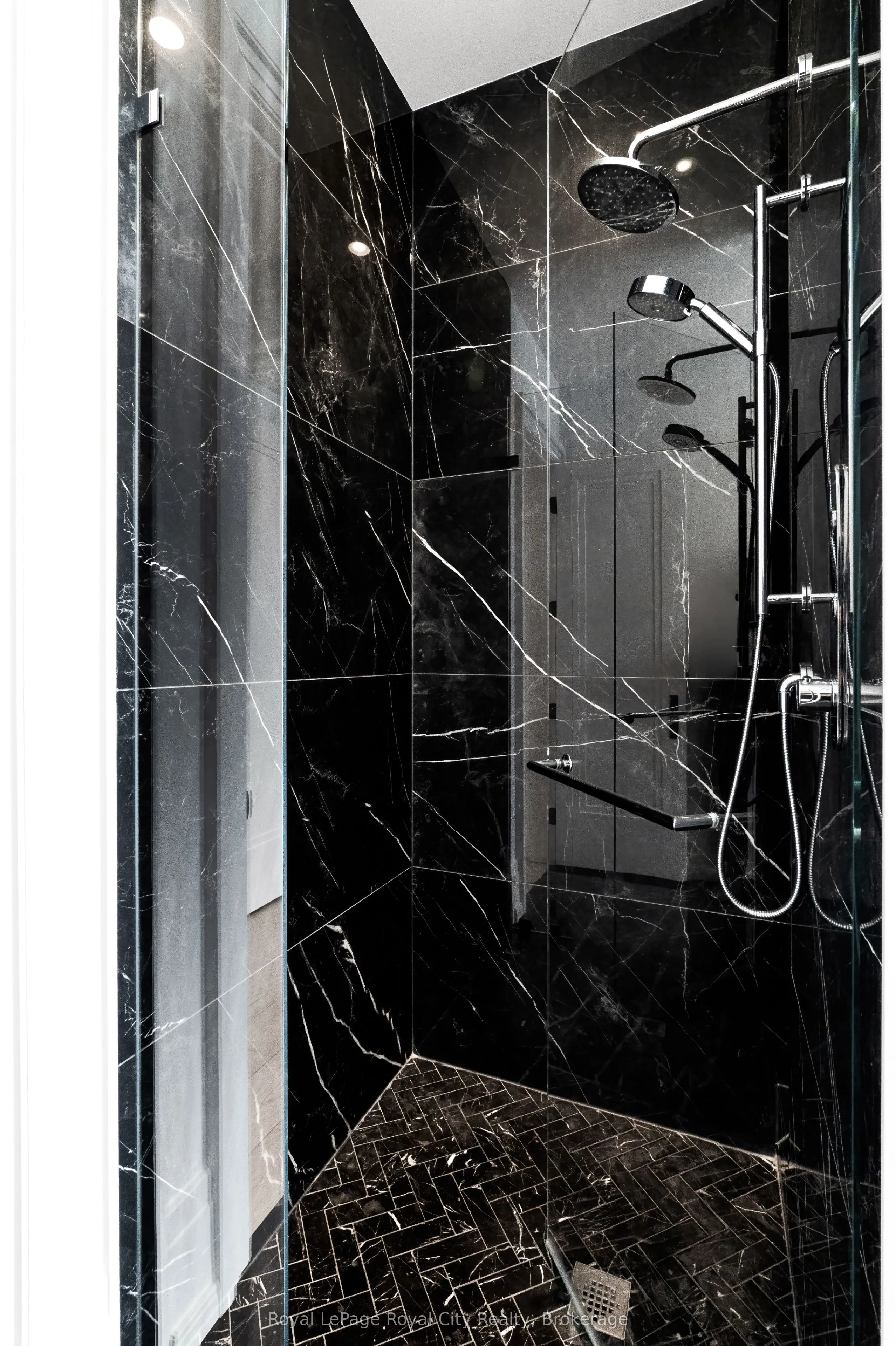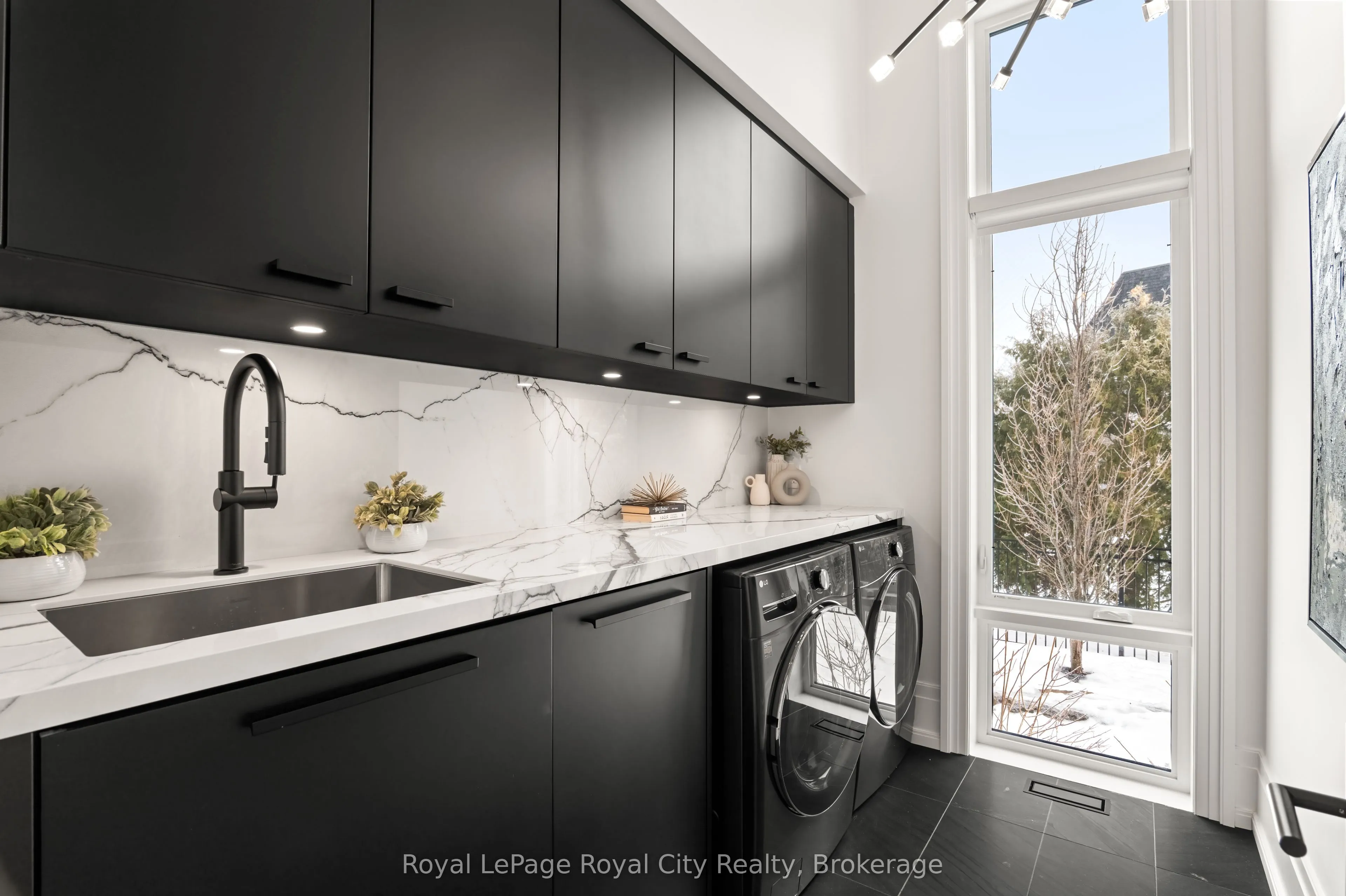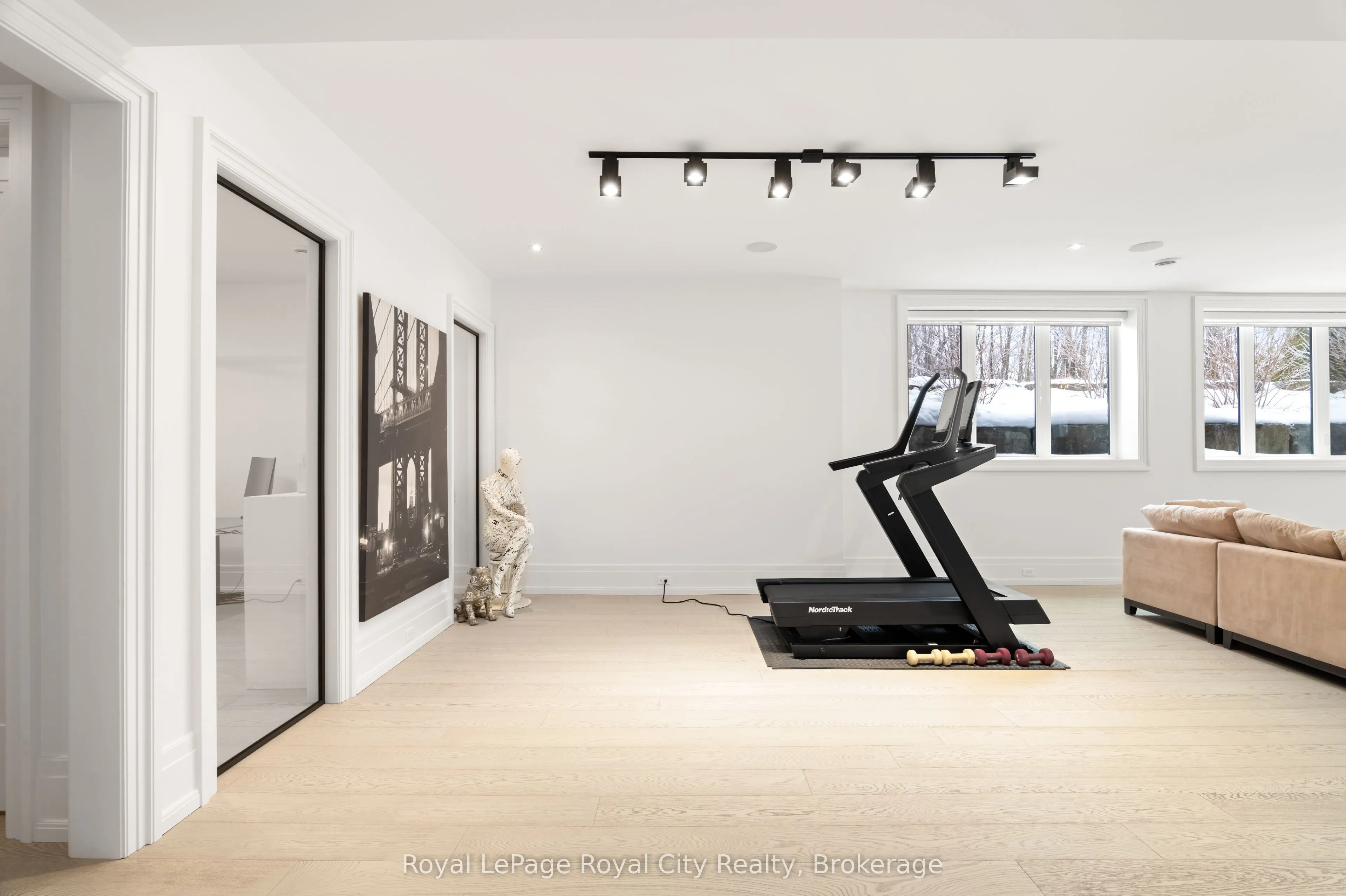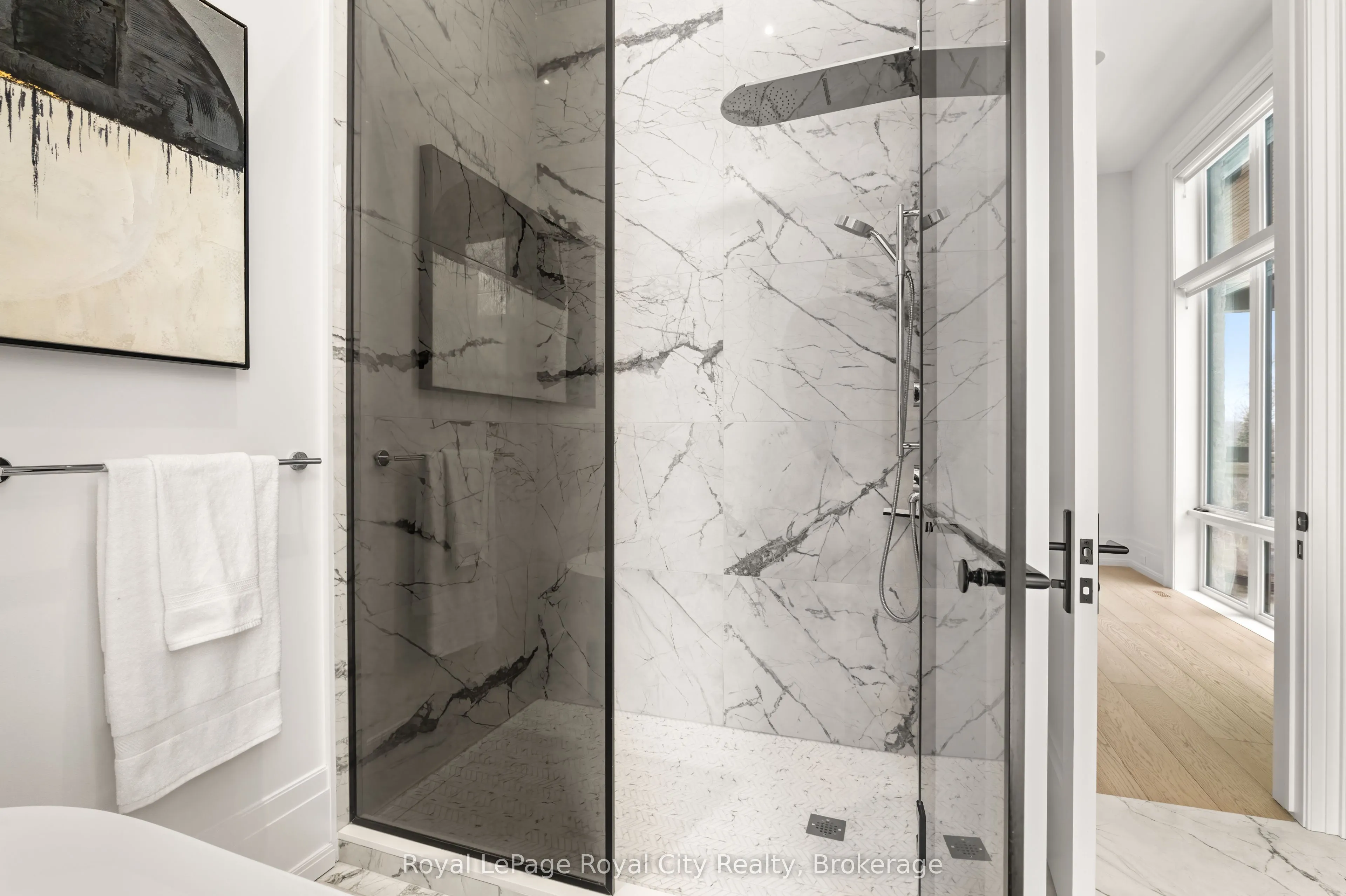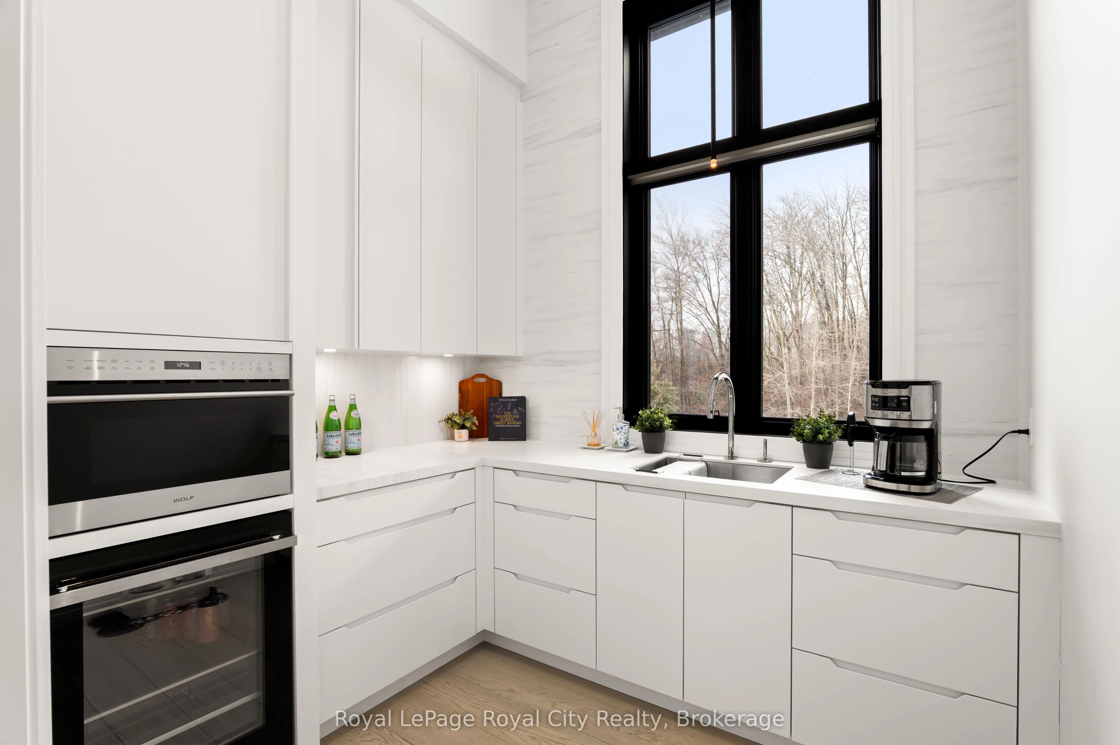 Welcome to life inside Heritage Lake Estates – a private, gated enclave in Puslinch known for its mature surroundings and beautiful custom homes. Set on a premium half-acre pie-shaped lot backing onto mature treelines, this custom stone bungalow offers privacy without compromise. With 2,252 square feet on the main floor and soaring 14-foot ceilings, the principal living space is defined by symmetry, scale, and natural light. A custom fireplace anchors the living room, while upgraded crown moulding and floor-to-ceiling windows create a refined yet inviting atmosphere.The kitchen and dining area are gallery-inspired in design, centred around a striking 21-foot stone waterfall island with seating for eight. Integrated cabinetry conceals premium WOLF appliances for a seamless aesthetic. Heated floors, custom lighting, and electric blinds reflect the many thoughtful upgrades woven throughout the home. Step outside to a covered back patio complete with built-in heaters and an impressive 350 sq ft gas fire feature, overlooking the fenced yard and tranquil forest backdrop – ideal for elevated, year-round outdoor living.The primary suite is a private retreat, offering 12ft ceilings, floor to ceiling windows, a generous walk-in closet and spa-inspired five-piece ensuite with Jet Spa shower system. Across from this, the well-appointed laundry room and additional main-floor bedroom, featuring with its own ensuite bath and walk-in closet, complete the main level. The fully finished lower level adds two bedrooms, each accompanied by an ensuite bathroom, a spacious recreation room with custom fireplace, dedicated office space, and a home gym – perfectly suited for growing families or multi-generational living. A functional mudroom with built-in cabinetry offers direct access to the heated three-car garage and walk-down access to the basement. 153 Heritage Lake Drive invites you to embrace a quiet kind of luxury, framed by the serenity of Puslinch Lake.