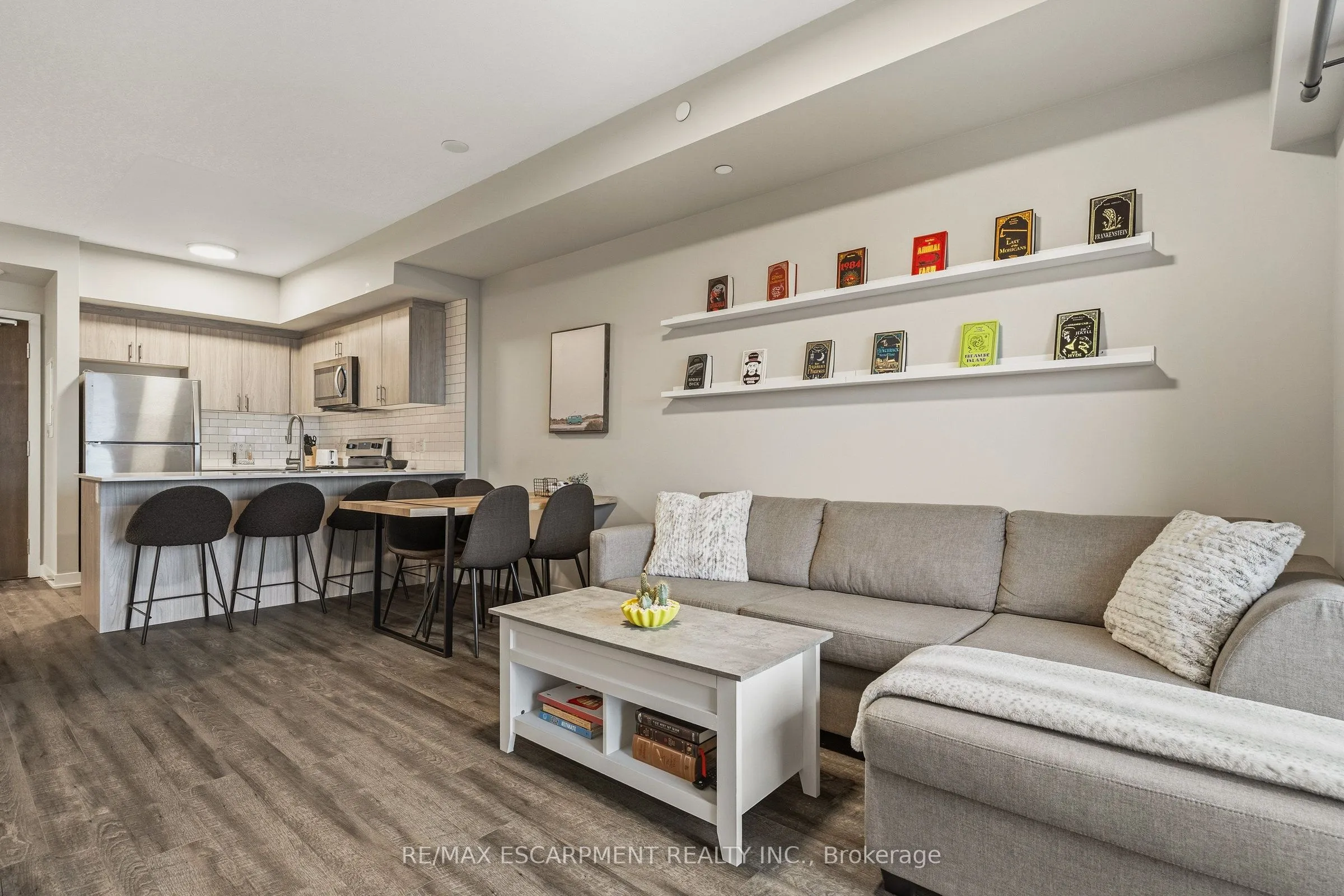 Step into elevated living in this recently built, beautifully appointed condo in a fantastic Ancaster community. Designed with style and comfort in mind, this 1-bedroom, 1.5-bath suite delivers the perfect blend of modern luxury and everyday ease. The open-concept layout feels airy and inviting, anchored by a stunning chef-inspired kitchen featuring sleek stainless steel appliances, quartz countertops, subway tile backsplash, contemporary cabinetry, and a generous breakfast bar made for casual mornings or hosting friends. Soaring 9-foot ceilings and expansive windows flood the living space with natural light, creating a bright, sophisticated atmosphere throughout. The primary retreat is a true standout, complete with a large picture window, a spa-like ensuite, and a walk-in closet outfitted with a custom organization system. In-suite laundry adds everyday convenience, while your private balcony offers the perfect spot to unwind and catch sunset views. Enjoy a carefree lifestyle with exceptional building amenities, including a fully equipped fitness centre, dedicated yoga studio, and an impressive party room with full kitchen that opens onto a landscaped terrace featuring BBQs and cozy gas fire tables. Underground parking, a private locker, and access to two EV charging stations add even more value. Ideally located just minutes from shopping, dining, trails, community centres, and only a short drive to Mc Master and Redeemer University, this upgraded, move-in-ready condo is your opportunity to enjoy refined, maintenance-free living from day one.