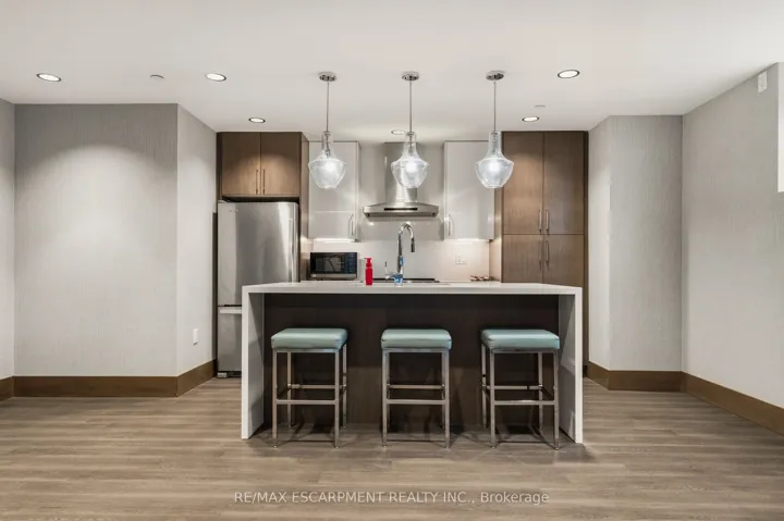 Step into elevated living in this recently built, beautifully appointed condo in a fantastic Ancaster community. Designed with style and comfort in mind, this 1-bedroom, 1.5-bath suite delivers the perfect blend of modern luxury and everyday ease. The open-concept layout feels airy and inviting, anchored by a stunning chef-inspired kitchen featuring sleek stainless steel appliances, quartz countertops, subway tile backsplash, contemporary cabinetry, and a generous breakfast bar made for casual mornings or hosting friends. Soaring 9-foot ceilings and expansive windows flood the living space with natural light, creating a bright, sophisticated atmosphere throughout. The primary retreat is a true standout, complete with a large picture window, a spa-like ensuite, and a walk-in closet outfitted with a custom organization system. In-suite laundry adds everyday convenience, while your private balcony offers the perfect spot to unwind and catch sunset views. Enjoy a carefree lifestyle with exceptional building amenities, including a fully equipped fitness centre, dedicated yoga studio, and an impressive party room with full kitchen that opens onto a landscaped terrace featuring BBQs and cozy gas fire tables. Underground parking, a private locker, and access to two EV charging stations add even more value. Ideally located just minutes from shopping, dining, trails, community centres, and only a short drive to Mc Master and Redeemer University, this upgraded, move-in-ready condo is your opportunity to enjoy refined, maintenance-free living from day one.