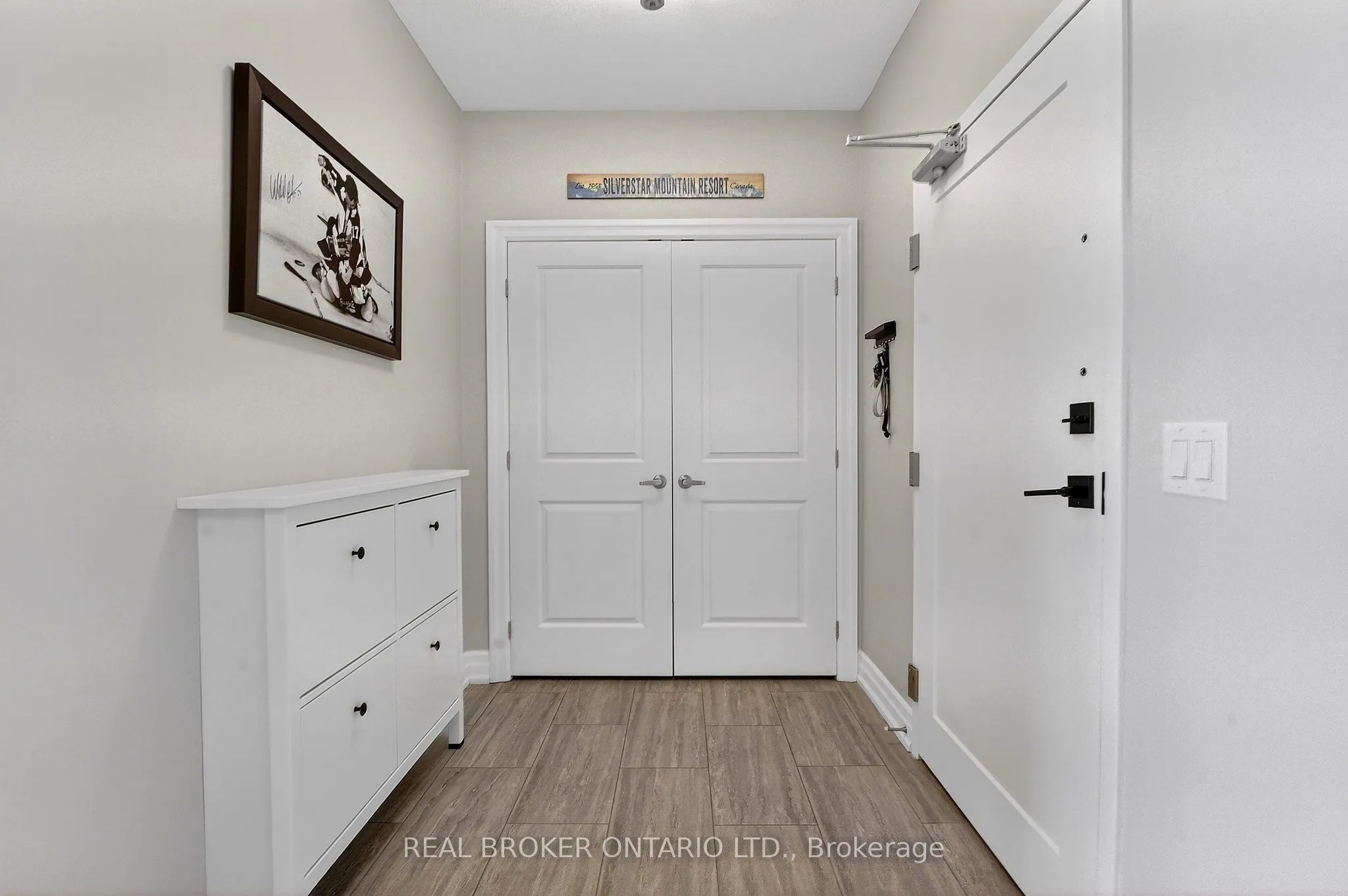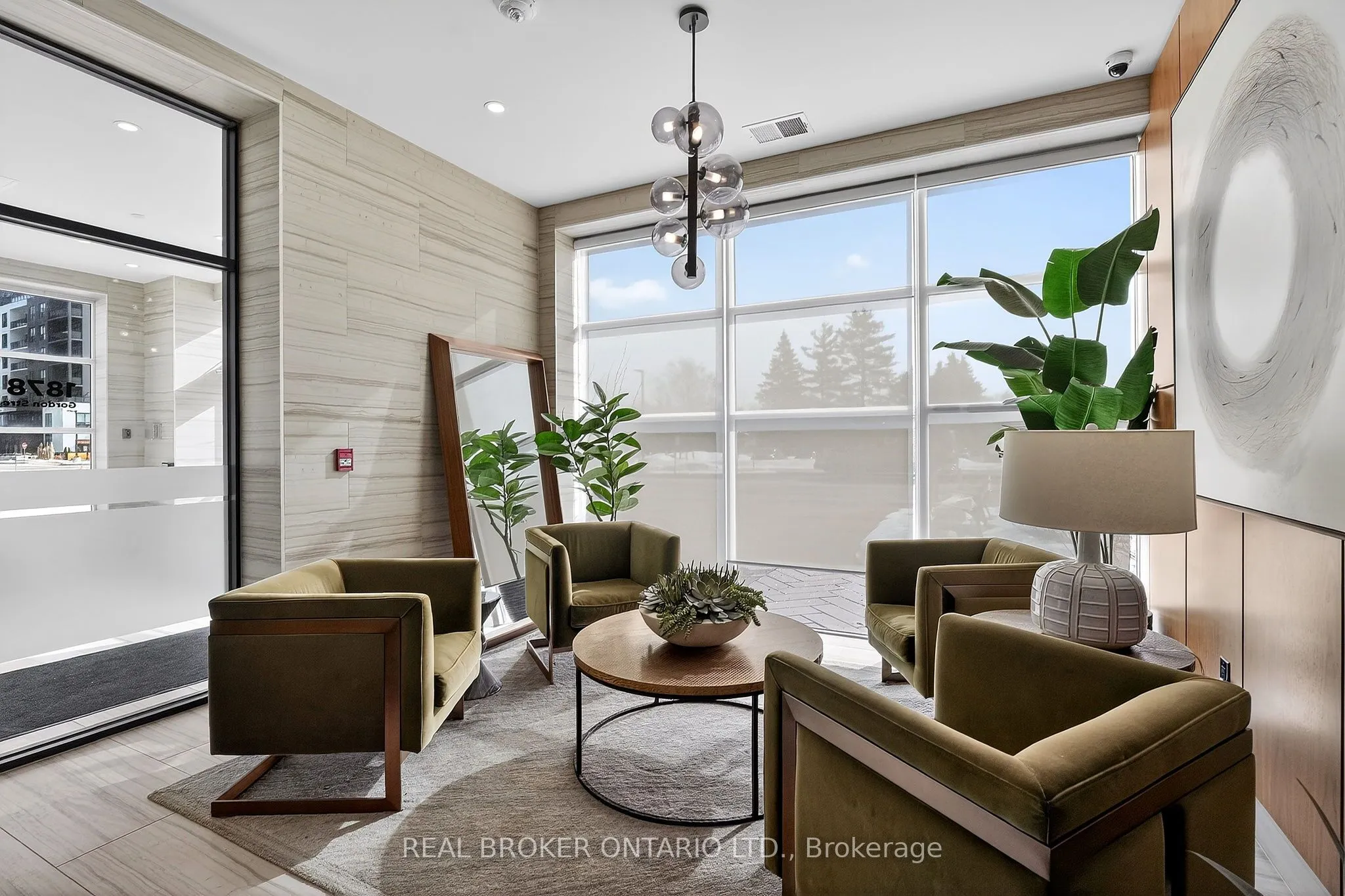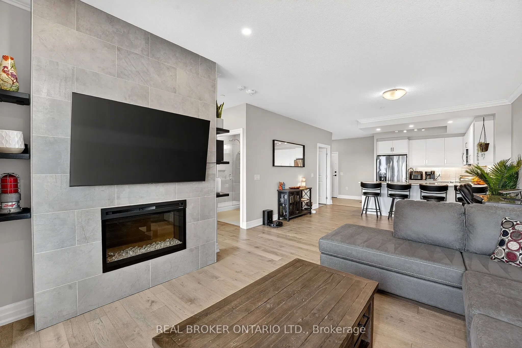 Welcome to Guelph’s premier residence at Gordon Square – where easy, maintenance-free living meets luxury. This incredibly bright, airy, oversized one-bedroom with upscale finishes is so much more than a condominium residence. Live, work, and play. The unit boasts 894 sq ft of interior finished space, complemented by a 69 sq ft balcony, giving you nearly 1,000 sq ft of usable space. With 9-foot ceilings throughout, the suite feels open, inviting, and exceptionally welcoming. Come home to a floor plan that makes sense and is wheelchair accessible. The U-shaped kitchen with breakfast bar gracefully overlooks the living areas and provides ample space to cook with a partner. The white-on-white kitchen, complemented by light neutral flooring, creates a calm and inviting atmosphere. Locally famous Barzotti cabinetry, quartz counters, stainless steel appliances, engineered hardwood, a fireplace with floor-to-ceiling tile surround, a luxury glass-walled walk-in shower, and an in-suite laundry room with extra storage complete the space. One underground parking space and a storage locker are included. Not only is the unit itself impressive, but the dedicated amenity spaces are unparalleled. From the stylish, sophisticated lobby to the state-of-the-art golf simulator, professional fitness centre, fully appointed guest suite, and all the way up to the 13th-floor skylounge – you will feel proud to call this home. Invite friends to play a game of pool, host a BBQ, or practice your golf swing. Tons of indoor visitor parking. Whatever your desire, Gordon Square will keep you active. Come and fall in love with the convenience and simplicity of living in a modern condo in the heart of Guelph’s most desirable, amenity-rich neighbourhood. Groceries, restaurants, a movie theatre, convenient access to the 401, and so much more are just steps away. You can leave the car at home – everything is here.