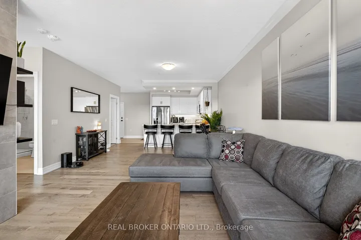 Welcome to Guelph’s premier residence at Gordon Square – where easy, maintenance-free living meets luxury. This incredibly bright, airy, oversized one-bedroom with upscale finishes is so much more than a condominium residence. Live, work, and play. The unit boasts 894 sq ft of interior finished space, complemented by a 69 sq ft balcony, giving you nearly 1,000 sq ft of usable space. With 9-foot ceilings throughout, the suite feels open, inviting, and exceptionally welcoming. Come home to a floor plan that makes sense and is wheelchair accessible. The U-shaped kitchen with breakfast bar gracefully overlooks the living areas and provides ample space to cook with a partner. The white-on-white kitchen, complemented by light neutral flooring, creates a calm and inviting atmosphere. Locally famous Barzotti cabinetry, quartz counters, stainless steel appliances, engineered hardwood, a fireplace with floor-to-ceiling tile surround, a luxury glass-walled walk-in shower, and an in-suite laundry room with extra storage complete the space. One underground parking space and a storage locker are included. Not only is the unit itself impressive, but the dedicated amenity spaces are unparalleled. From the stylish, sophisticated lobby to the state-of-the-art golf simulator, professional fitness centre, fully appointed guest suite, and all the way up to the 13th-floor skylounge – you will feel proud to call this home. Invite friends to play a game of pool, host a BBQ, or practice your golf swing. Tons of indoor visitor parking. Whatever your desire, Gordon Square will keep you active. Come and fall in love with the convenience and simplicity of living in a modern condo in the heart of Guelph’s most desirable, amenity-rich neighbourhood. Groceries, restaurants, a movie theatre, convenient access to the 401, and so much more are just steps away. You can leave the car at home – everything is here.