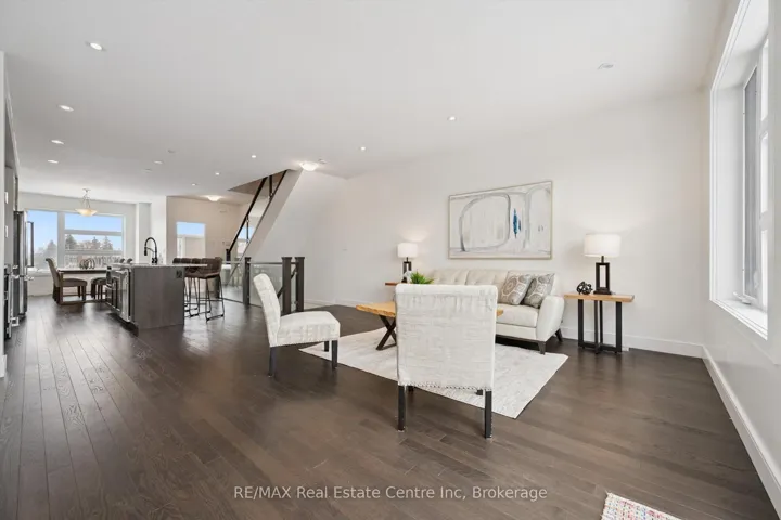 Upscale 2286sqft, 3-storey townhome located in award-winning complex in Guelph’s highly sought-after south end! Backing onto greenspace this home boasts one of the best positions in the community offering unobstructed views from the front & rear of the unit. With 3 bdrms, 3 bathrooms & potential for add’l bdrms this home delivers privacy, functionality & lifestyle. Enter main level to bonus room filled W/natural light from large windows & pot lighting. This space easily adapts to your lifestyle & works well as home office, secondary living room, playroom or teen retreat. Follow the chic wood & glass staircase to heart of the home where open-concept main living area truly impresses. Kitchen is designed for everyday living & entertaining W/white cabinetry that extends to the ceiling, S/S appliances, backsplash & contrasting island topped W/stone counters & bar seating. Kitchen flows seamlessly into dining area where large window creates perfect backdrop for family meals. Living room offers rich hardwood, oversized windows & sliding glass door that opens to balcony overlooking treetops. This space is ideal for morning coffee or evening unwinding offering fresh air, privacy & calming connection to nature. 2pc bath completes this level. Upstairs primary bdrm offers W/I closet, large windows & private balcony. Ensuite W/dbl vanity, stone counters & glass-enclosed shower. 2 add’l bdrms & 4pc main bath W/granite counter & shower/tub. Convenient upper-level laundry! W/O bsmt offers endless possibilities to create 4th bdrm, rec room or office. Sliding doors lead to private patio extending the space outdoors. Each level of the home enjoys stunning backdrops of mature trees & protected greenspace. Easy access to 401, Uof G bus route, GO Transit stops, trails & highly rated schools. You’re surrounded by dining options, groceries, fitness, banks & more. Stone Rd Mall & amenities are a short drive away making this an exceptional location for families, professionals & commuters!