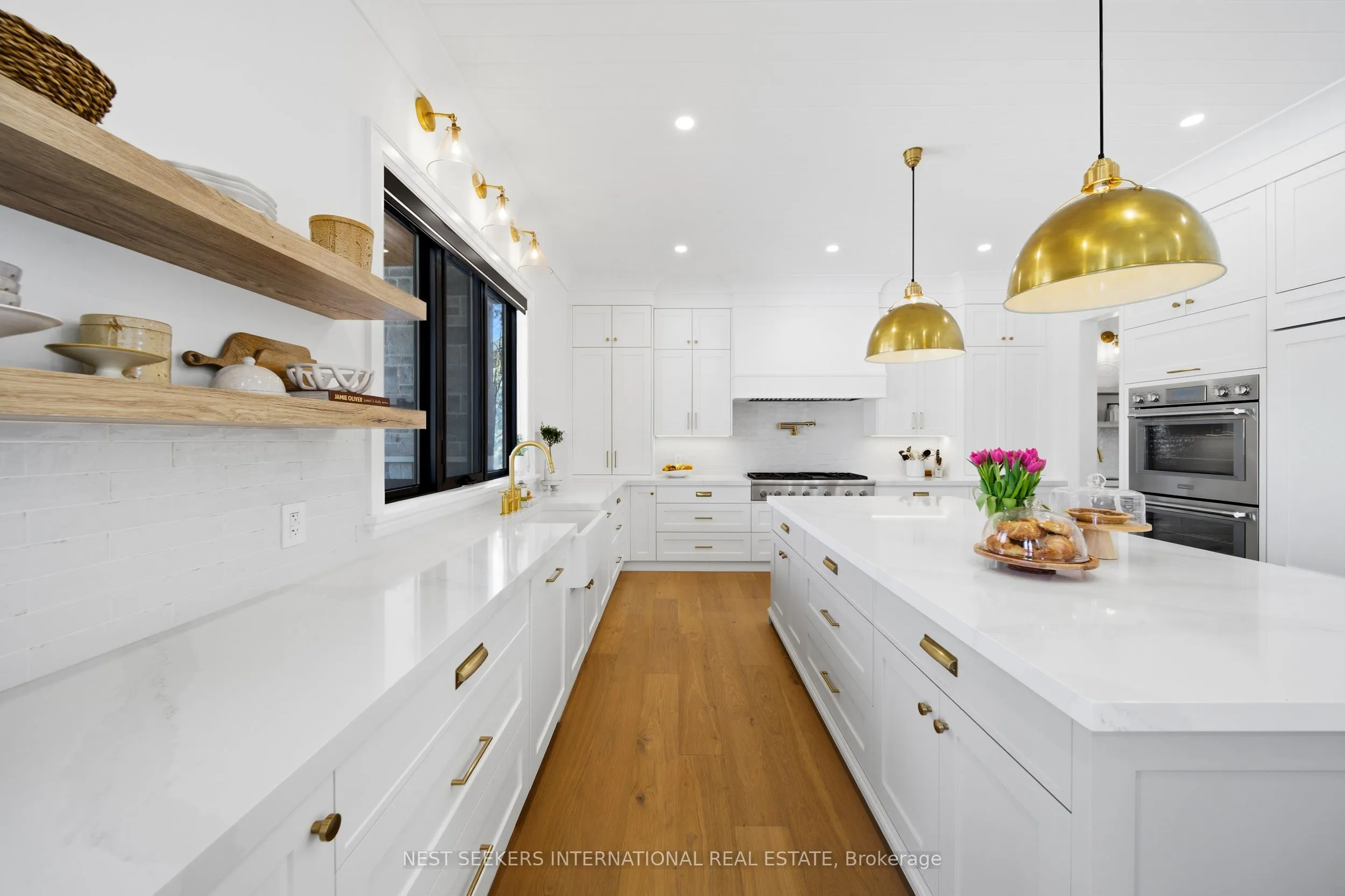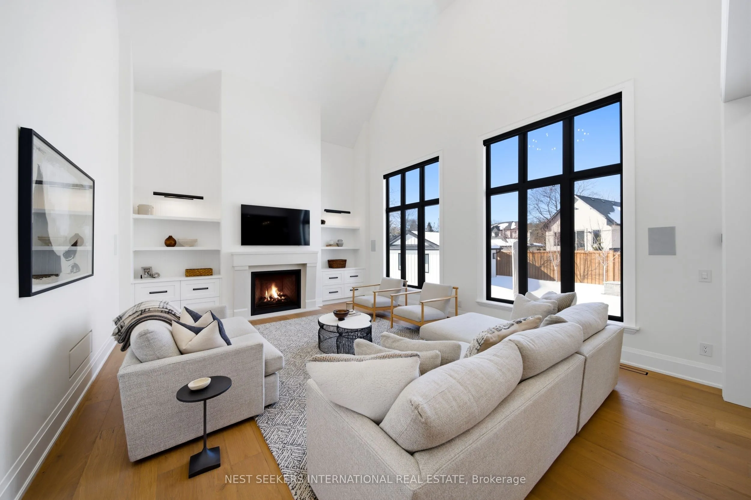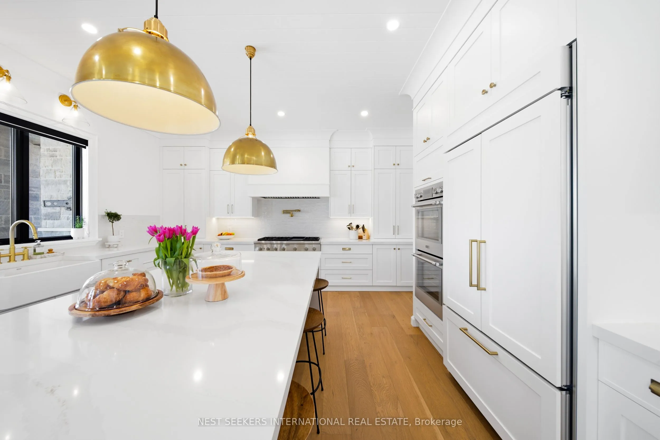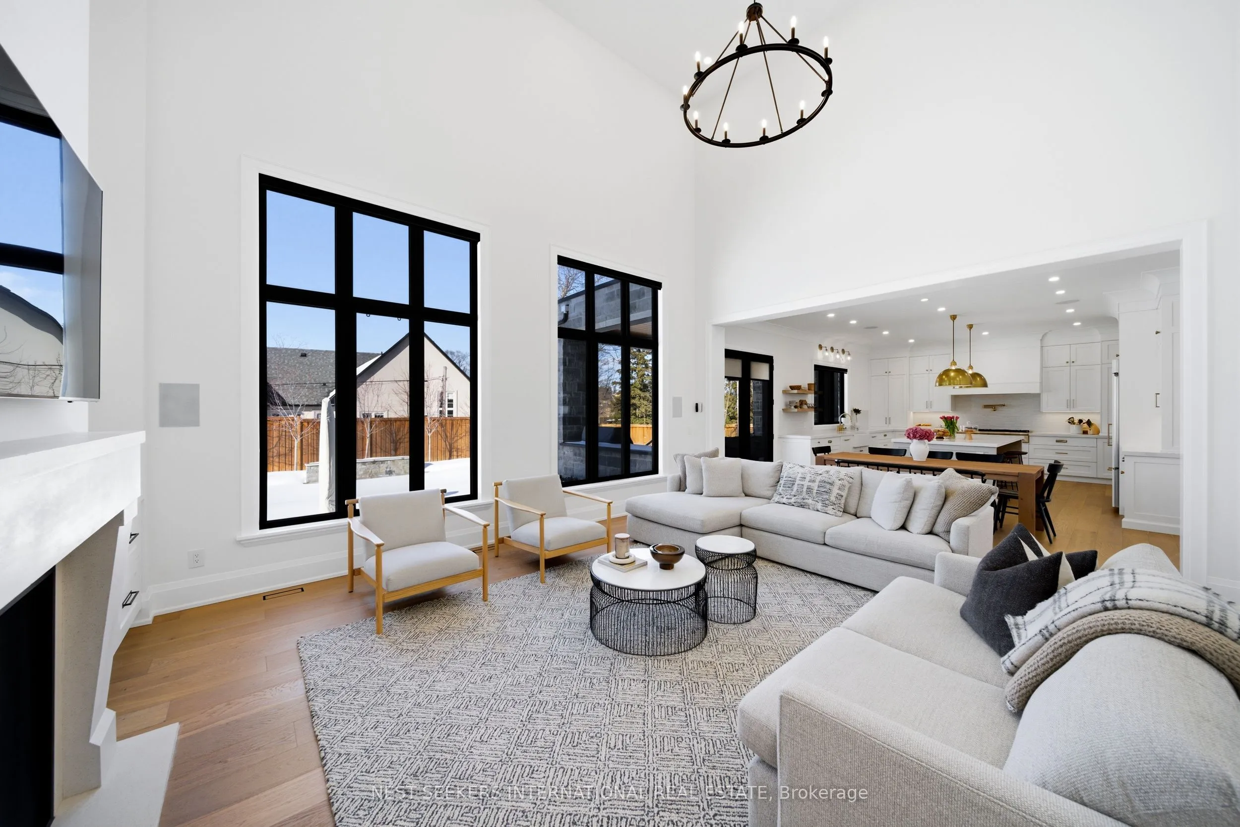 On a premium 150 ft x 148 ft lot, crafted by Fulton Homes & designed by Dero Building Designs, this custom modern farmhouse offers approx 6,500 sq ft of total finished living space, plus a finished lower level. Designed as a 4 bdrm home with option for nanny/in-law suite below. Soaring 10′ ceilings on main, 9′ on 2nd, dramatic 20′ family rm & 9.5′ lower level create exceptional volume & natural light t/o. Custom kitchen by Villa Kitchen & Cabinets features quartz counters, Thermador appls, bespoke built-ins & millwork carried into vanities & closets. Heated flrs in all washrooms, Riobel & Vogt fixtures & Vovo smart toilet in primary suite. Family rm anchored by 46″ Majestic gas f/p w custom mantel, motorized chandelier & Control4 automation. Primary retreat offers 42″ Valor linear f/p, custom paneling & motorized blinds. Control4 lighting & speakers, CAT6 t/o, dual Wi Fi incl cabana, Nest thermostats, central vac & 6-cam security w Rogers monitoring. Heated 3-car garage w 12.5′ ceilings, epoxy flrs & 9,000 lb car lift. Lower level w gym, wet bar (rough-in kitchenette/dw) & tiled cold cellar. Rear 10’x25′ covered loggia w 42″ Kingman gas f/p, TV mount & glass railings. Ext by Land Design Canada, executed by LA Landscaping, incl Hunter irrigation & Leafguard. Resort-style yard w pool by Artscape Construction Pools & 18’x18′ cabana w 3-pc bath & outdoor Kitchen Aid BBQ. Finished in Arctic White James Hardie Board w Visual Comfort lighting t/o. Exceptional design, tech & craftsmanship.