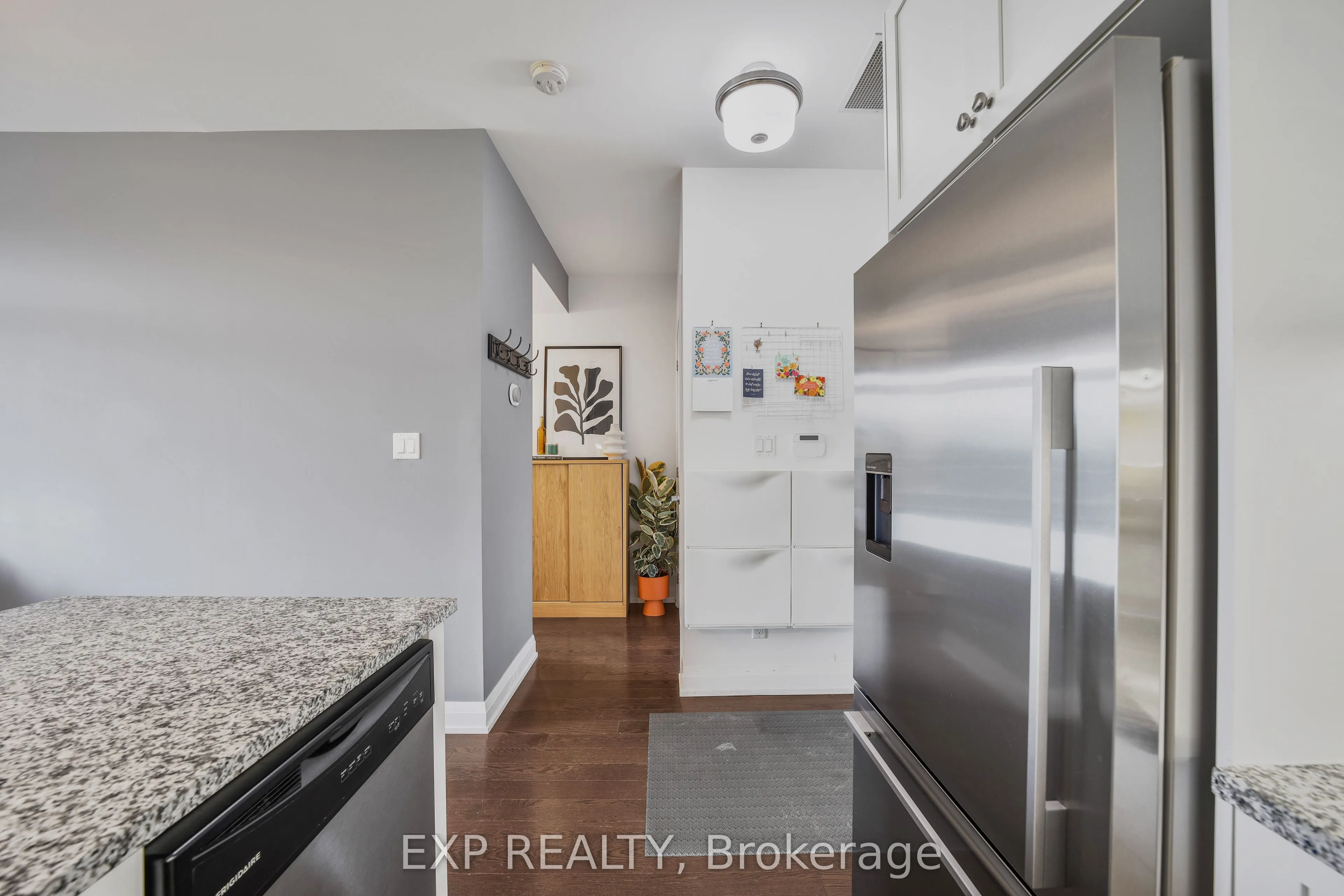 Welcome to this stunning one-bedroom suite, where modern elegance meets everyday comfort in one of Aurora’s most sought-after locations. Featuring bright, open-concept living spaces with hardwood floors throughout, designed for both style and functionality. The gourmet kitchen is a true highlight, showcasing quartz countertops, high-end stainless steel appliances, a spacious breakfast bar, and ample cabinetry – perfect for cooking, entertaining, or enjoying a quiet night in. Step outside to your private East-facing balcony with the option to BBQ, the ideal spot for dining al fresco, or unwinding with evening views. Enjoy the convenience of in-suite laundry, a thoughtfully designed layout that maximizes every square foot, and the peace of mind of a well-managed, boutique-style, pet-friendly building. Water softener and smart thermostat included! Premium amenities include a concierge, fitness center, party room, pet wash, bike storage, visitor parking, and more. Perfectly located in Aurora Village, you’re just steps to shops, dining, parks,and the Aurora GO Station – everything you need at your doorstep. Move-in ready, beautifully maintained, and rare to find, this is luxury condo living at its finest.