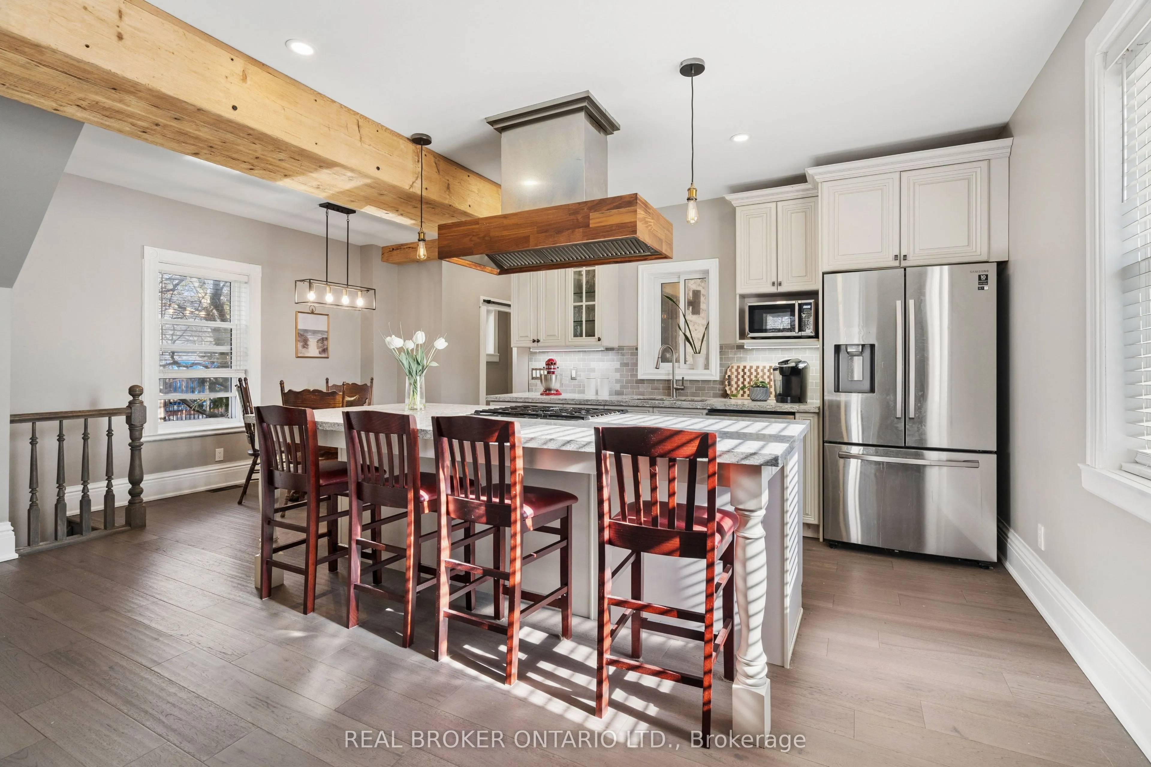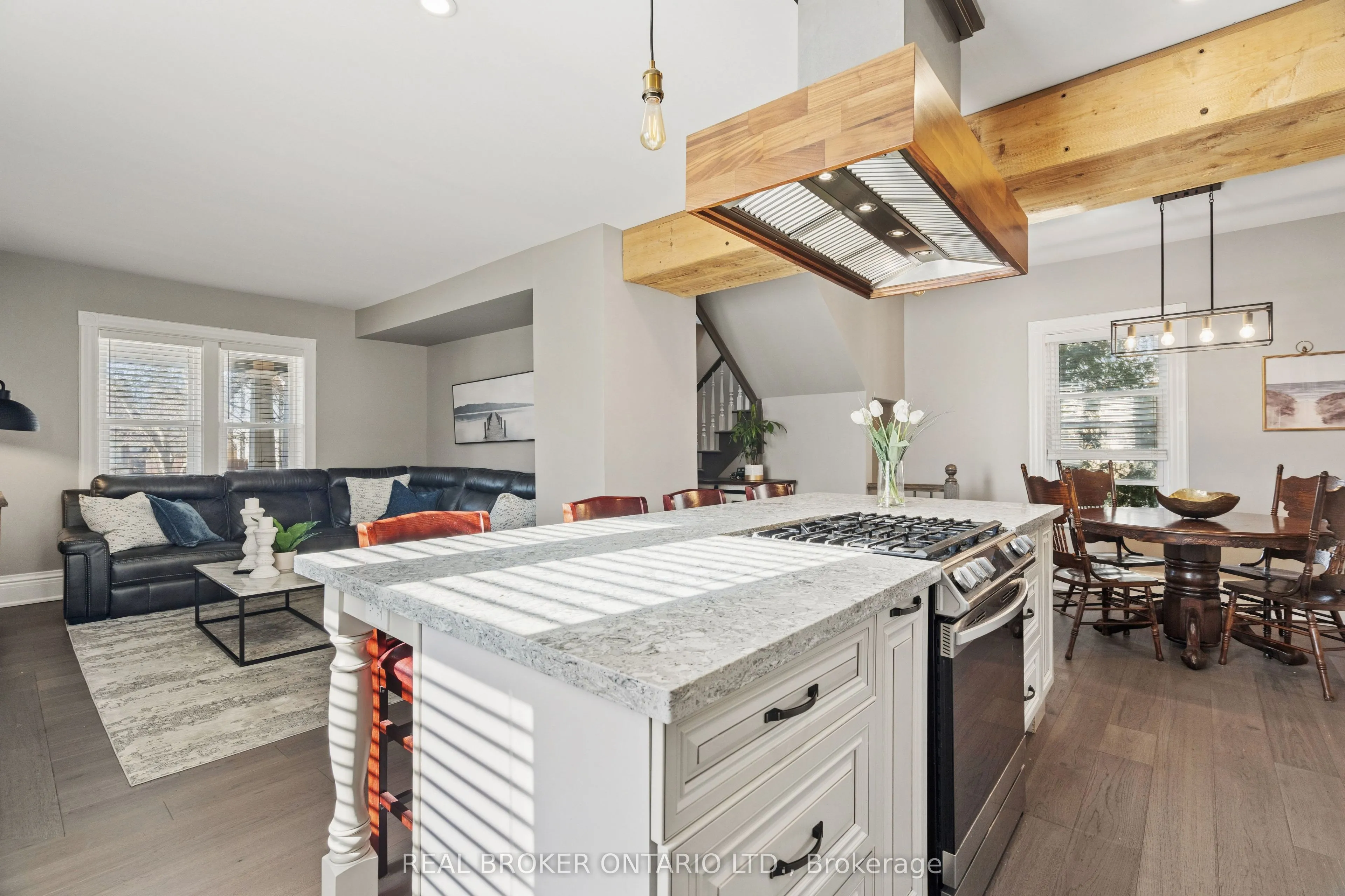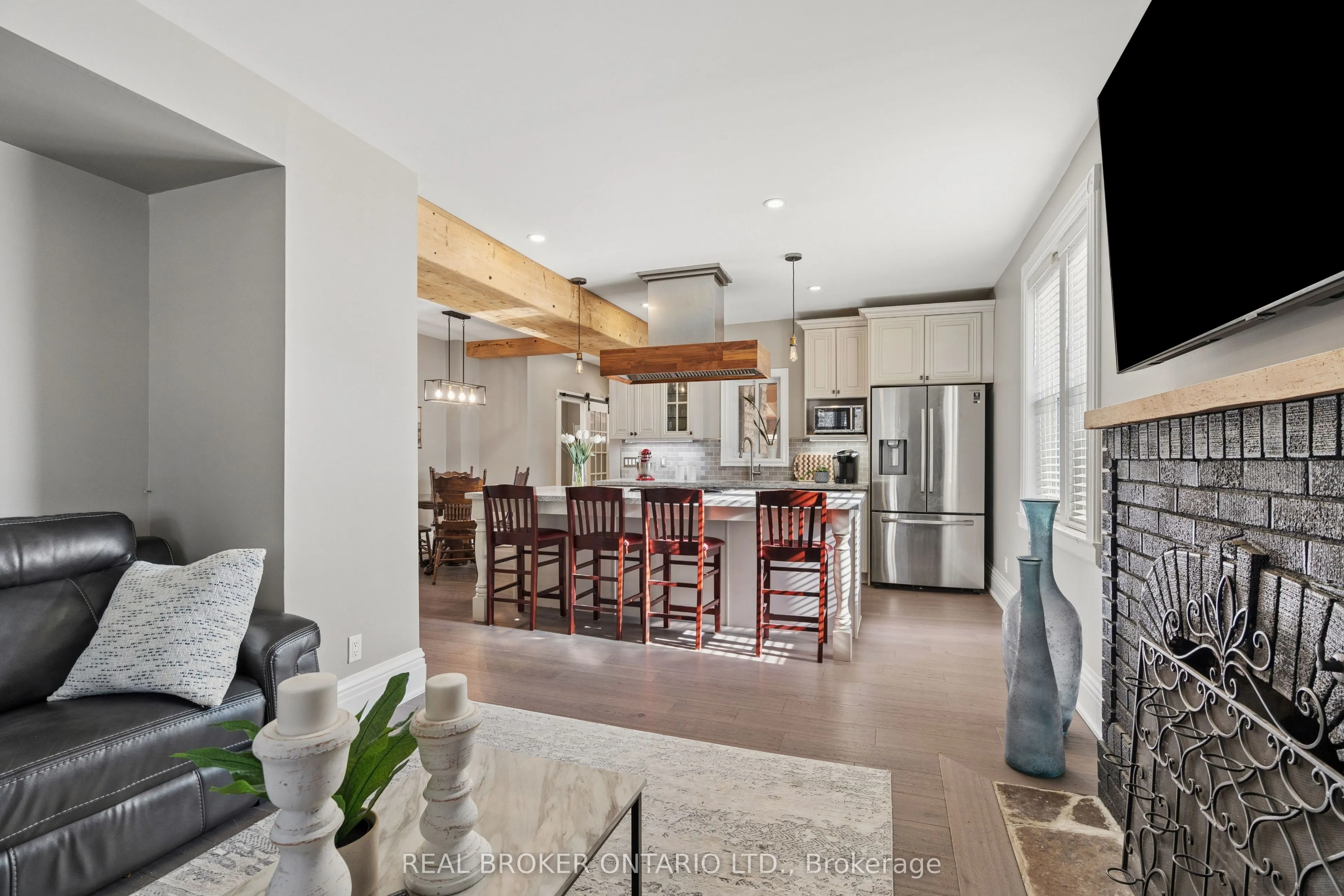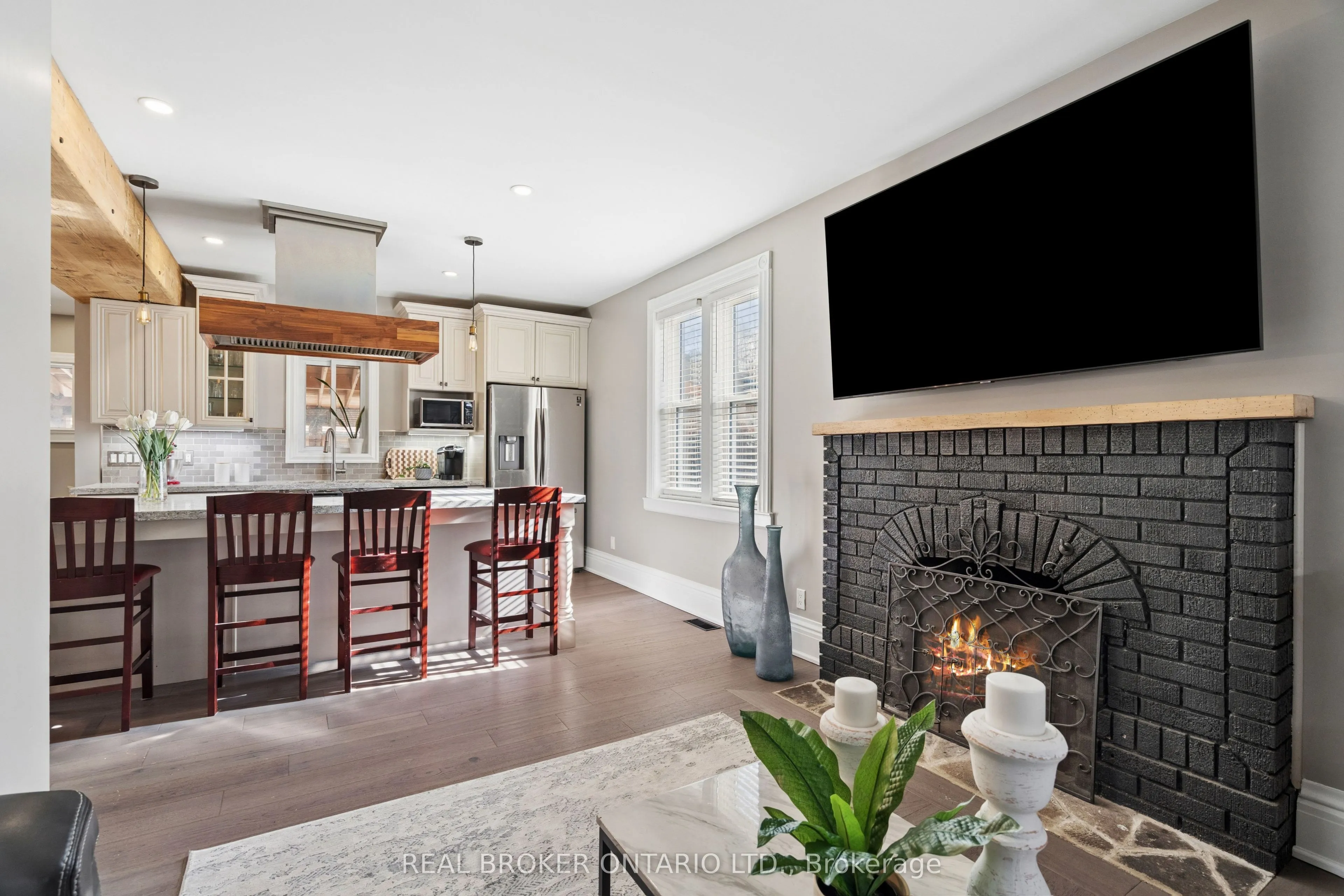 Welcome to 855 Hamilton Street in Cambridge’s historic Preston neighbourhood, where timeless character meets modern family living. This beautifully updated 1,300 sq ft detached century home sits on a generous 55 x 110 ft lot, offering the perfect balance of charm, comfort, and space for everyday living and entertaining. The main floor features engineered hardwood flooring, pot lights, and a warm, inviting living room centered around a cozy wood-burning fireplace. The renovated open-concept kitchen is the heart of the home, showcasing a massive quartz island with built-in gas range and statement hood vent, stainless steel appliances, pendant lighting, and plenty of space for family gatherings. The dining area flows seamlessly from the kitchen, creating an ideal layout for hosting and everyday meals. A 2-piece bathroom and walkout to the backyard complete the main level. Upstairs you’ll find three bedrooms with engineered hardwood throughout. The spacious primary suite features a walk-in closet and an open-concept 5-piece ensuite, while the additional bedrooms share a 5-piece semi-ensuite, providing convenience for family living. The backyard is designed for relaxing and entertaining, featuring a covered patio with electricity, hot tub, and built-in stone fireplace, creating the perfect setting for evenings with family and friends. A rare highlight is the detached three-car garage, currently set up with one bay as a games room or gym, along with parking for three vehicles in the driveway. Major updates completed between 2018-2019 include new wiring, plumbing, kitchen, bathrooms, and flooring, providing modern comfort while maintaining the charm of this beautiful century home. Located close to parks, schools, and amenities in the desirable Preston community, this home offers a fantastic opportunity for families looking for character, space, and thoughtful updates.