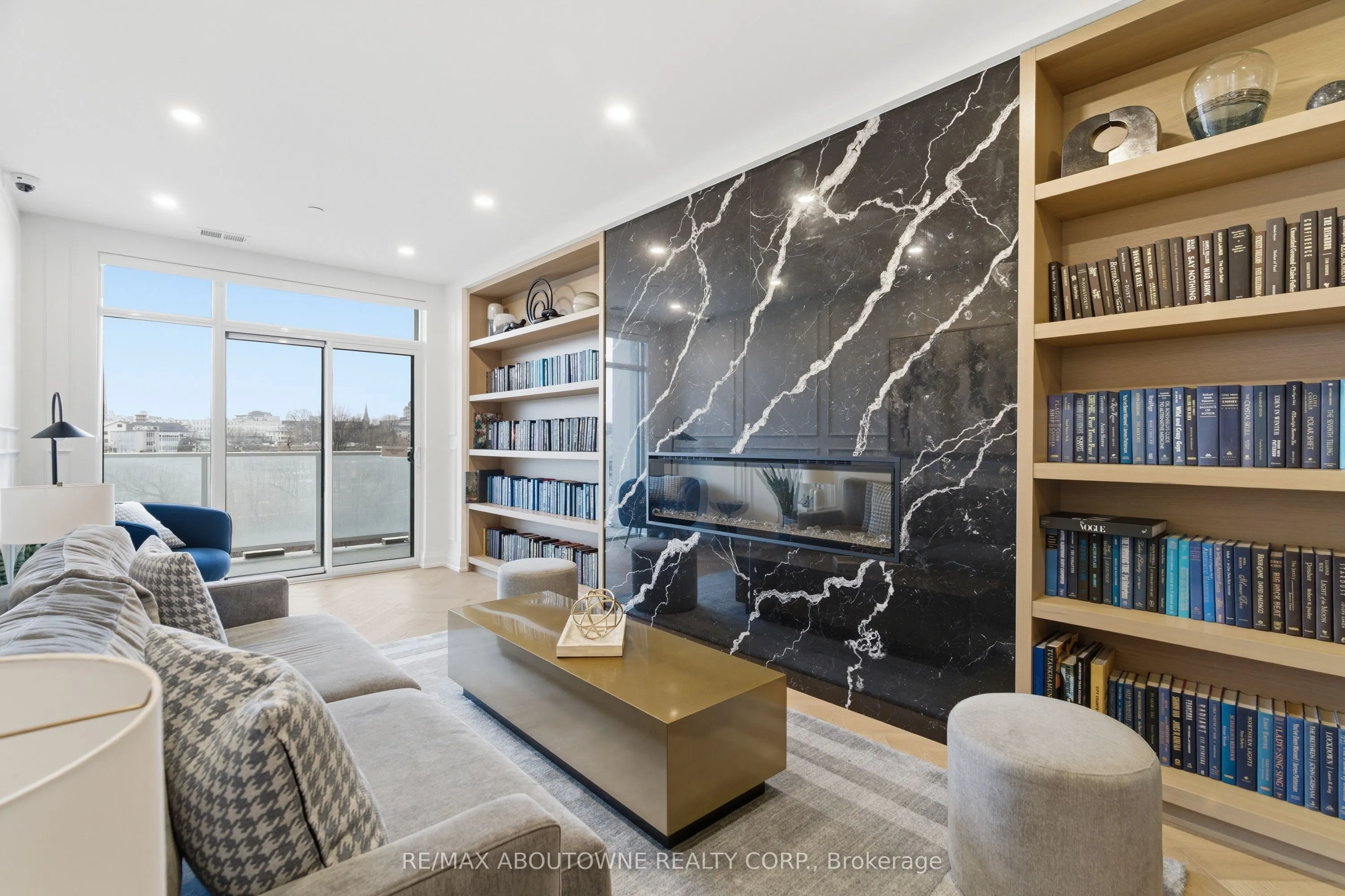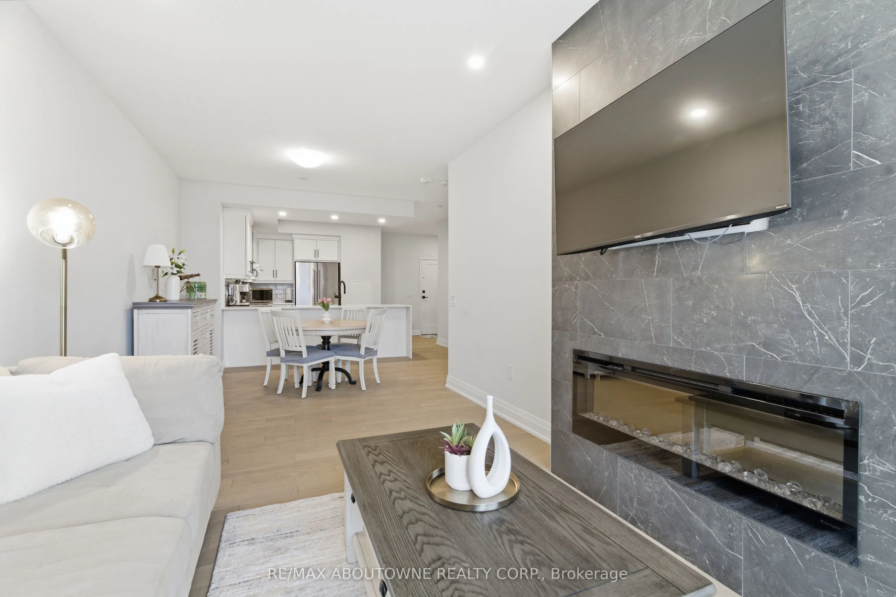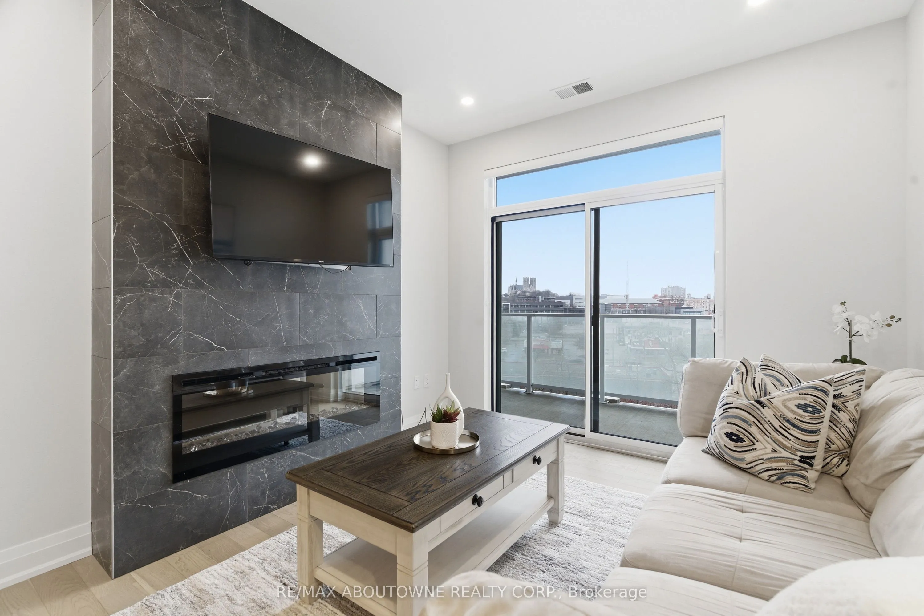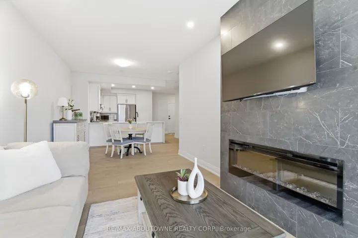 Welcome to Unit 506 at 71 Wyndham Street South – where refined living meets the vibrant heart of downtown Guelph. This exceptional 2-bedroom + den, two full bathroom suite with 9-ft ceilings offers 1,255 sq ft of thoughtfully designed living space, complemented by a full-length 170 sq ft balcony with stunning views of the Speed River and downtown skyline. Includes one underground parking space and one same-floor storage locker for added convenience. The L-shaped kitchen is both stylish and functional, featuring waterfall edge island, quartz countertops, abundant cabinetry, and contemporary finishes, seamlessly flowing into the main living space. A standout feature is the private den, tucked away from the main living area, offering the perfect work-from-home setup. The open-concept living and dining area is anchored by a floor-to-ceiling tiled fireplace and enhanced by a seamless walk-out to the balcony. Expansive windows fill the space with natural light, creating a bright and inviting atmosphere. The spacious primary bedroom includes a walk-in closet and a beautifully appointed ensuite with a glass-enclosed shower and double vanity. A second generously sized bedroom, a 4-piece full bathroom, and in-suite laundry complete the well-designed layout. Residents enjoy access to first-class amenities, including a library, fitness centre, elegant social lounges, a guest suite, golf simulator, outdoor terrace with BBQs, and secure bike storage. Located just steps from downtown dining, cafés, shops, the Farmer’s Market, GO/VIA transit, and scenic riverside trails, this is a rare opportunity to experience an elevated urban lifestyle in one of Guelph’s most sought-after locations.