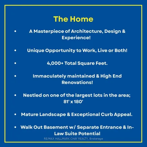 A Masterpiece of Architecture, Design & Experience! 4,000+ Total Square Feet of immaculately maintained & high end finishes. Nestled on one of the largest lots in the area; 81’x180′ of Mature Landscape & Exceptional Curb Appeal. This incredible property is located right off Yonge Street in Aurora’s most sought after community & has a rich history of one of the town’s most historic homes! Promenade Downtown 1 (PD1) Zoning – allows you to work, live or both! 9′ Ceilings Throughout Main & Walk-Out basement this home is flooded with natural light. The moment you walk in you will see its historic charm meets modern luxury! Massive Chef’s Kitchen w/ an 8′ Entertainers Island, Beverage Centre, Pot Filler, Top End S/S Appliances including Ancona Oven, 6 Range Gas Stove, Electrolux Fridge/ Freezer & Private South Facing Balcony for enjoying family meals! Main Floor Office, Reception, Atrium/ Sun Room & Multiple Living Rooms; each designed with their own unique experience of relaxation, inspiration & cozyness! Upstairs has 4 large bedrooms. Primary Bedroom boasts soaring ceilings, huge Walk In closet, Spa-Like Ensuite & Your very own balcony! The Bright Walk Out basement has tall 9′ ceilings, multiple walkouts & is all roughed-in for separate kitchen/ laundry & living quarters. Two Gas Furnaces for precision climate control. You can not beat this location! Neighbors to Multi-million dollar homes & thriving businesses. Minutes to Aurora’s best schools; St. Andrew’s, St. Anne’s, and CDS. Grab your coffee and walk to Town Park, Farmer’s Market, Summerhill Market, Aurora Library, New Cultural Center, shops on Yonge St. Walk or drive to the Aurora Go, Arboretum & Leisure Complex. Fully Renovated & Refreshed Inside, Out & Mechanicals in 2020. New Staircases w/ Glass Railings. Custom Hand Sewn beam w/ 18th Century Chandelier. Coffered Ceilings.Closet Organizers. Antique Doors & Hardware Throughout. Updated Lighting. 200 Amp Panel. Two Furnaces. Beautiful Atrium w/ private deck!