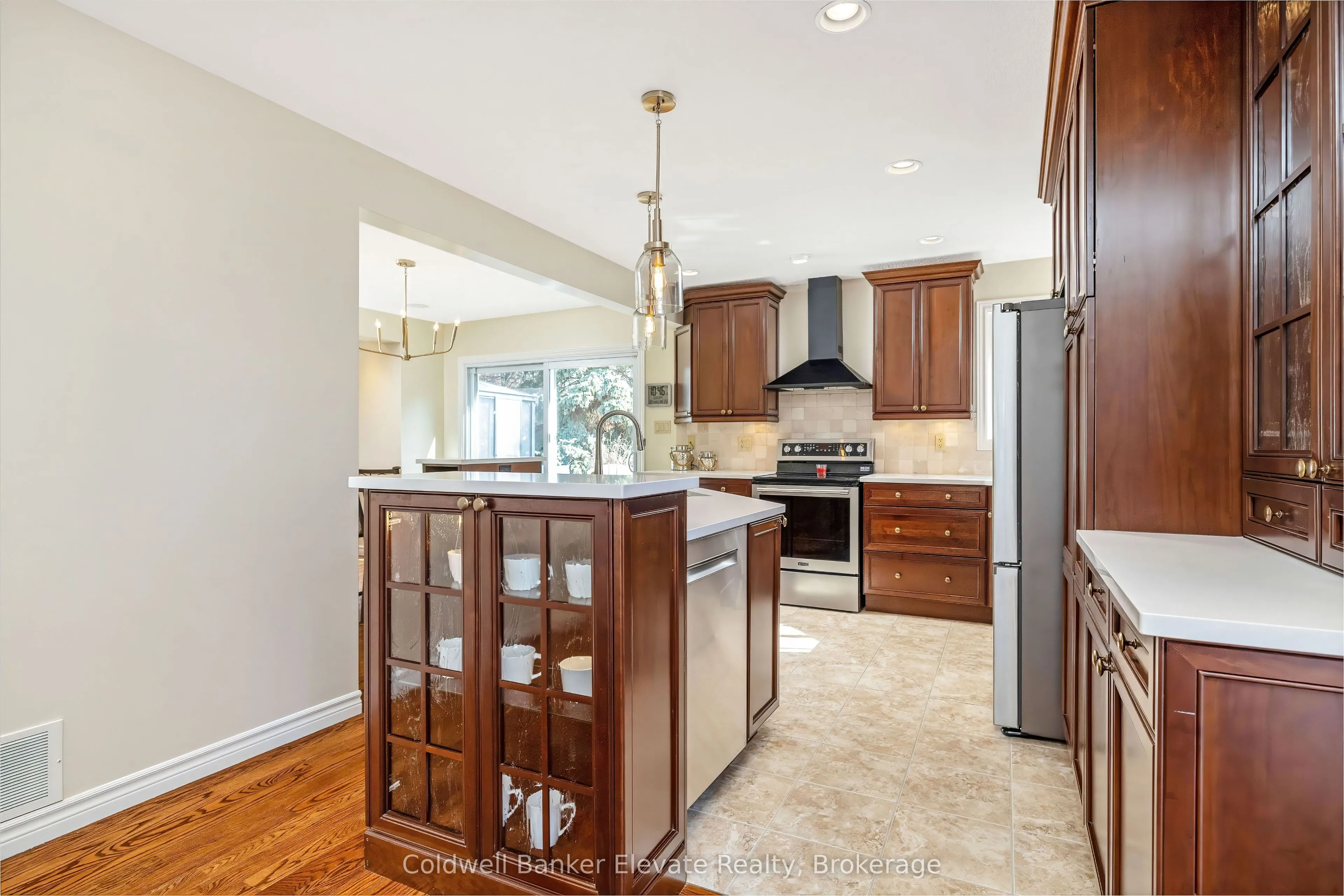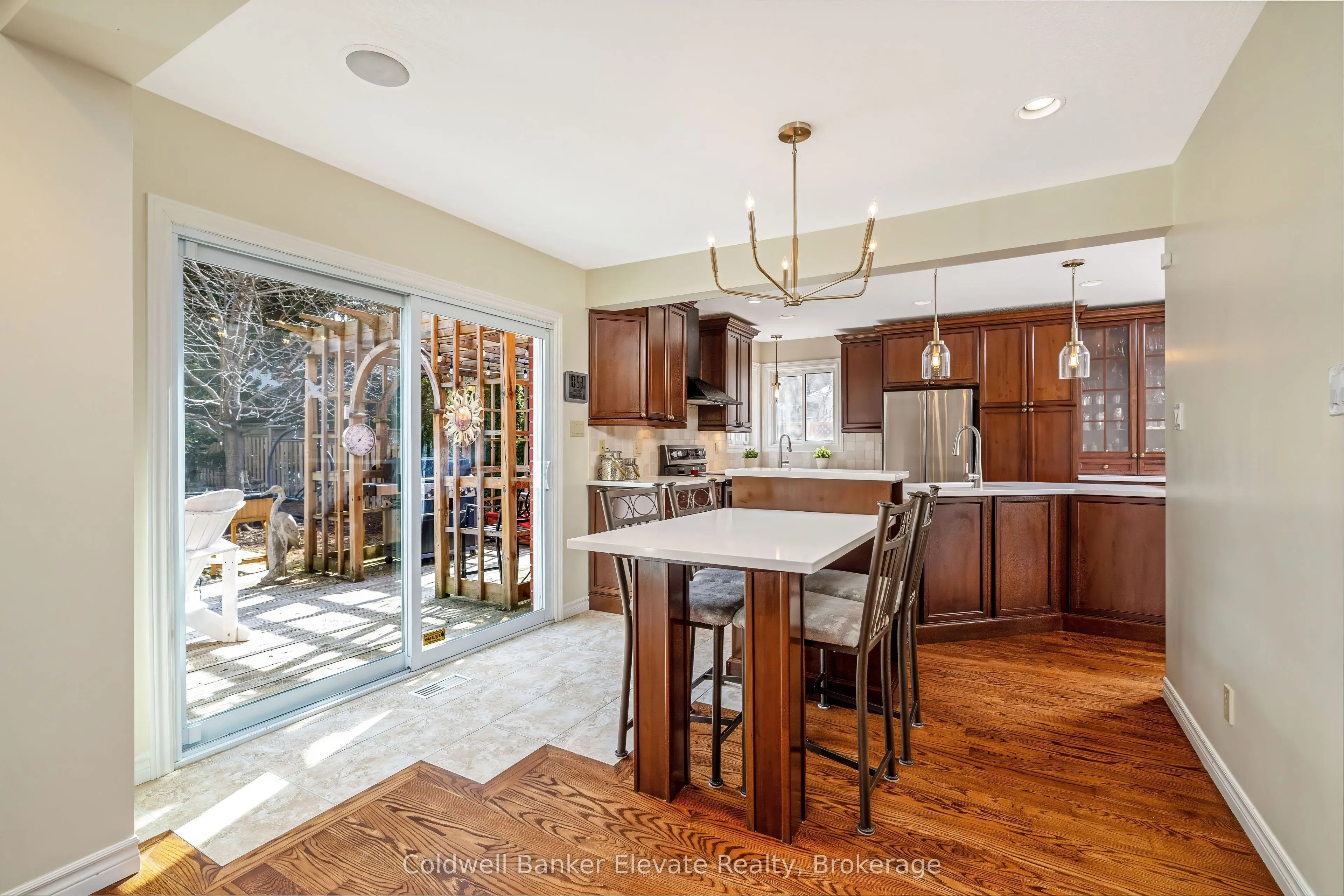 Welcome to this beautifully renovated family home in sought-after Hespeler Village, set on a mature lot and showcasing exceptional space, thoughtful upgrades, and pride of ownership throughout. Blending timeless style with modern comfort, this fully move-in ready home offers a bright centre hall plan and open-concept main level featuring solid oak plank flooring and pot lights throughout the living and dining areas. The stunning kitchen is the heart of the home, complete with Kitchen Craft cabinetry, quartz countertops, a tumbled marble backsplash, under-cabinet lighting, and a large island with breakfast bar area. A corner sink and additional double sink, along with high-end stainless-steel appliances, add both function and style, with ample storage and workspace throughout. The adjoining family room provides a warm, inviting setting with a WETT-certified wood-burning fireplace, limestone surround, built-in cabinetry, and walkout to the backyard deck, perfect for entertaining and everyday living. Upstairs, engineered hardwood flooring continues through four spacious bedrooms, including a primary retreat with two walk-in closets and a private three-piece ensuite featuring an oversized glass shower and a quartz vanity. The finished lower level offers added versatility with two recreation areas, an extra bedroom, and a rough-in for a future bathroom. Main floor laundry with direct access to the double car garage adds convenience. Step outside to a private backyard oasis set on an oversized, irregular lot over 180 feet deep. Enjoy a large wooden deck, covered three-season gazebo with screens and dual access, open pergola, tranquil pond, barbecue area, interlock walkway, and full outdoor sound system. Surrounded by mature trees and lush perennials, this is a rare in-town offering you won’t want to miss. Minutes to the 401, schools, shopping, and Forbes Park with splash pad, this home is perfectly located to enjoy the Hespeler lifestyle.