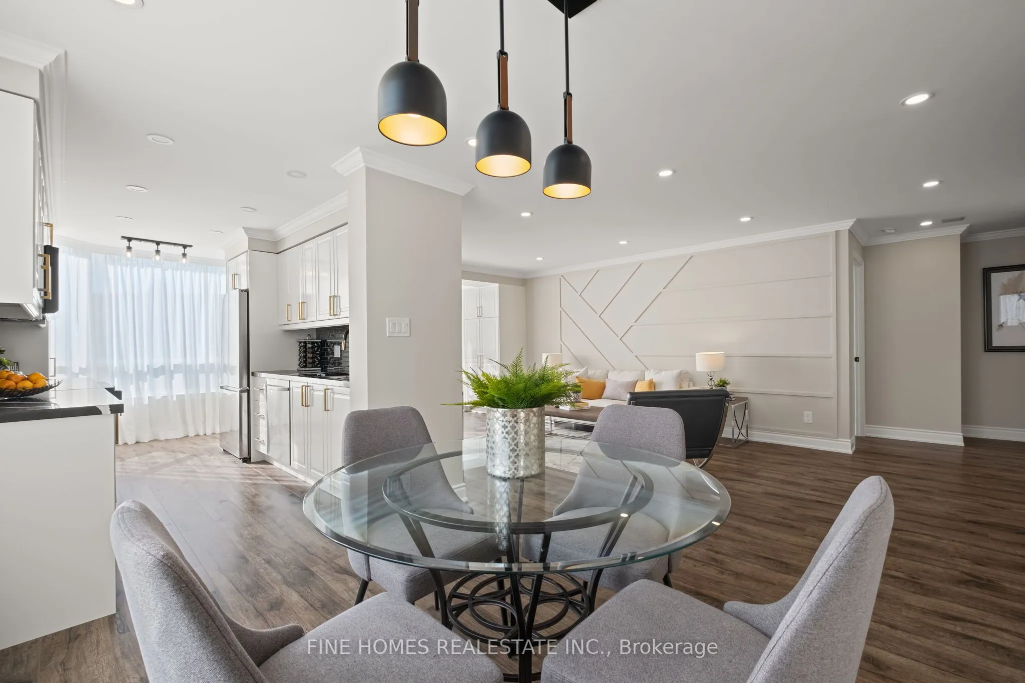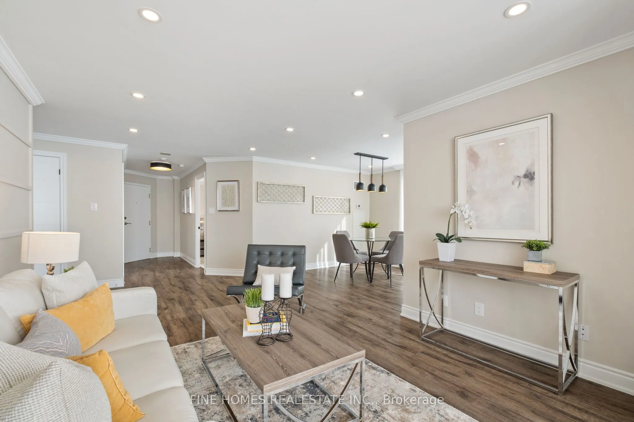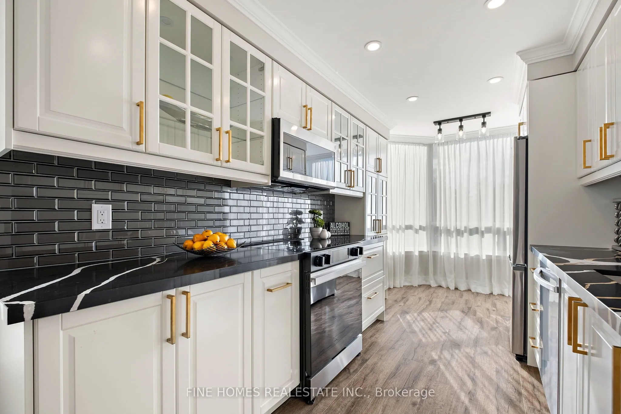 Fully Renovated Luxury Corner Suite! Stunning open-concept layout with a new kitchen featuring quartz countertops, stainless steel appliances, and premium finishes. Both bathrooms beautifully remodelled with sleek, modern design. Enjoy new flooring, LED pot lights, crown molding, and brand-new fan coil units throughout. Spacious primary bedroom with designer touches and custom built-ins. Truly a top-quality renovation-nothing overlooked.Located in a prestigious building with exceptional amenities: 24-hour gatehouse & security, pool, gym, sauna, tennis/squash courts, party & meeting rooms, library, guest suite, and ample visitor parking.Move-in ready and a rare opportunity in an unbeatable location!