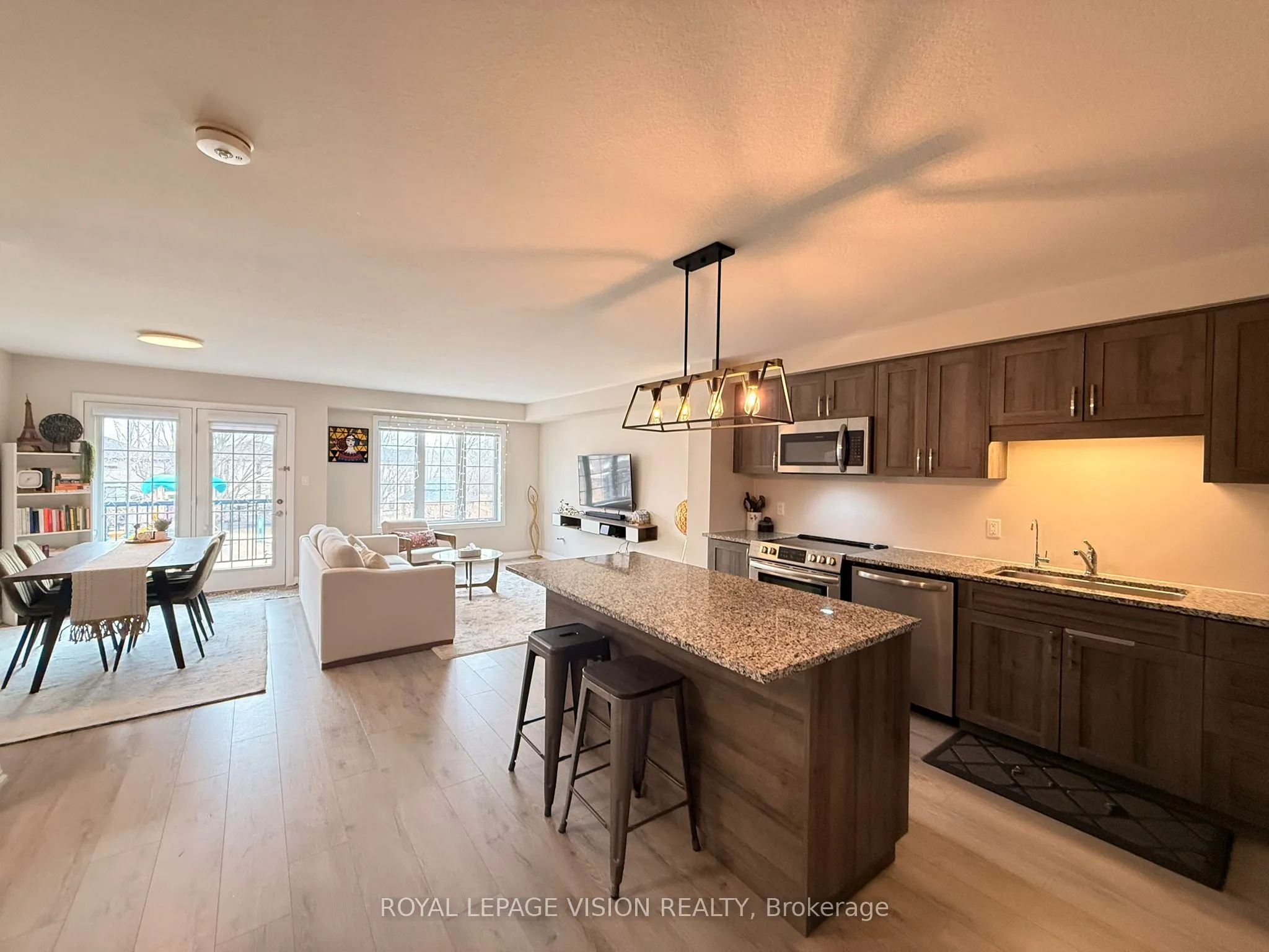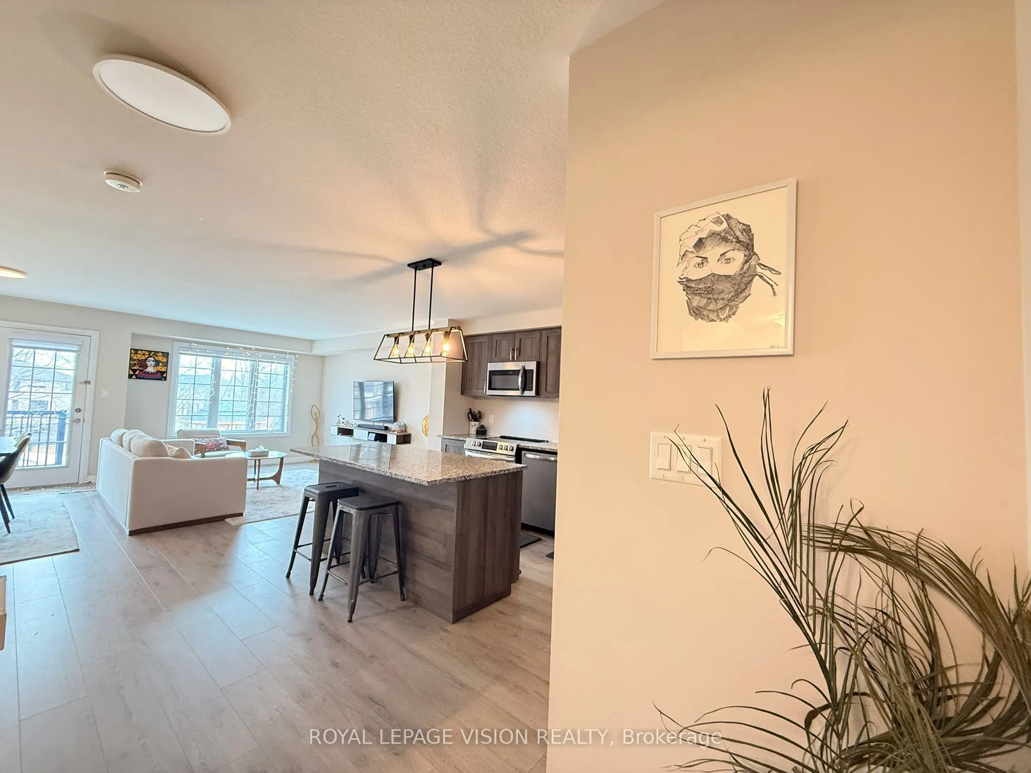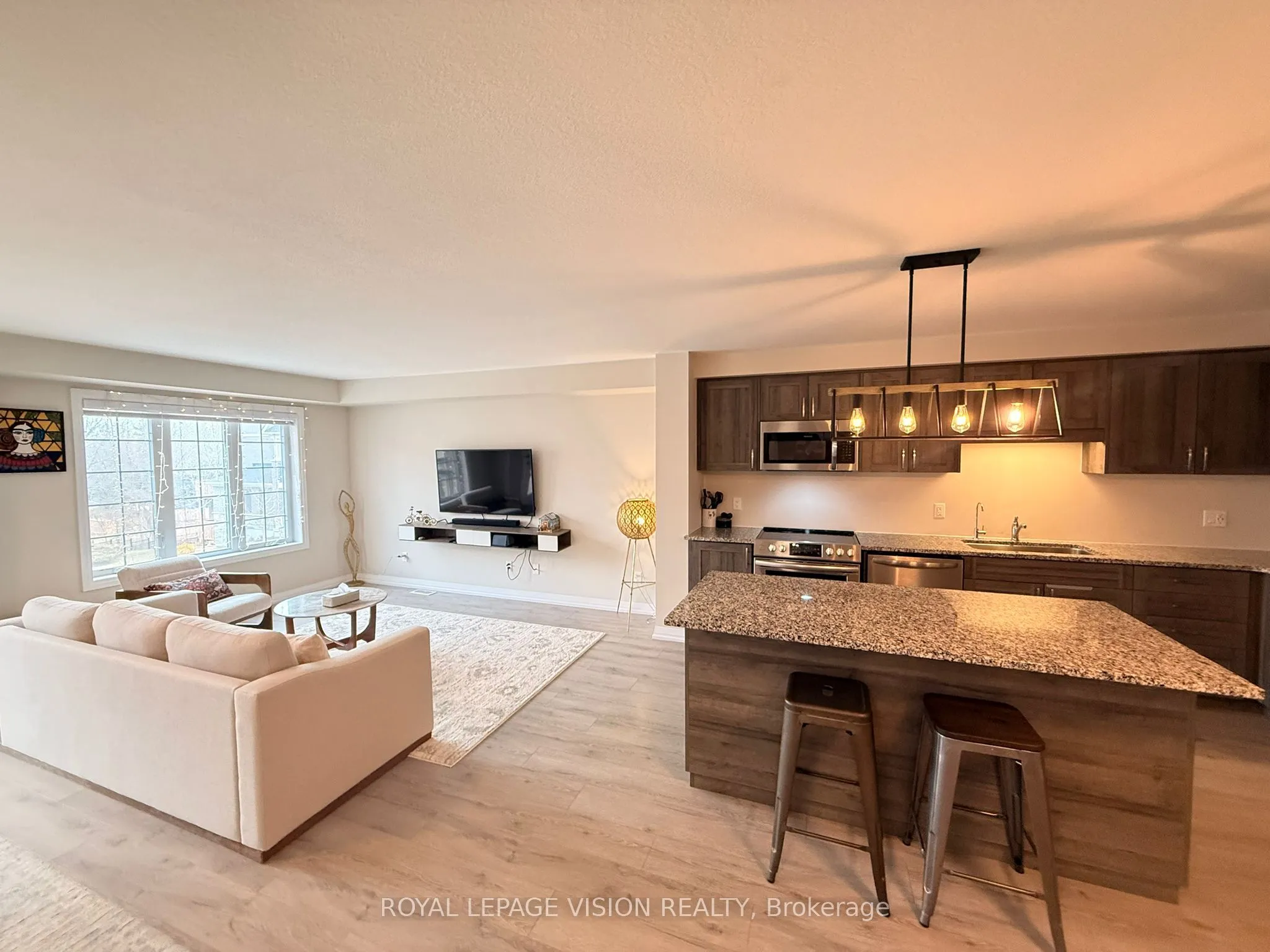 Welcome to this stunning townhome in the highly sought-after Doon South community of Kitchener- a peaceful, family-friendly neighborhood perfect for first-time home buyers or investors. This beautifully maintained home offers a spacious and modern layout featuring 2 bedrooms and 2full washrooms (plus an additional powder room). The second floor boasts a bright and airy living area, a generous dining space, and a stylish kitchen complete with quartz countertops, stainless steel appliances, and a convenient breakfast bar. Step out onto the private balcony – perfect for enjoying summer evenings or your morning coffee. Upstairs, you’ll find a well-appointed primary bedroom with a 3-piece ensuite, along with a second spacious bedroom and a shared 4-piece bathroom. The third-floor laundry adds everyday convenience. Additional features include a stone exterior, single-car garage with private driveway, central air conditioning, water softener, and HRV system for fresh air circulation. Located just minutes from Highway 401 and close to schools, parks, Conestoga College, and all essential amenities, this home offers both convenience and tranquility. Monthly fees cover landscaping, snow removal, garbage removal, exterior maintenance, visitor parking, and high-speed internet – making for easy, low-maintenance living.