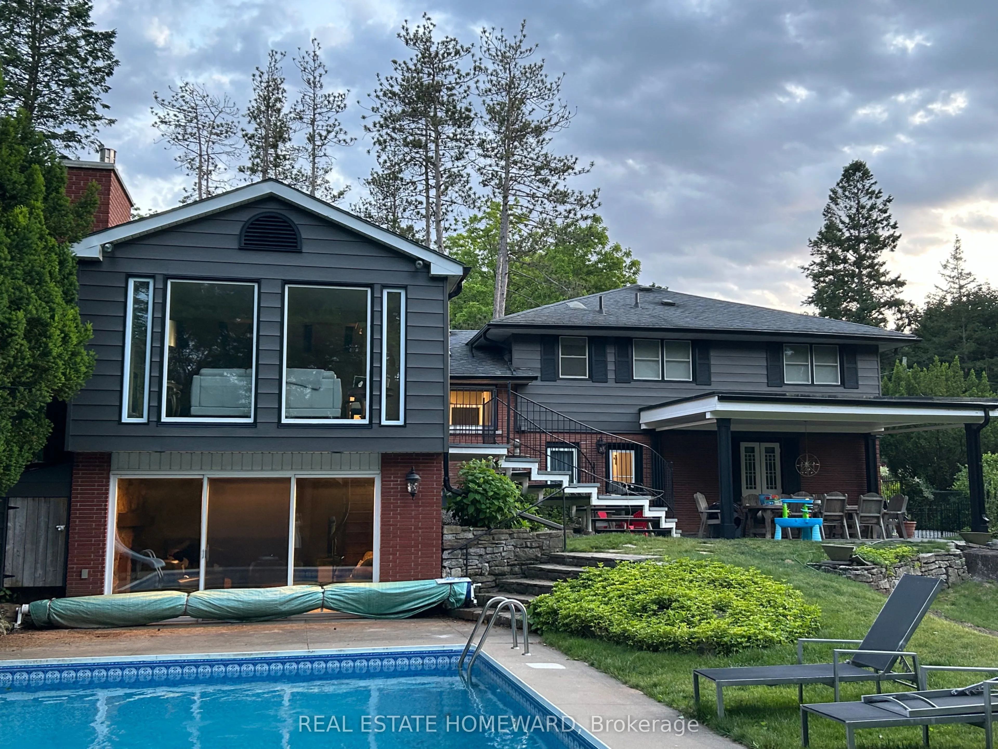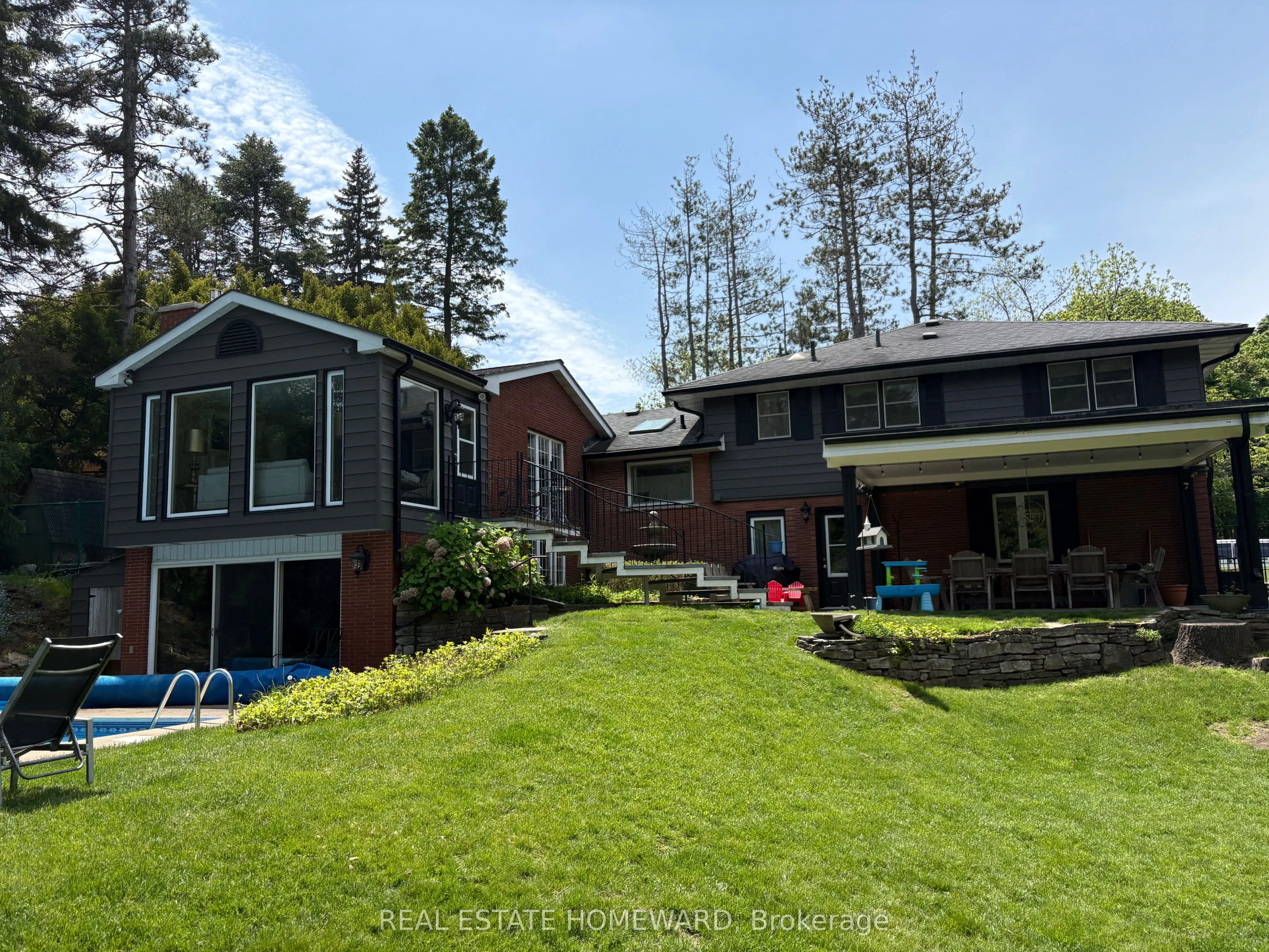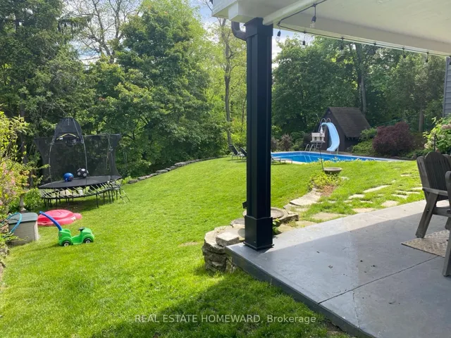 Fabulous Old Ancaster Village Location in desirable Mansfield Park, Walk to downtown coffee, restaurants, summer market, charming downtown shops, Ancaster Art centre and amenities, This beautiful fully renovated 5bedroom home sits on a parklike 1/3 acre of privacy on one of the most coveted cul de sacs in the neighbourhood. Part of the original pine forest for the area adorns the front yard and a treed muskoka stylebackyard with a small ravine is incredible with a newly updated inground pool and a stunning outdoor room. This property is so peaceful you will never want to leave. This home is a lot more spacious than it looks, almost 3000 sf of finished living space with a stunning 2 storey addition which showcases an almost all glass great room and cathedral dining area with beamed ceiling overlooking the 18’x36′ pool and yard. Holiday dinners and entertaining your family and friends will be effortless in any season Stunning suspended oak staircase with beautiful wrought iron railing to the large family room sits in front of a 2 storey window, spectacular views of the fountain and yard. The family room has a wall to wall glass walkout to the pool and patio. Large pool house. Too many recent upgrades to mention: Appliances,recroom reno, exterior aluminum renos, garage door,upgraded inground pool liner/jets, concrete pad for equipment, Ensuite bathroom Reno,Plumbing updates,Spray foam insulation in crawl space, Paint throughout most of the int and ext,This quiet court location is so amazing! 200 amp