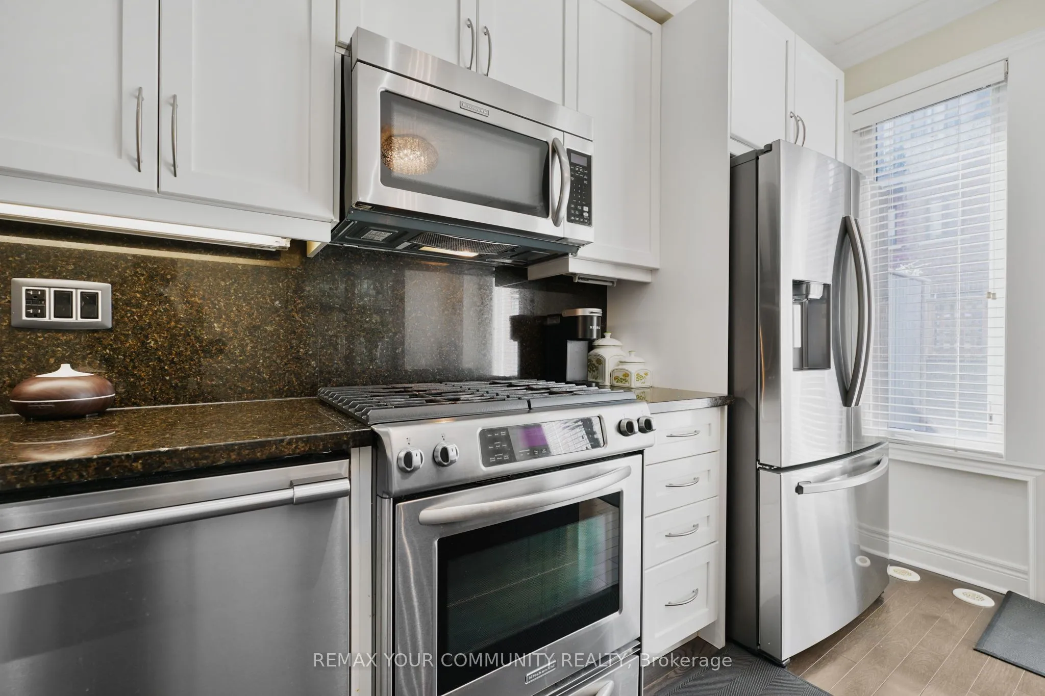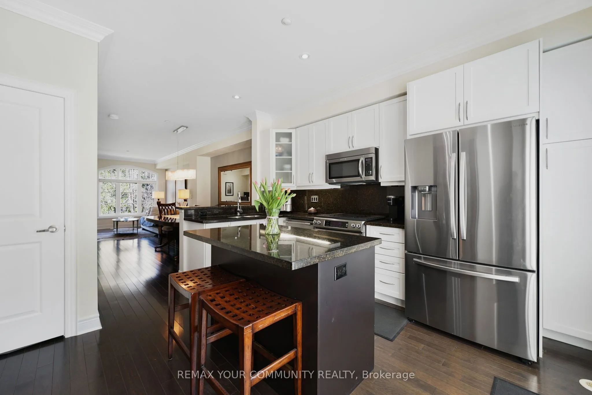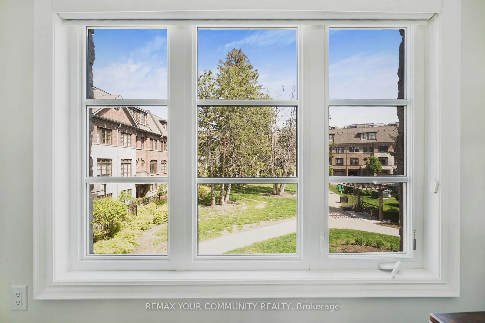 Riverside Luxury Townhouse for Sale. Welcome to a peaceful luxury townhouse community in matured Woodbridge, surround by Market Lane Shops, Restaurants, Supermarkets, Public Transit, easy access to HWY 27, 427, 407 and 50. A premium lot, facing a quiet private community park. It provides a save, elegant, spacious and economical life-style-living, with security monitored, concealed ceiling fire-sprinklers throughout and an oversized indoor two-car tandem garage with generous storage space. Rich wood floors and stairs with 9ft ceilings and crow-moldings are throughout the home. The entry-level floor has heated ceramic floors, one washroom and a spacious den with large wood shutter windows facing the private park area – ideal for office, exercise or bedroom use. The primary floor level has an open-concept layout with large windows facing the private park. A gas fireplace with stone-facing enriches has spacious living and dining area. The Kitchen has generous cabinet storage and a pantry. Granite countertops, including the kitchen island has generous cabinet storage and a pantry. Granite countertops, including the kitchen island with additional storage space. The refrigerator, dishwasher and gas-stove are stainless steel, and large size microwave. Double French doors exit’s the kitchen into a spacious private outdoor patio balcony. The secondary floor level has 2 spacious bedrooms, one with wall-to-wall windows for a breathtaking view of the community private park. A full bathroom services the floor level, along with the laundry room with ample storage space. The grand master bedroom has a walk-out balcony, a custom-built walk-in closet and a large spa-like 5 pcs ensuite with double-sink and a jacuzzi.
