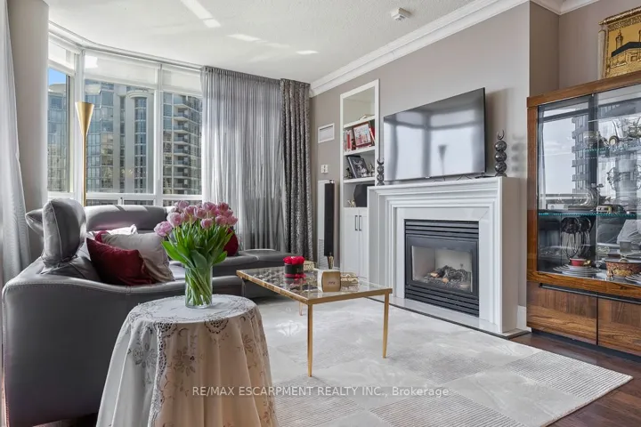 Welcome to this exceptional corner sub-penthouse at Skymark West Condos, a prestigious Tridel-built residence completed in 2000, known for its upscale living and all-inclusive maintenance fees. Offering over 1,525 sq. ft. of beautifully renovated space, this bright suite features 9-foot ceilings, a cozy fireplace, and two private balconies with stunning sunrise and sunset views. The layout includes two generously sized bedrooms. The primary bedroom is a luxurious retreat with built-in closets, a walk-in closet, custom dresser, and a spa-like five-piece ensuite. Additional highlights include ensuite laundry, excellent storage, and two parking spaces. Residents enjoy top-tier amenities: concierge, indoor pool, gym, party room, guest suites, visitor parking, and permitted barbecues. A rare opportunity for spacious, turnkey luxury living-furniture is negotiable.