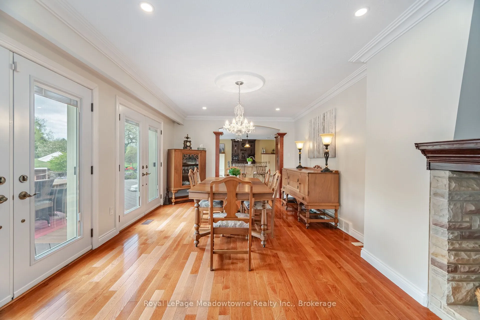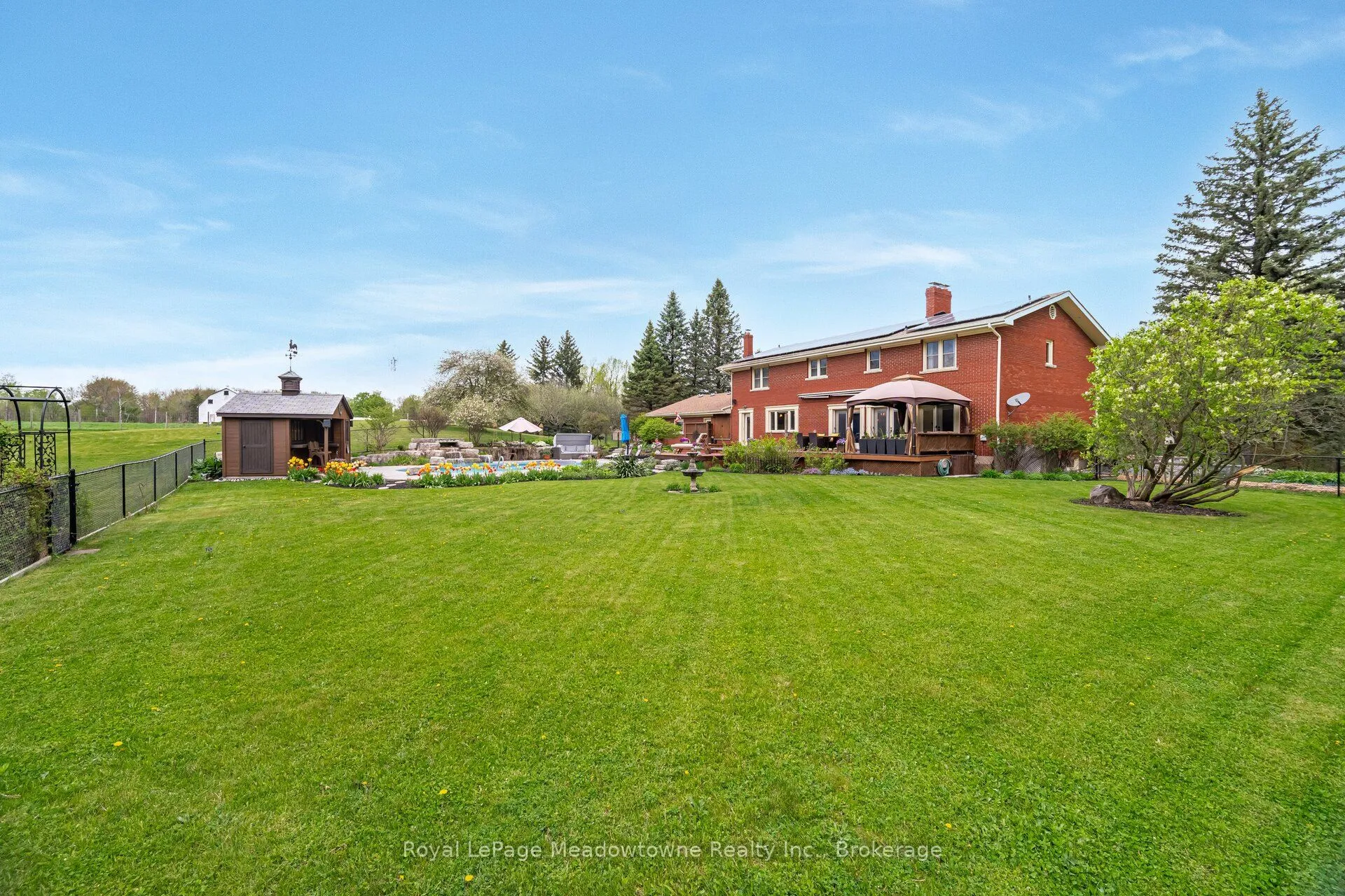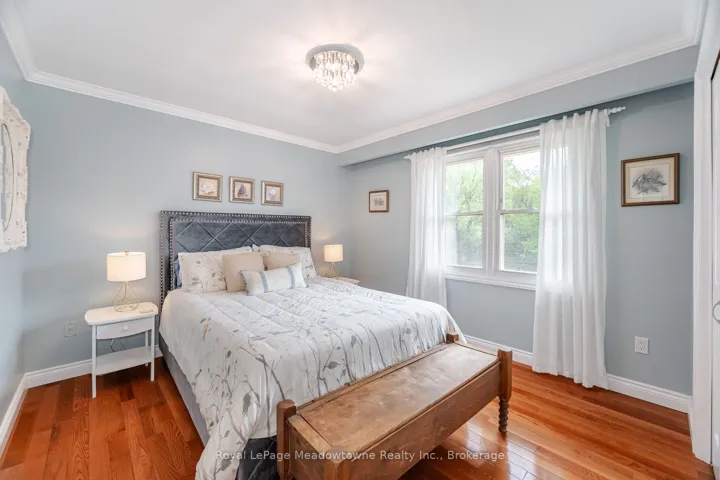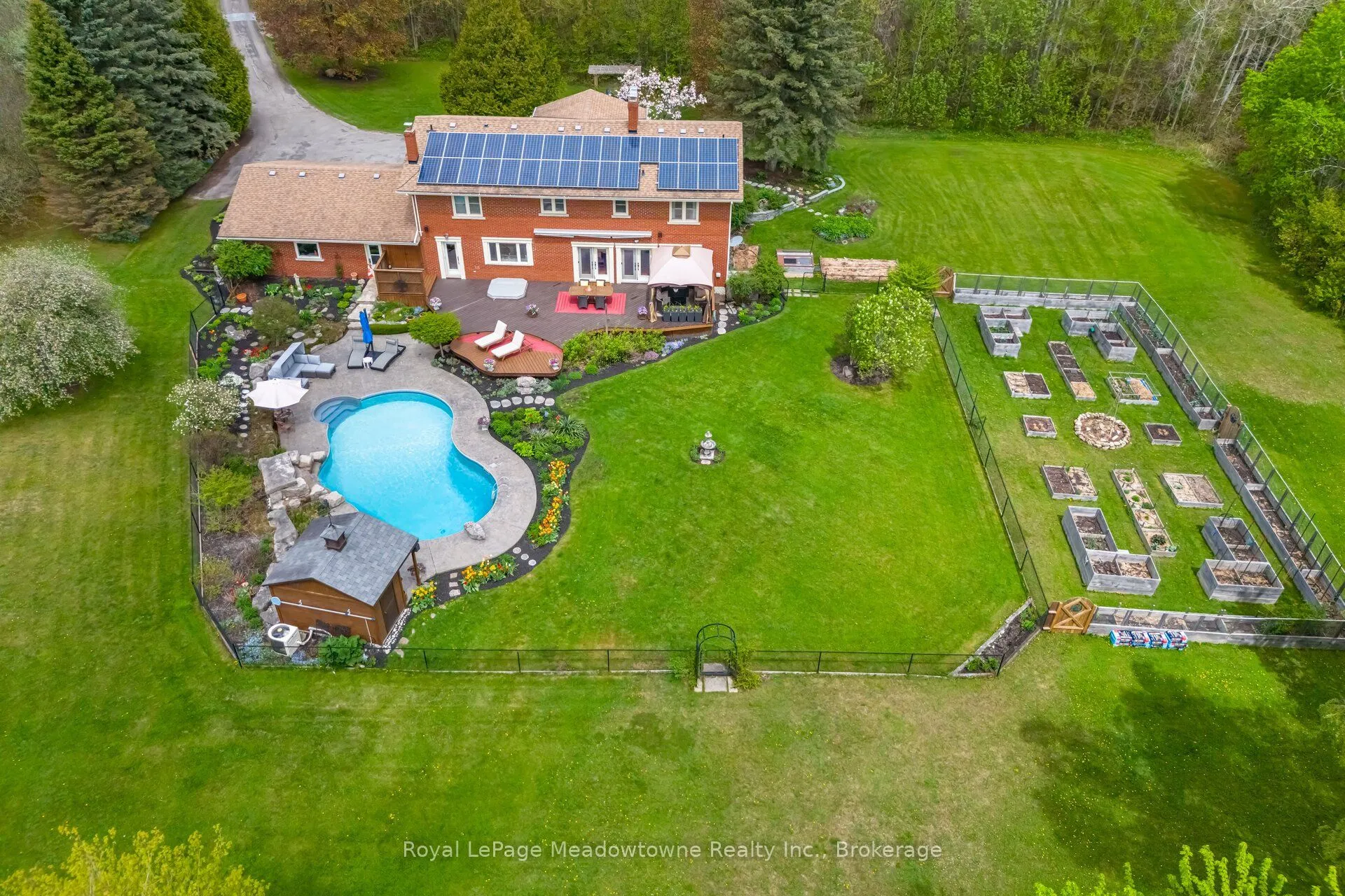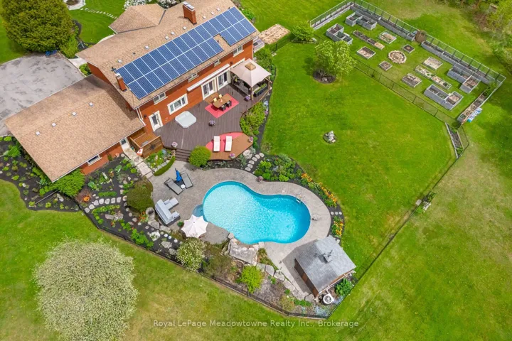 19.3 ACRES!! Elegant 3+1 Bedroom, 4 Bathroom Georgian-Style Home situated on a unique, one of a kind property that is very private and well set back from the road on 19.3 Acres. This beautifully updated and impeccably maintained home blends timeless style with modern luxury. A grand foyer welcomes you into spacious, light-filled rooms featuring hardwood floors, crown moulding, and panoramic views. The great room boasts a wood-burning fireplace and bay window, while the chefs kitchen offers custom cherry wood cabinetry, granite island, built-in appliances, a large window that overlooks the pool and garden, and a walk-out to the entertainers deck overlooking a previous gold award winning saltwater pool with Halton Pools, hot tub perennial gardens and an enclosed garden 30×80 feet area with raised garden boxes with cold frames. Upstairs, the luxurious primary suite includes motorized blinds, double closets with organizers, and a stunning ensuite with standalone tub, rain shower, and custom walk-in closet. Two additional bedrooms share a Jack-and-Jill bathroom with separate wet room. The finished basement offers a rec room with fireplace, games room, bedroom, sauna, 3-pc bath, cold room, mechanical room and ample storage. Extras include a pool house with bar/change room, den with custom built-ins, second kitchen, tool room, potting room, 220amps electrical, and access to wooded trails, gardens, and Speyside Creek. Peaceful country living just minutes to city amenities!