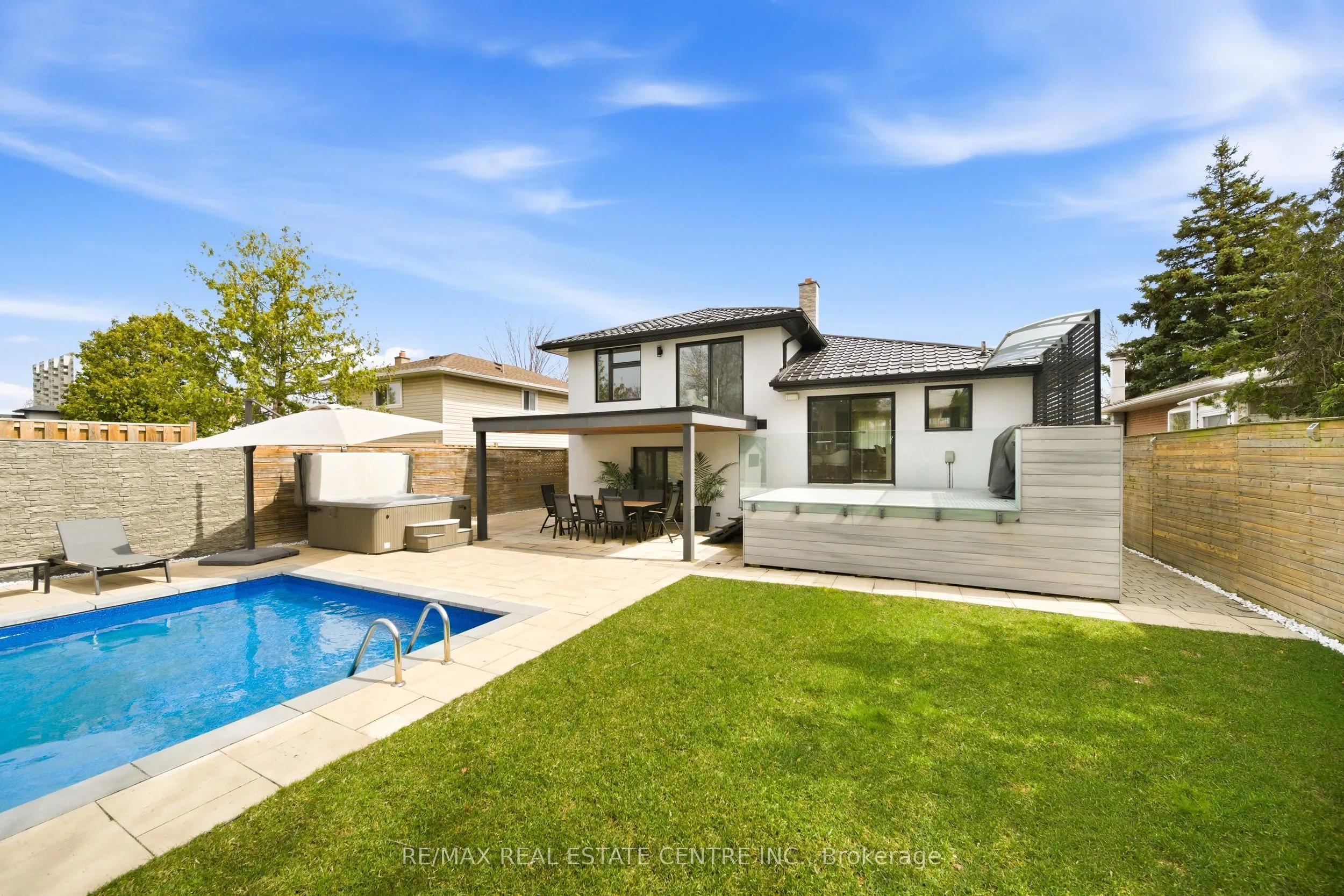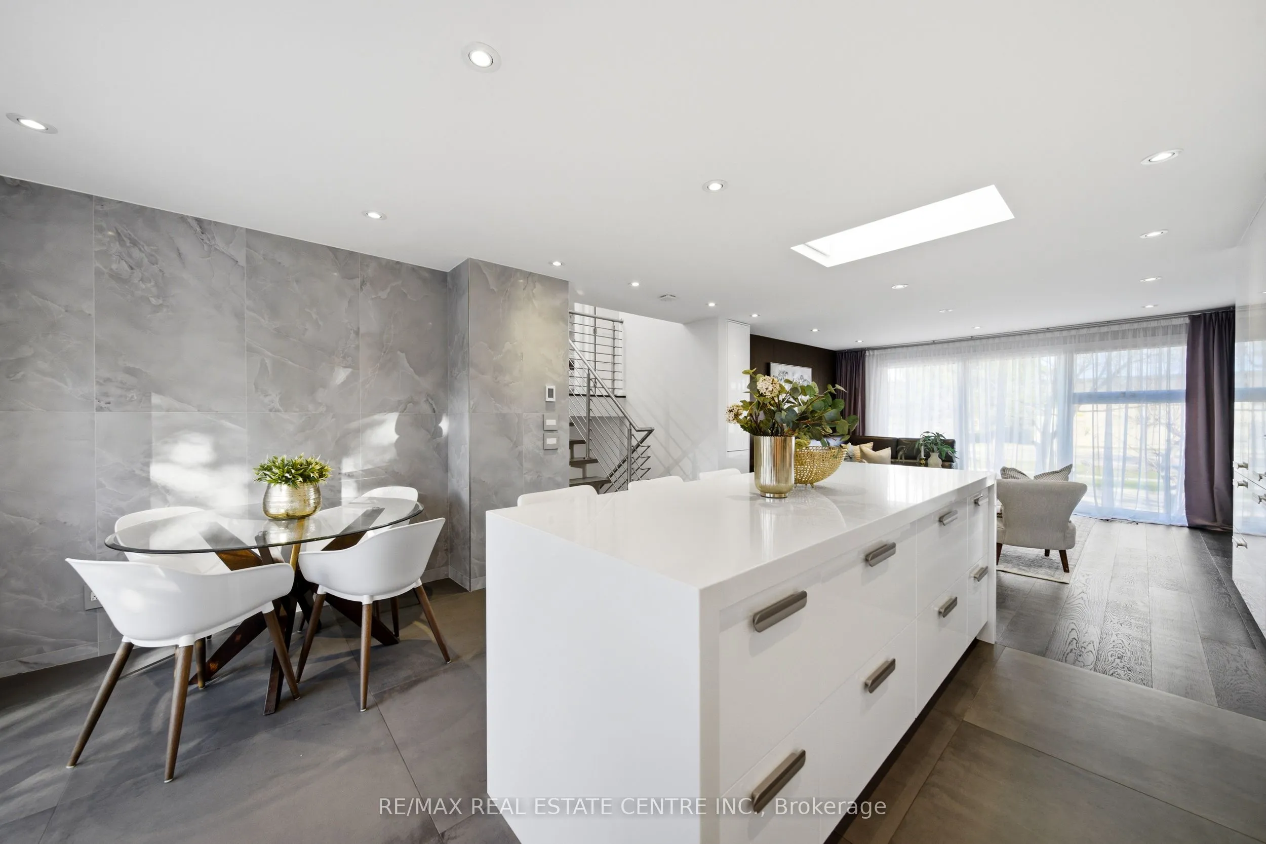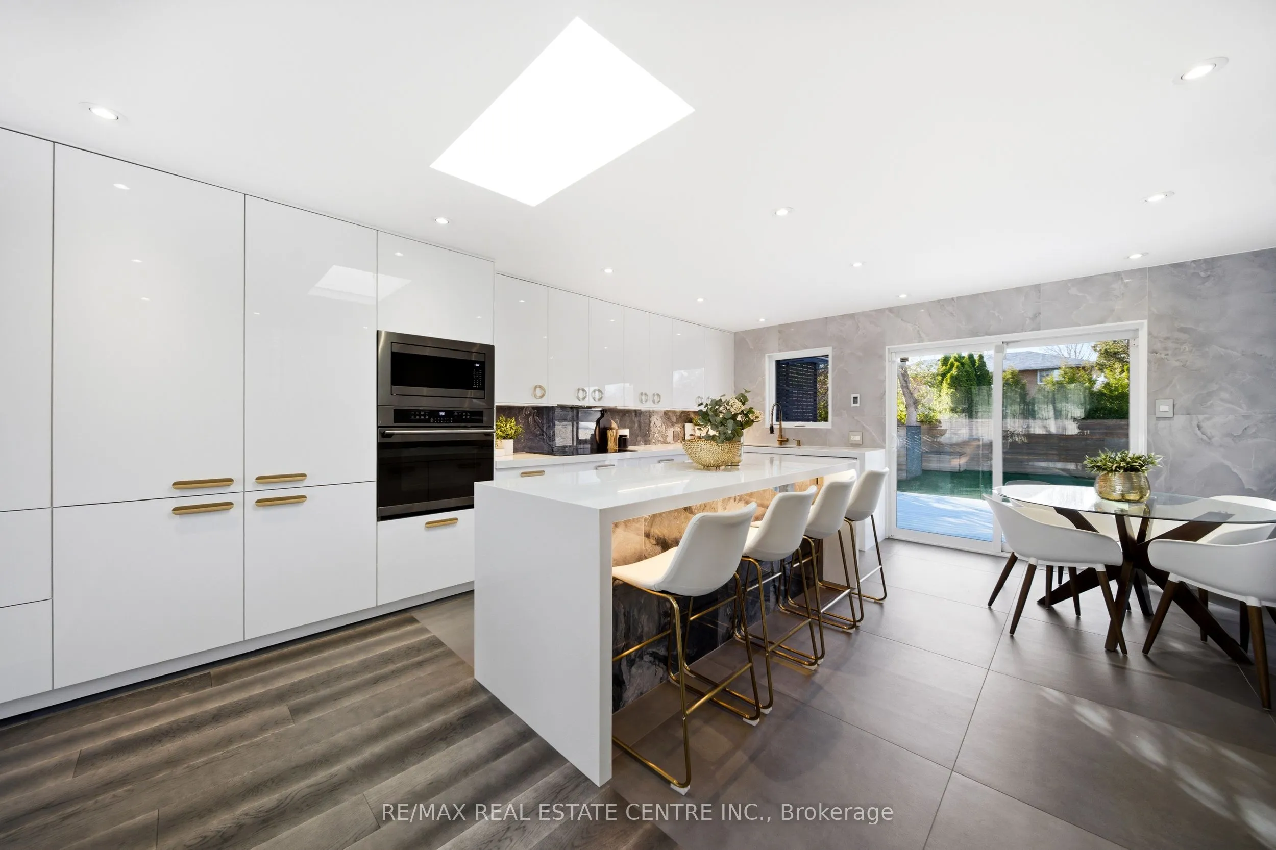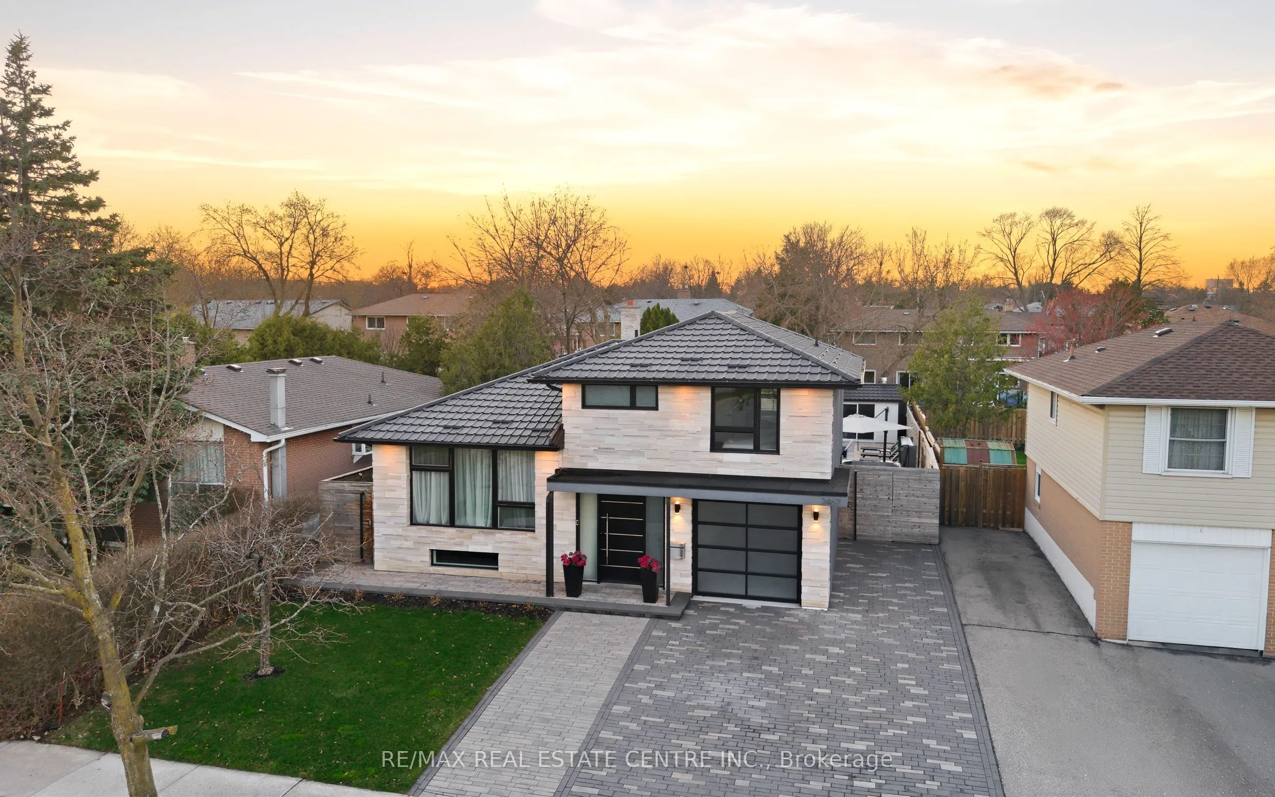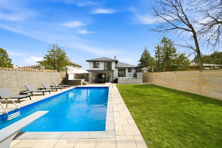 Spectacularly reimagined in the heart of Clarkson, this extensively renovated residence offers a rare blend of luxury, comfort, and thoughtful design with premium upgrades throughout. A spacious foyer welcomes you to a bright, open-concept layout featuring Italian tile and engineered hardwood flooring, potlights, and a skylight that fills the home with natural light. Heated floors in the foyer, kitchen, powder room, and upper bathroom add everyday comfort. The living room makes a bold statement with designer Versace wallpaper, custom built-ins, and a large picture window, flowing seamlessly into the show-stopping chef’s kitchen. Designed as the heart of the home, it features built-in appliances, an induction cooktop, double ovens, panelled fridge, waterfall island, stunning backsplash with water valve, organic waste disposal, water filtration system, and a sun-filled dinette. A contemporary staircase leads to four bedrooms with custom closets and beautifully updated bathrooms. The main bath is exquisitely remodelled with double vanities, a soaker tub, and sleek glass shower. The bright, finished lower level offers a cozy family room with gas fireplace and stone surround, a dedicated office, additional bathroom, and a beautifully designed laundry room. Outdoors, your WOWZA backyard awaits. Enjoy a professionally landscaped backyard with interlock stonework, patio, and deck with privacy awning. The fully renovated heated pool, hot tub, and covered ceiling with potlights create a true resort-style escape right at home. Additional highlights include a natural vein-cut travertine façade, metal roof with warranty, updated windows, sprinkler system, EV charger rough-in, and no rental equipment-offering peace of mind and turnkey convenience. Ideally located within walking distance to shops and the community centre, this home delivers upscale living in a sought-after neighbourhood.
