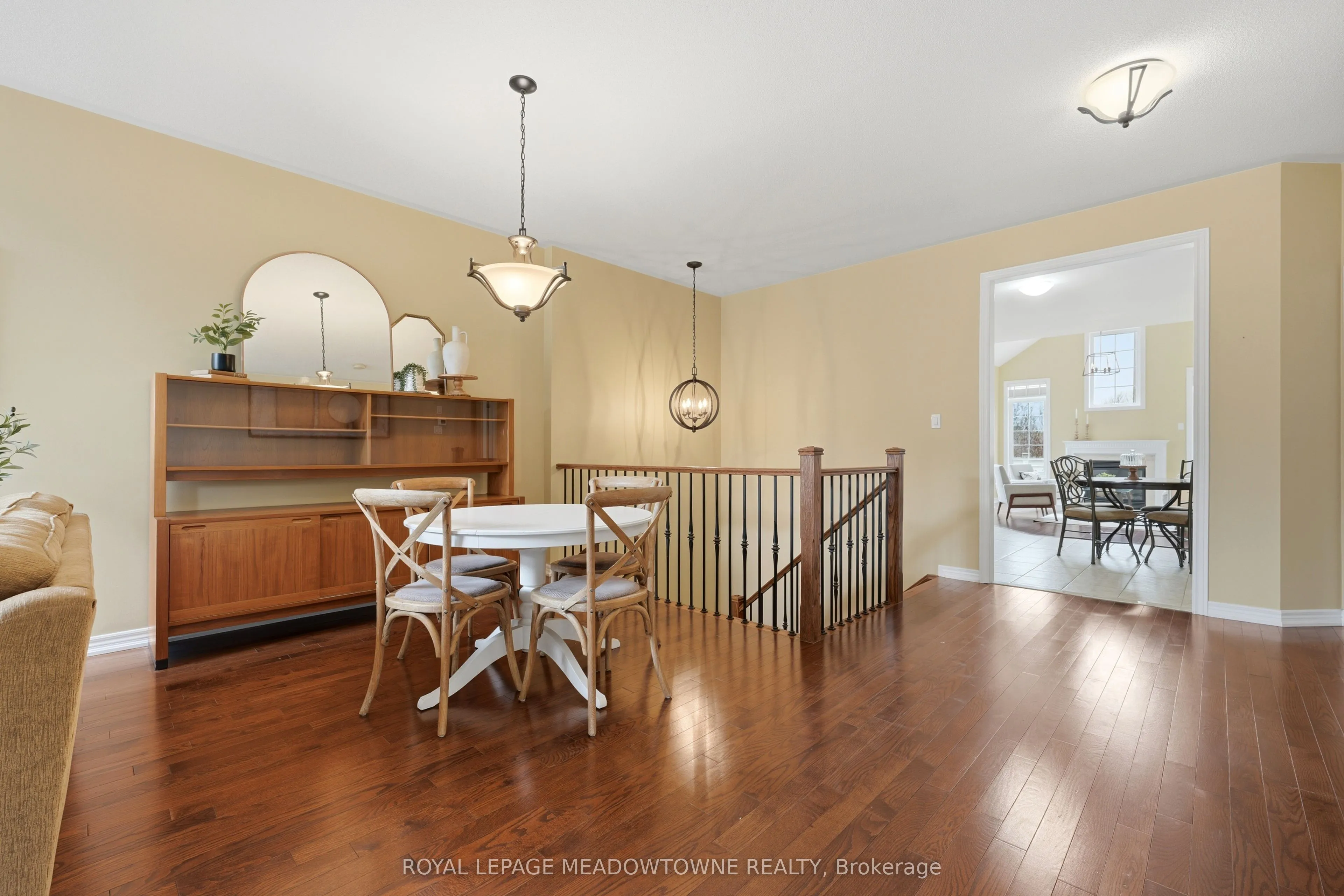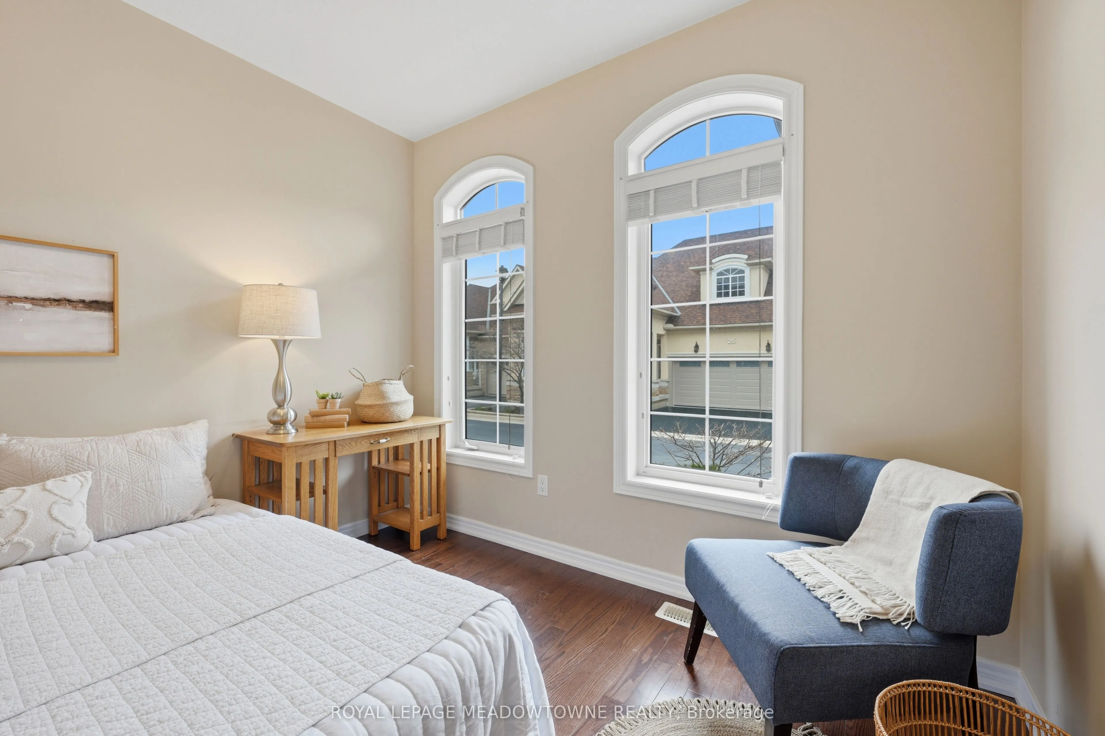 Beautiful 2-bedroom, 2-bathroom bungalow with low-maintenance living with parking for 2 cars (1 garage & 1 on upgraded rubber driveway). The home features gleaming hardwood flooring throughout, tile in the eat-in kitchen, & impressive 9-foot ceilings that enhance the bright, open feel. The front entrance with closet leads into the formal living & dining room at the front of the home, highlighted by hardwood flooring and a large feature window allowing natural light to pour in. The eat-in kitchen offers excellent flow with a centre sit-up island overlooking the breakfast area and family room. Features include quartz countertops, stainless steel appliances, double sink, and ample cabinetry including pantry. The family room is warm and inviting with a cathedral ceiling, gas fireplace, and four windows that brighten the space. A walk-out from the kitchen leads to the backyard. Off the kitchen is the mudroom & laundry space that provides tile flooring, access to the garage, large double closet & an additional walk-out to the backyard. The spacious primary suite features a tray ceiling, walk-in closet, large window, & 5pc ensuite with deep soaker tub including a handheld shower head, 2 sinks, and separate glassed shower. The second bedroom is generously sized with two arched windows & closet space. Hardwood stairs lead to the unfinished basement, offering great potential to create additional living space with the high ceiling height, open space and rough-in for an additional bathroom. Enjoy easy maintenance with turf in both the front & backyard, plus a private deck space to relax outdoors. Some notable features include; Shingles (2020), Furnace (2021), AC (2021), Rubber Driveway, Turf Landscaping, Hardwood Flooring, and Whirlpool stainless steel appliances. Conveniently located within walking distance to grocery stores, restaurants, shopping, church, parks & more. Common Elements fee of $155/Mth For Snow Removal, Garbage Pickup, Common Elements Maintenance.