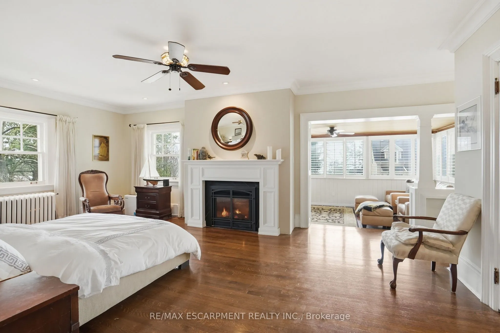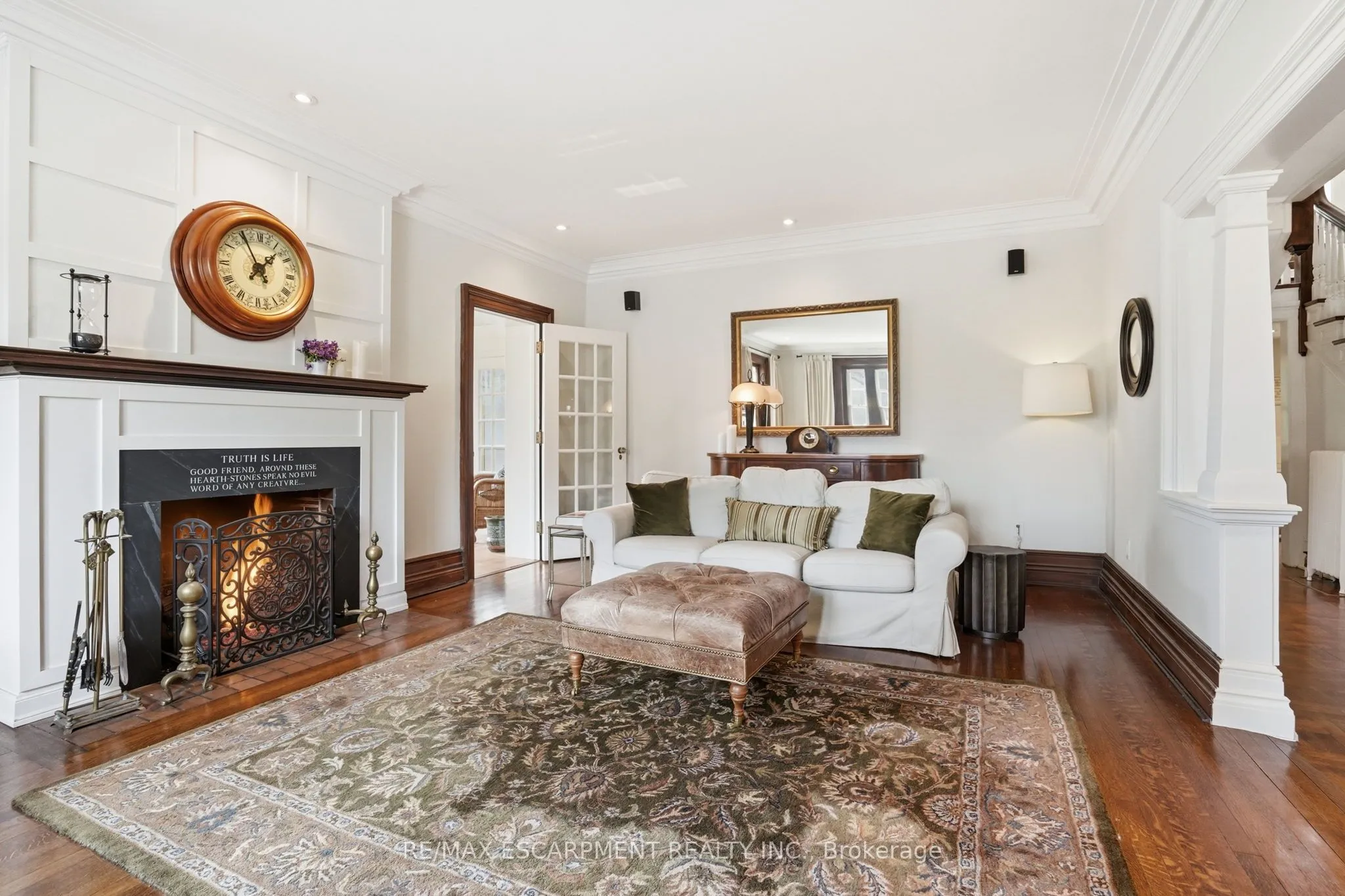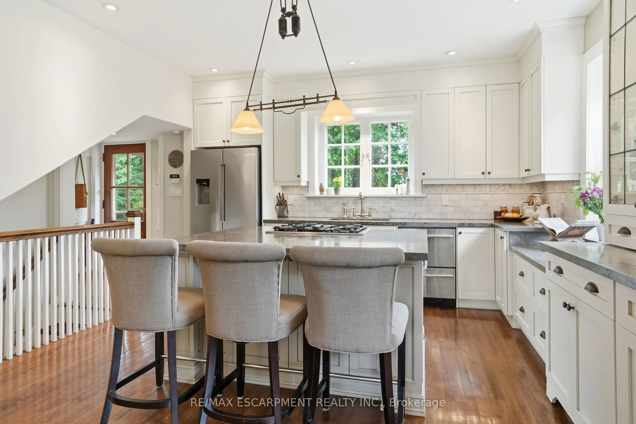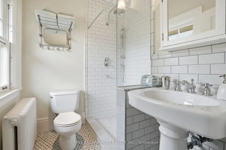 Set in the heart of Old Oakville on a generous, tree-lined lot, this distinguished red brick residence blends timeless architecture with thoughtful modern updates. Featuring 3+1 bedrooms and 5 bathrooms, each upper bedroom offers its own private ensuite, delivering a rare level of comfort and privacy. The main level is defined by rich character and natural flow, with original wood detailing, oak hardwood flooring, and a gradual-rise staircase anchoring the space. The living room is both refined and inviting, centered around a gas fireplace with custom paneling, while the formal dining room provides an elegant setting for entertaining. At the heart of the home, the kitchen features Blue Lagos soapstone countertops, custom cabinetry, a large island with integrated cooktop, and dual dishwashers. A built-in wet bar enhances functionality, while large windows connect the space to the surrounding greenery. A standout feature is the carriage house-inspired bar area with original doors offering a unique blend of heritage charm and everyday use. A sunroom with terracotta tile flooring provides a bright, relaxed retreat with direct access to the outdoors. The finished lower level extends the living space with a recreation room featuring a second gas fireplace, additional living areas, a bedroom, full bathroom, and dedicated wine display. Complete with a detached two-car garage, mature landscaping, and located just steps to the shops, restaurants, and waterfront of Old Oakville, this is a rare opportunity to own a character home in one of the area’s most sought-after neighbourhoods. Luxury Certified.